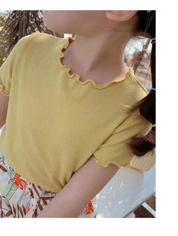 새로운 한국 스타일 여아 아이스 실크 반팔 티셔츠 유아 여름복 아동용 모든 경기 스트라이프 웨스턴 스타일 우드 이어 탑