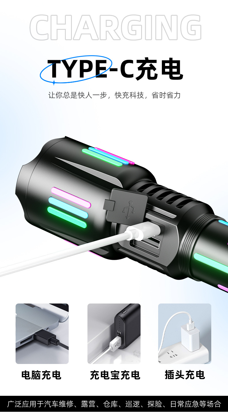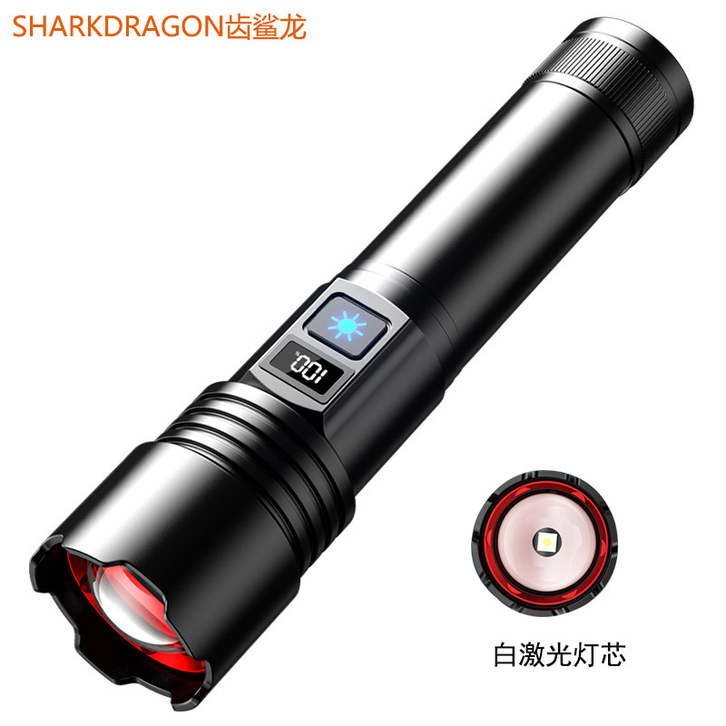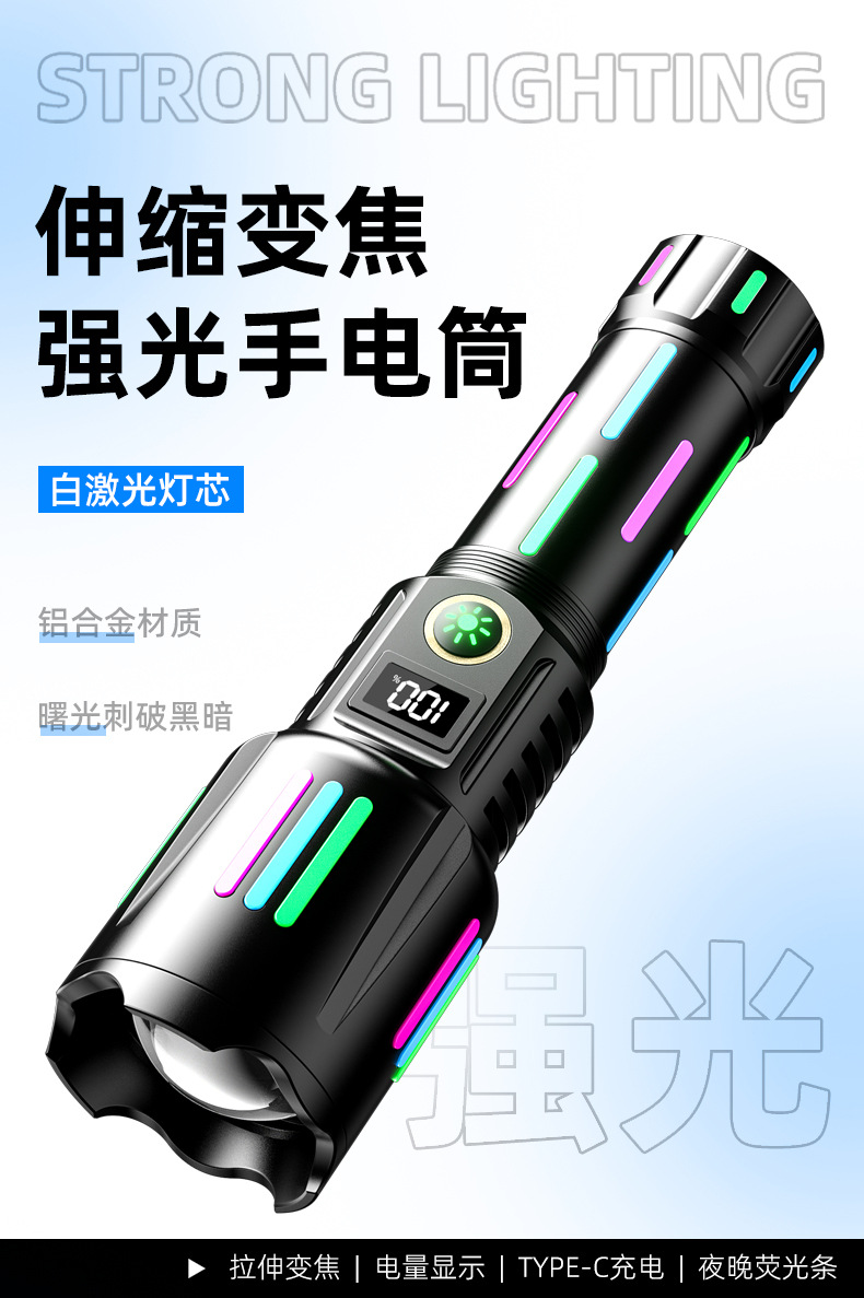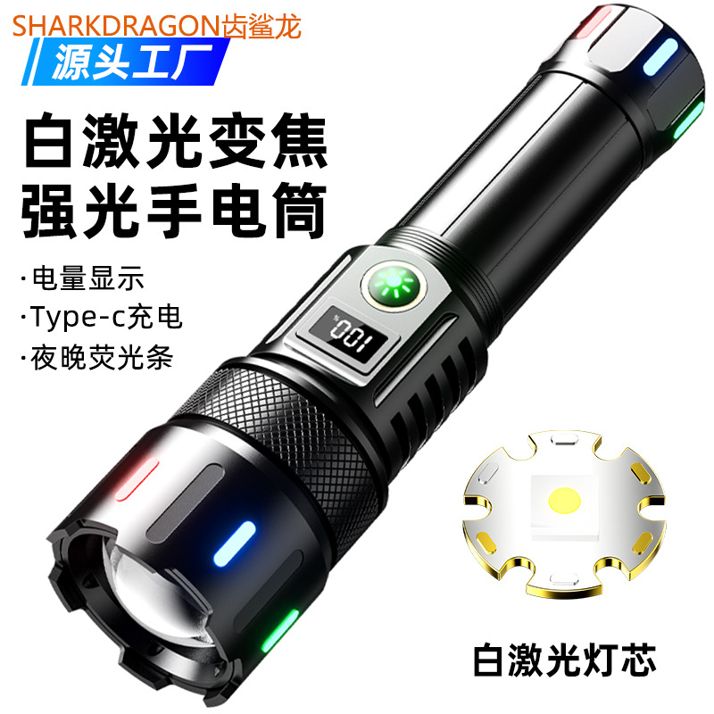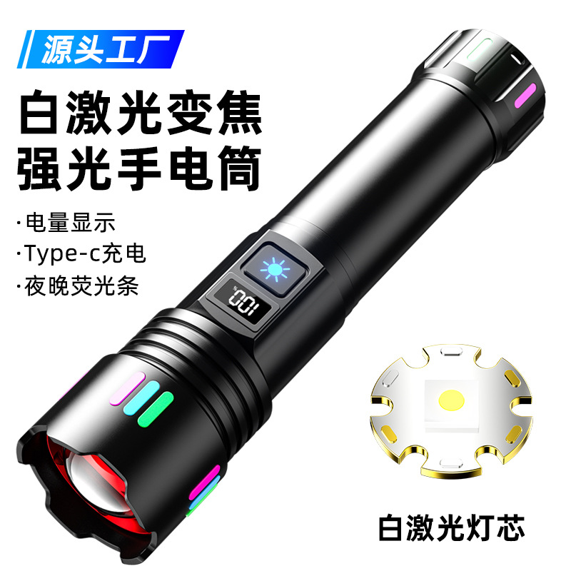 국경 간 흰색 레이저 손전등 유형-C 충전 야외 줌 디지털 형광 스트립 LED 손전등스토어 가기