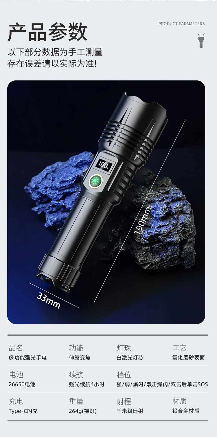 • 501 화이트 레이저 손전등 + Type-C 데이터 라인 + 26650 배터리 + 컬러 박스