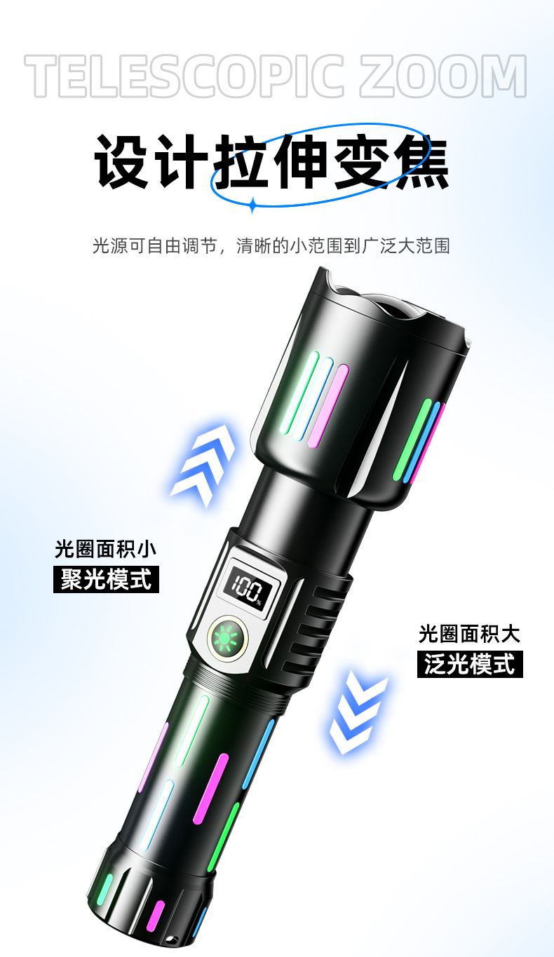 국경 간 흰색 레이저 손전등 유형-C 충전 야외 줌 디지털 형광 스트립 LED 손전등