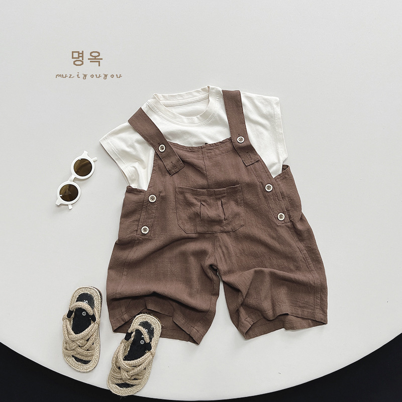 韩系风~儿童抖抖背带裤夏季亚麻棉男女宝宝七分裤韩版森系阔腿裤