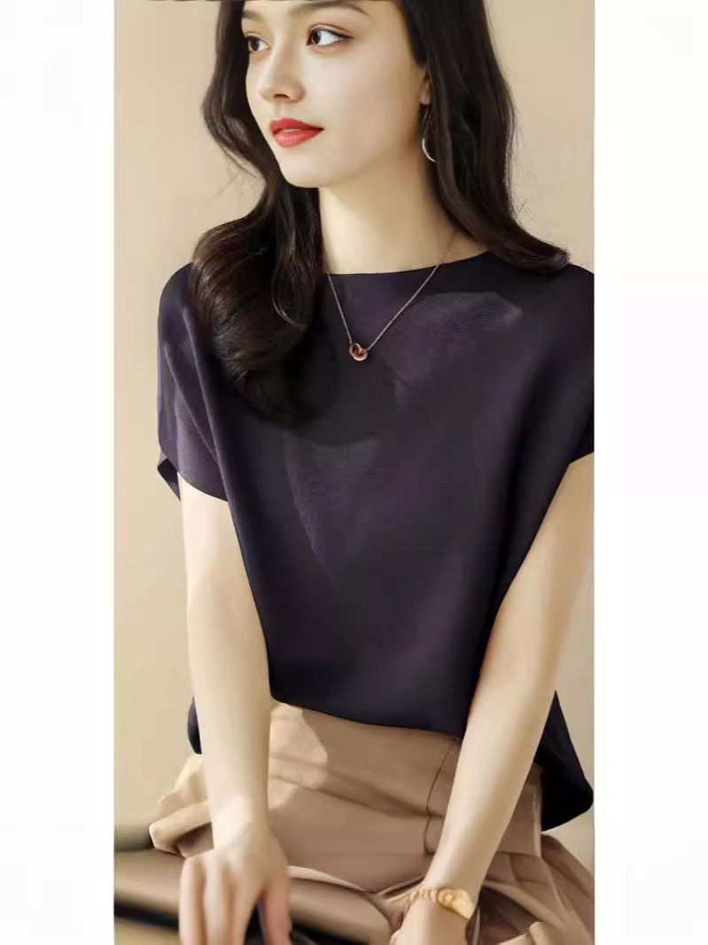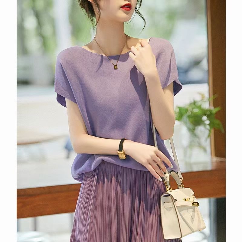 2024년 여름 신상 무지 리오셀 텐셀 니트 여성 티셔츠 루즈핏 오프숄더 박쥐소매 여성 상의