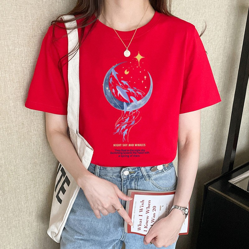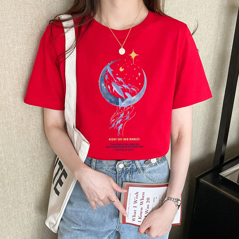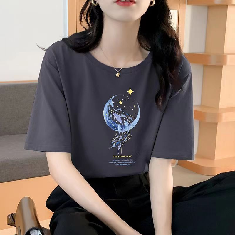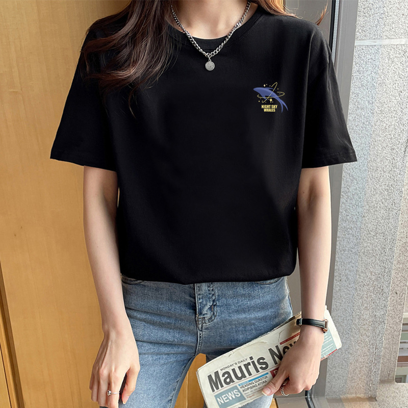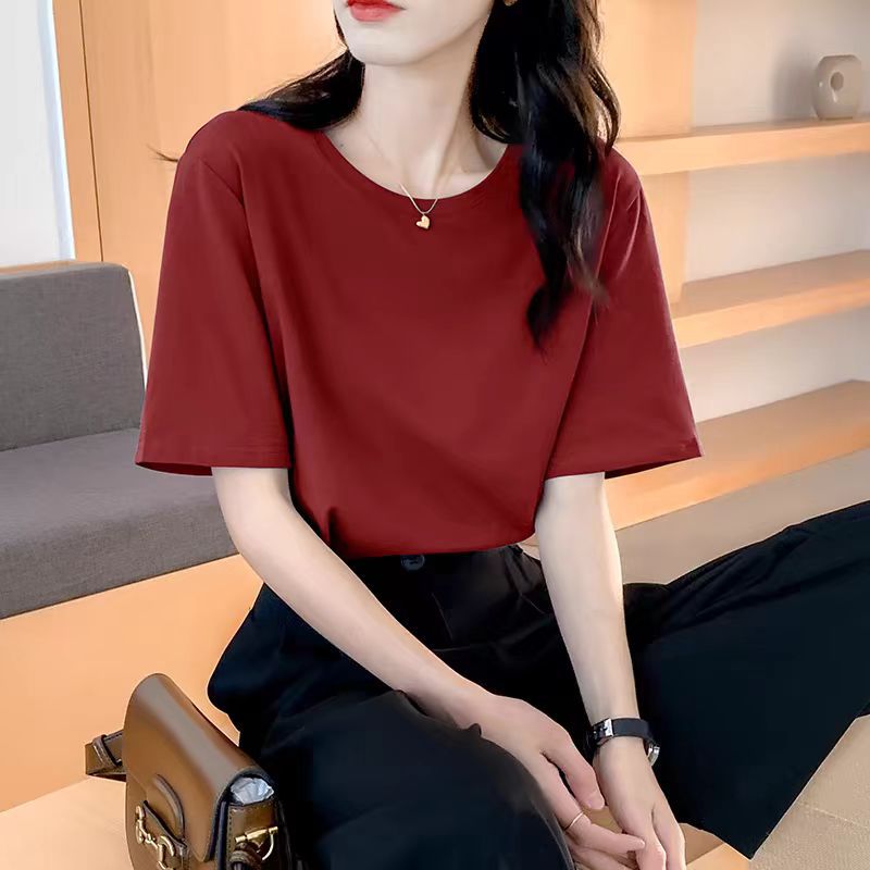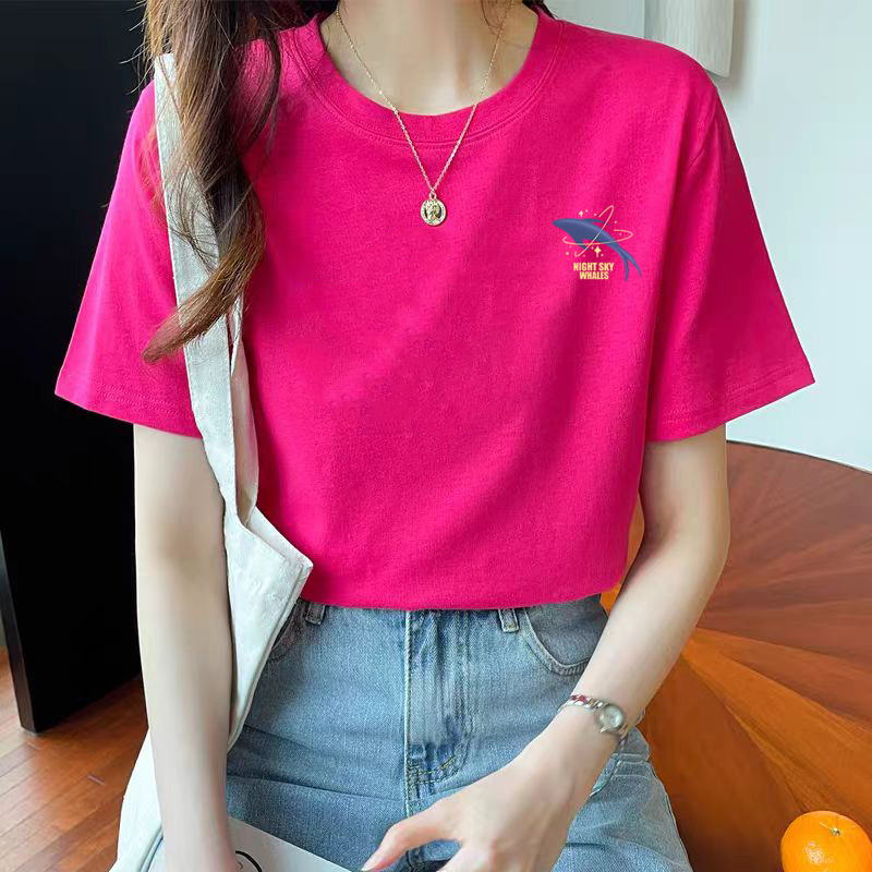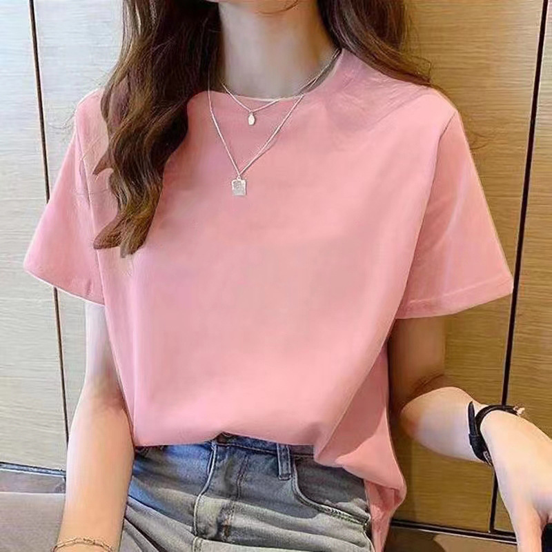 여성용 루즈한 순면 반팔 티셔츠 여름 새 스타일 이너 탑 오른쪽 어깨 디자인 스웨트 셔츠 여성용 라운드 넥 봄, 가을스토어 가기