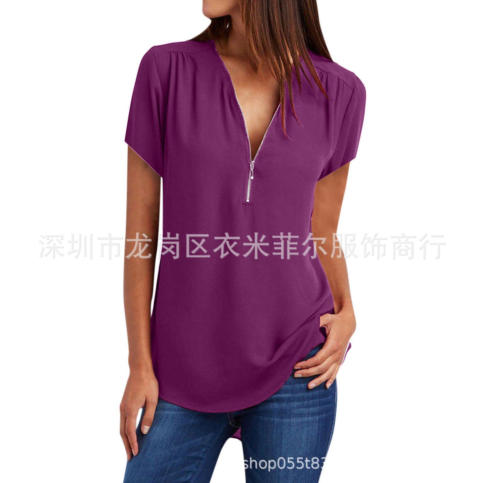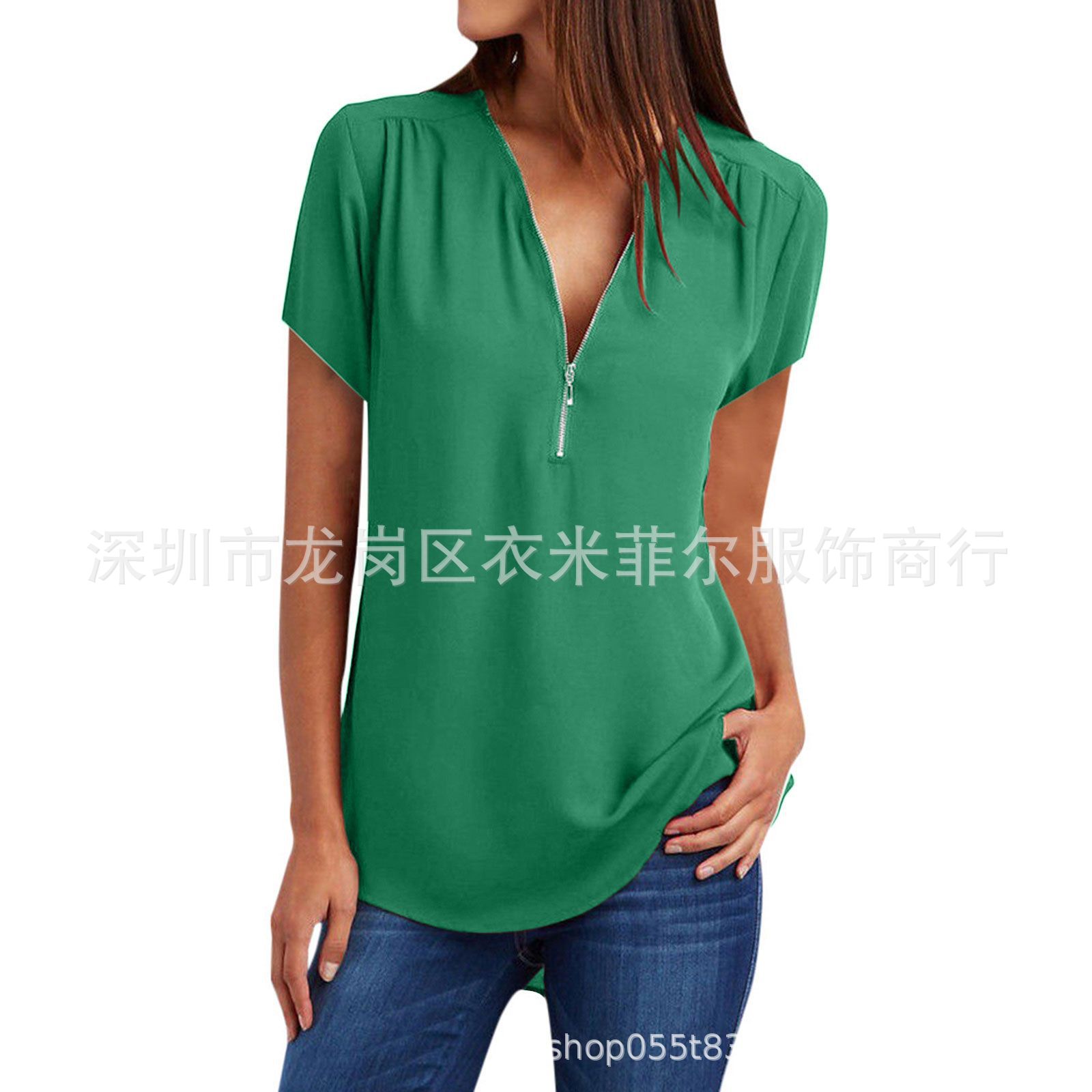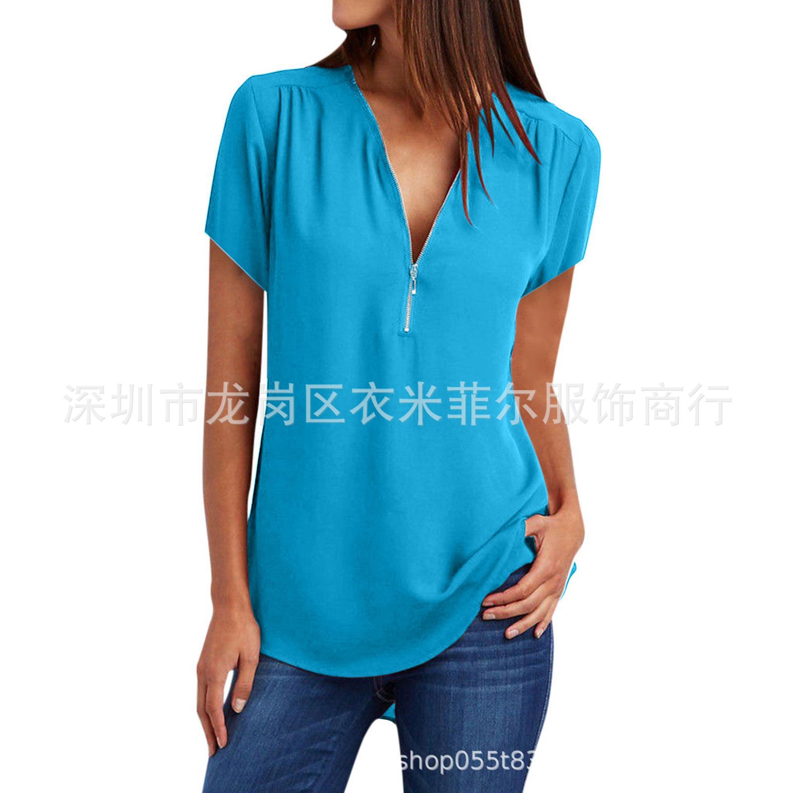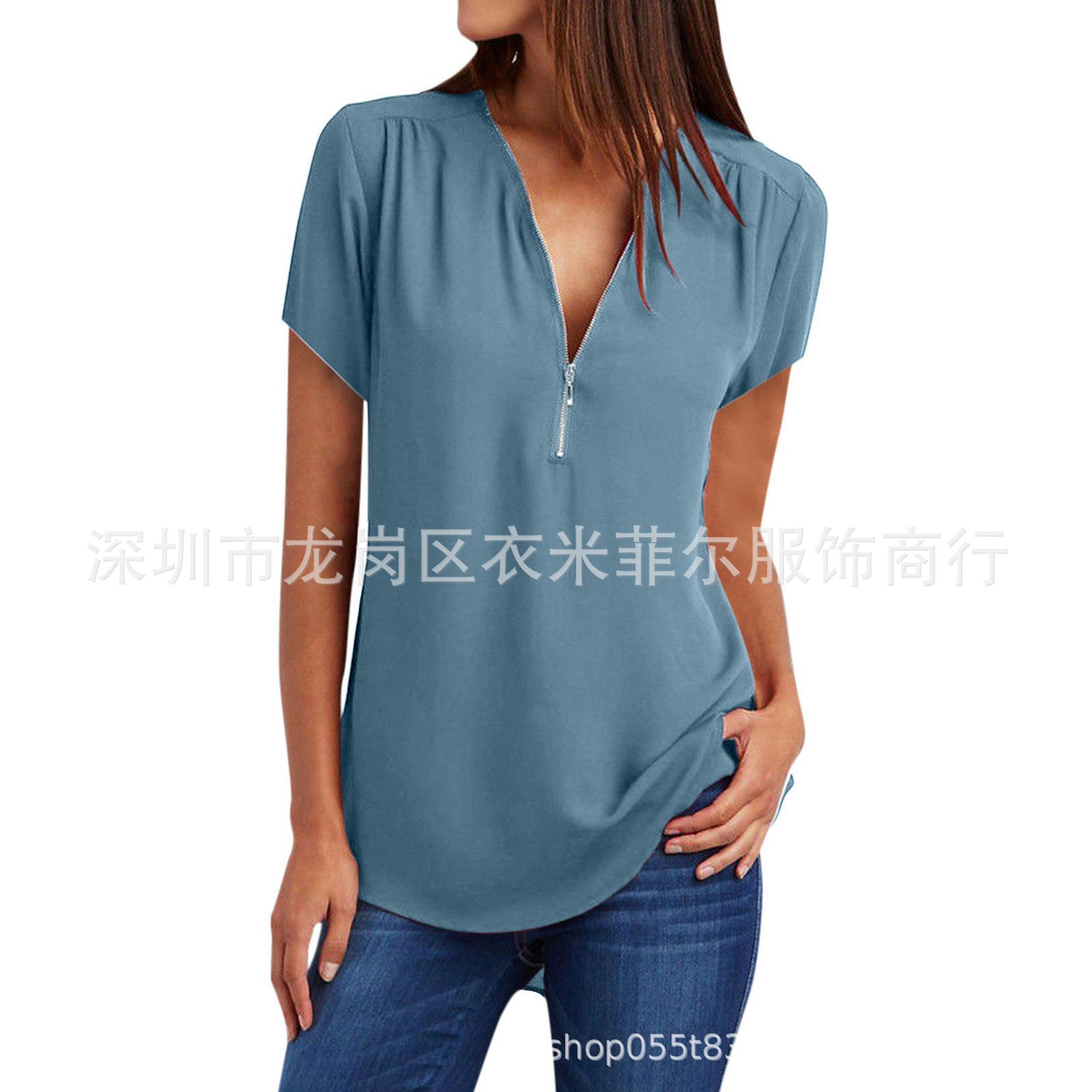 2023 AliExpress 아마존 폭발 여성 V-Neck 지퍼 느슨한 쉬폰 셔츠 짧은 소매 탑스토어 가기