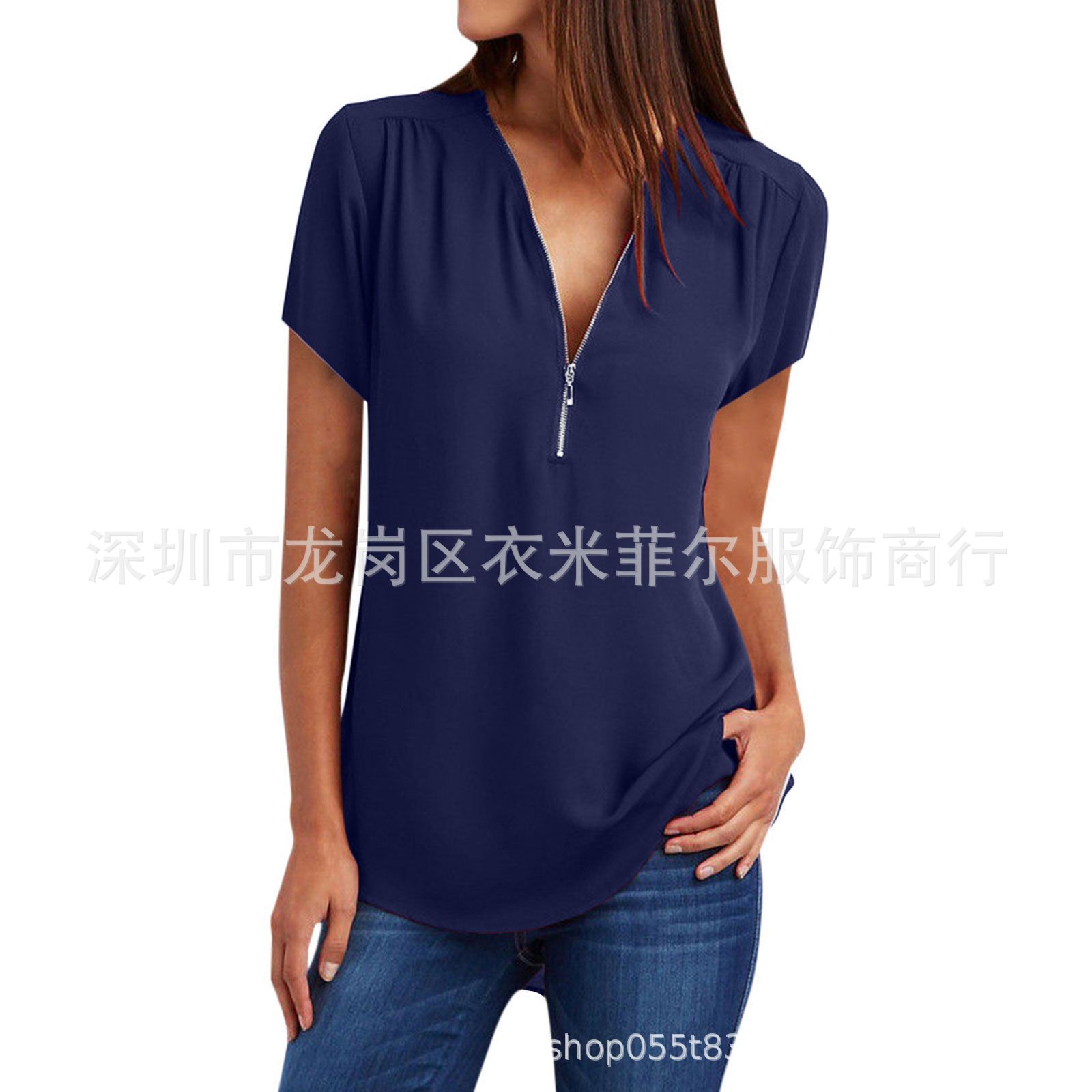 2023 AliExpress 아마존 폭발 여성 V-Neck 지퍼 느슨한 쉬폰 셔츠 짧은 소매 탑