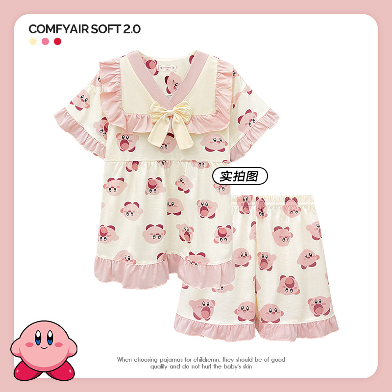 새로운 어린이 잠옷 소녀 여름 반팔 면 인형 칼라 중간 및 큰 어린이 만화 중간 및 큰 어린이 가정 옷 세트