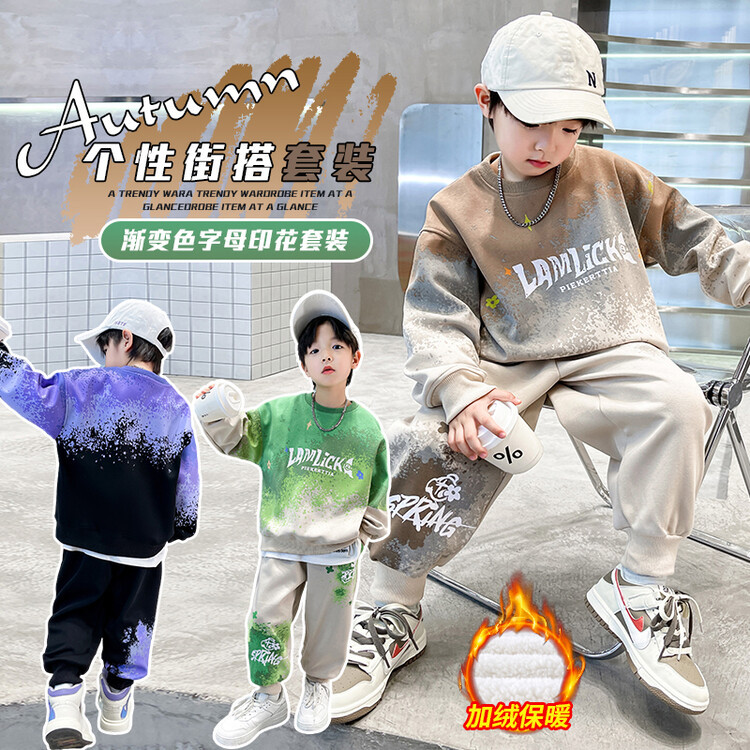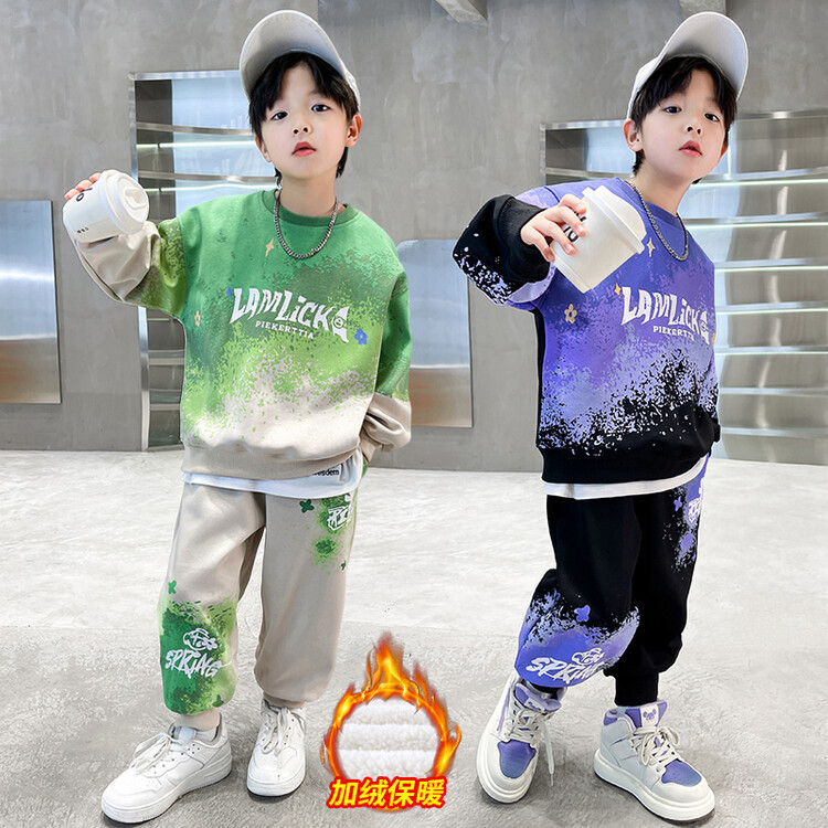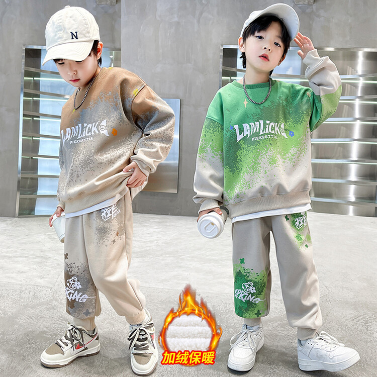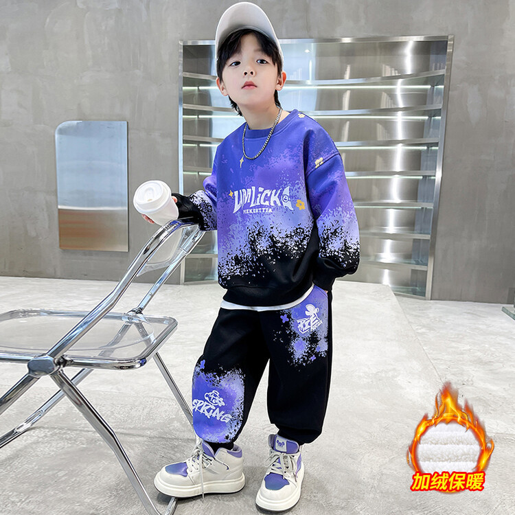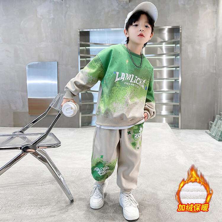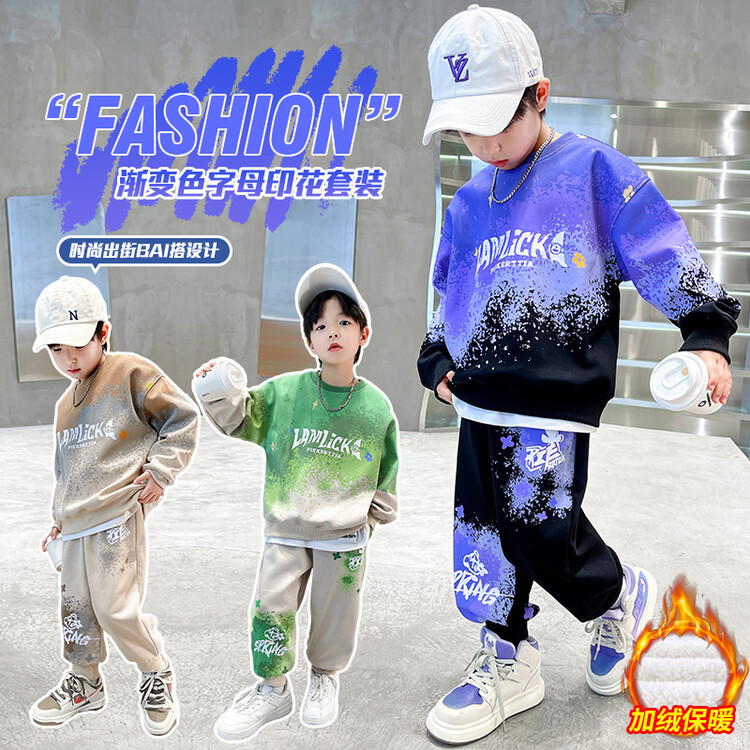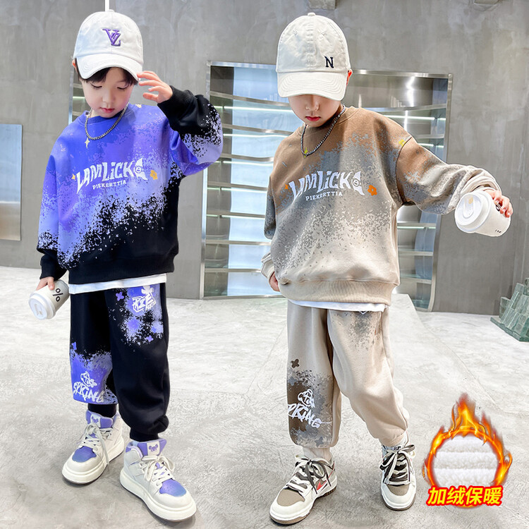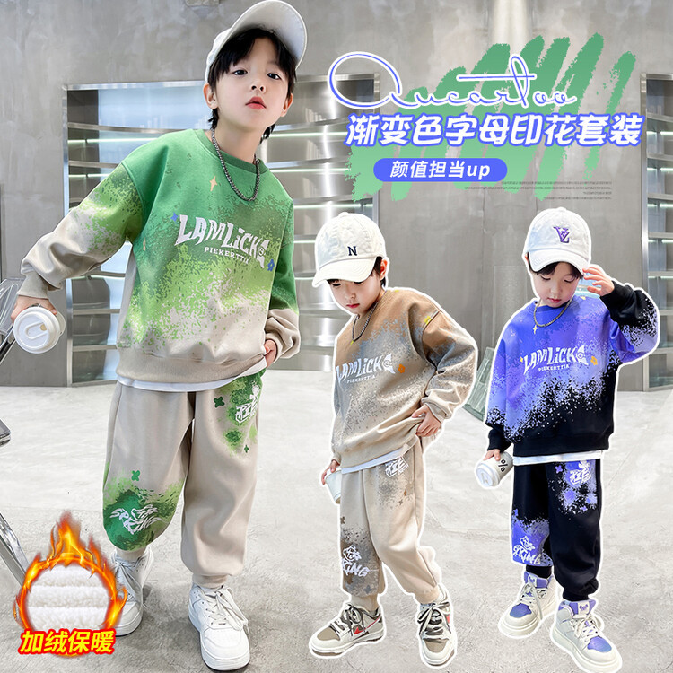 소년의 대외 무역 겨울 2024 새로운 어린이 외국 스타일의 기모 패딩 따뜻한 그라디언트 컬러 프린트 스웨터 투피스 세트스토어 가기