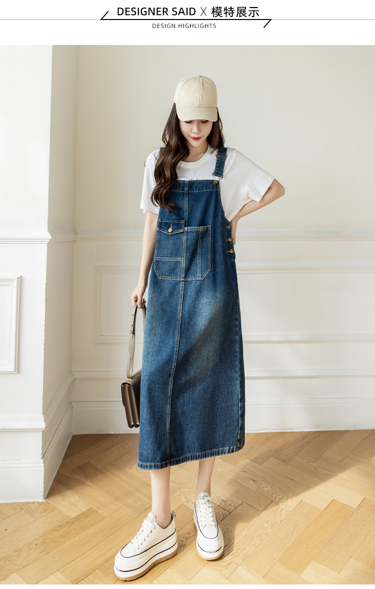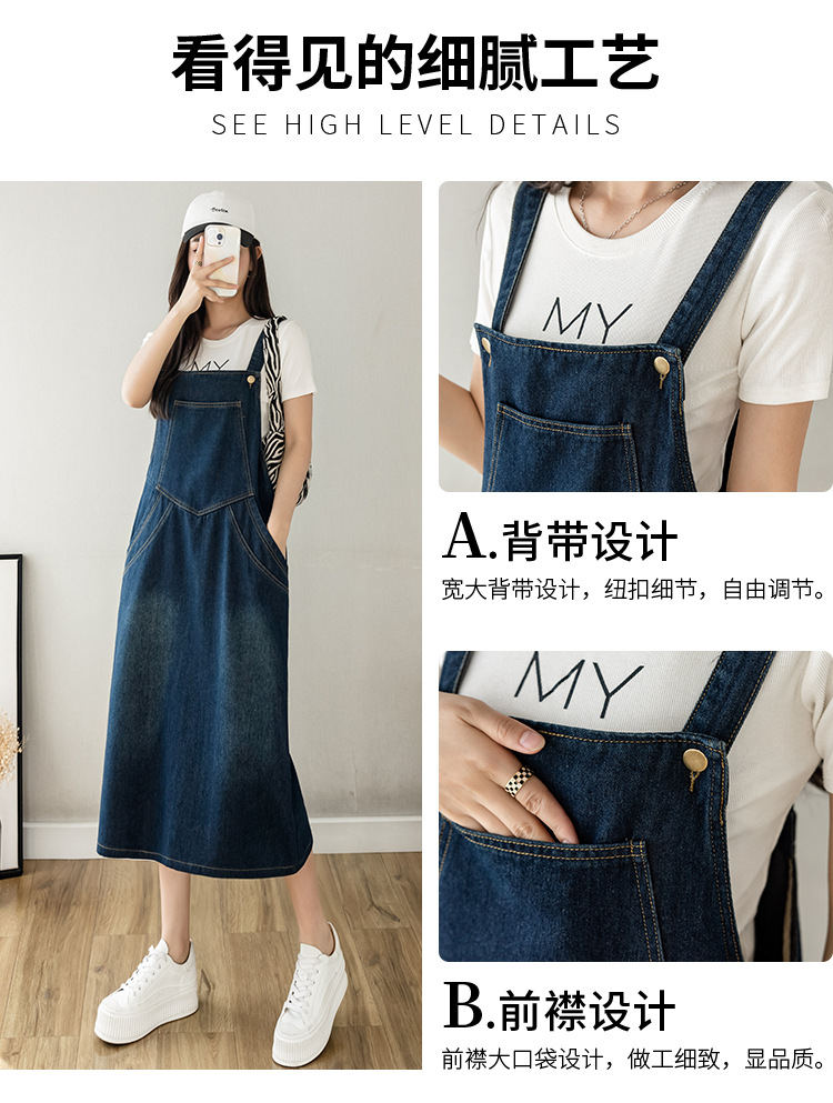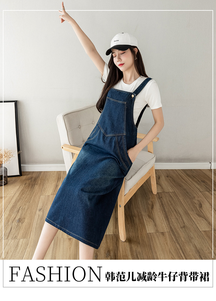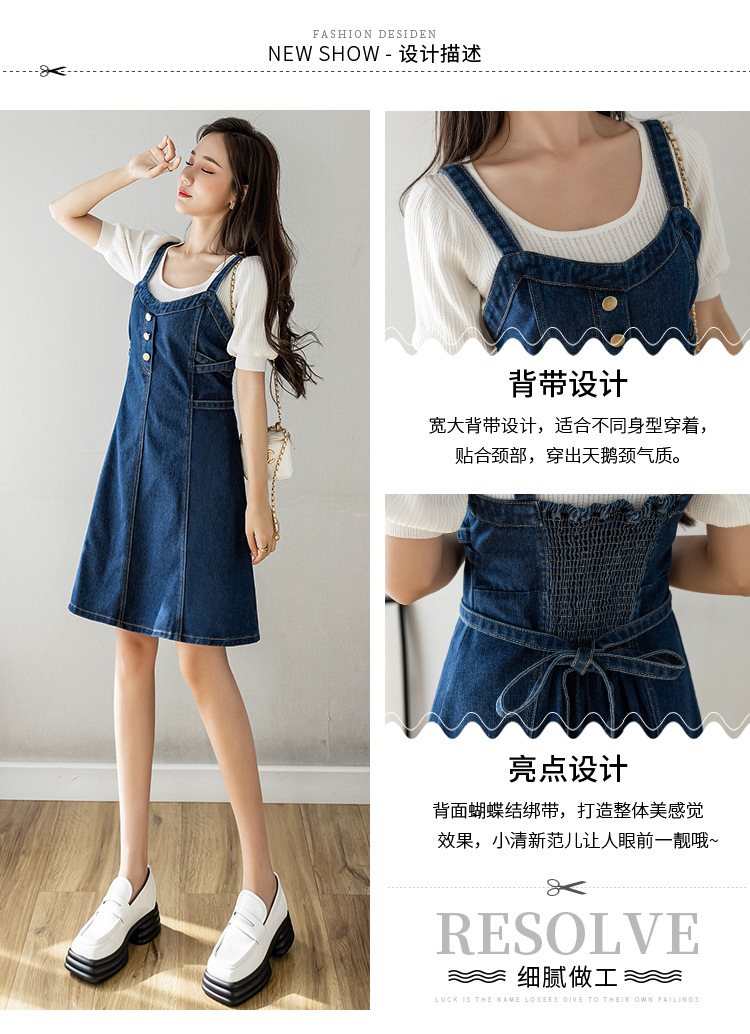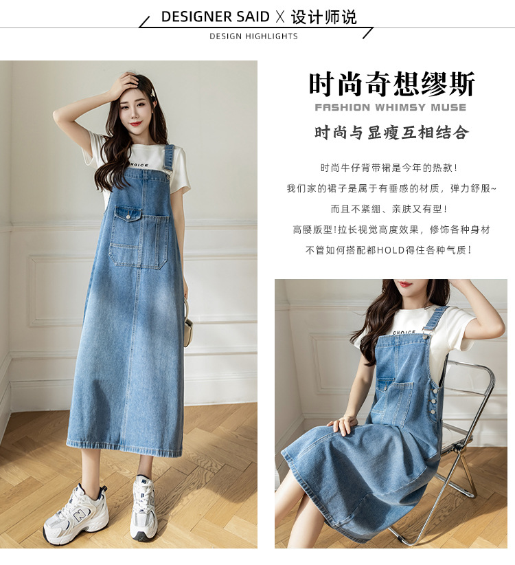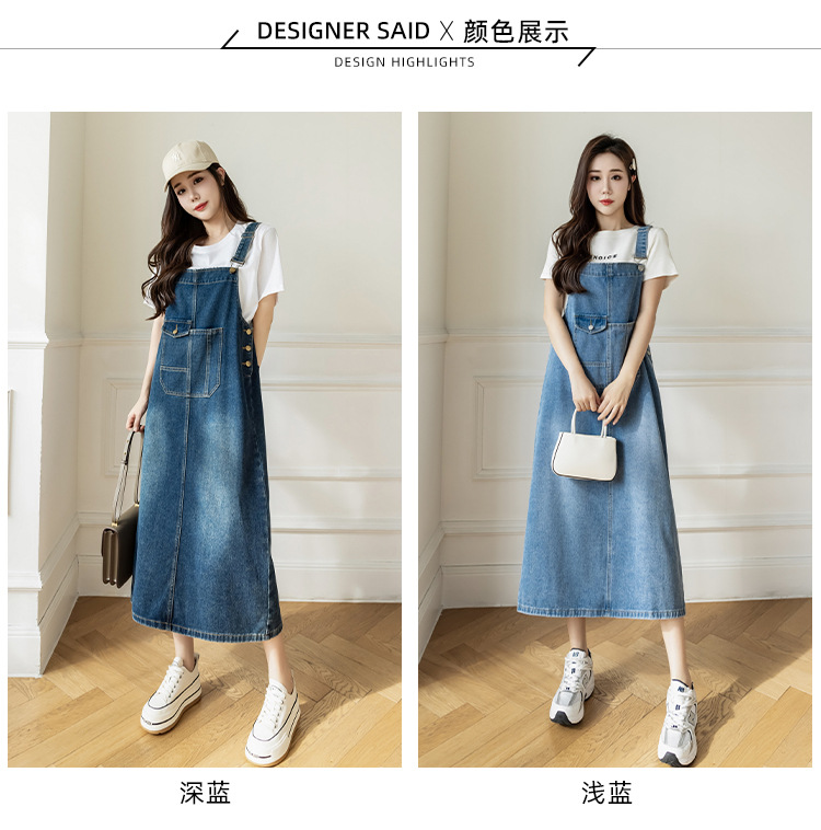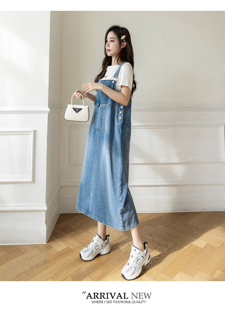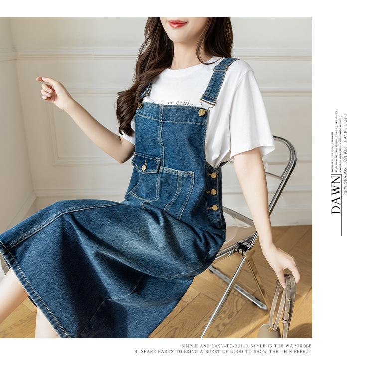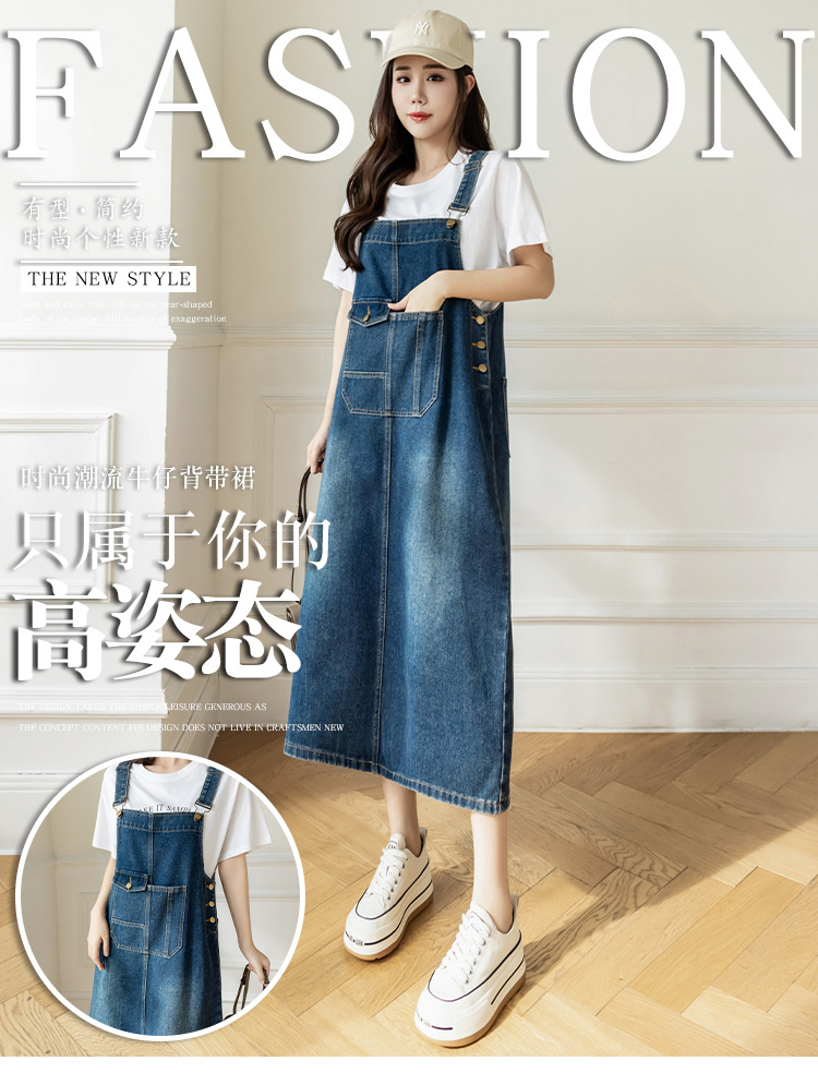 리얼 샷 느슨한 캐주얼 모든 경기 데님 스트랩 원피스 중간 길이 슬림 핏 원피스 여성스토어 가기