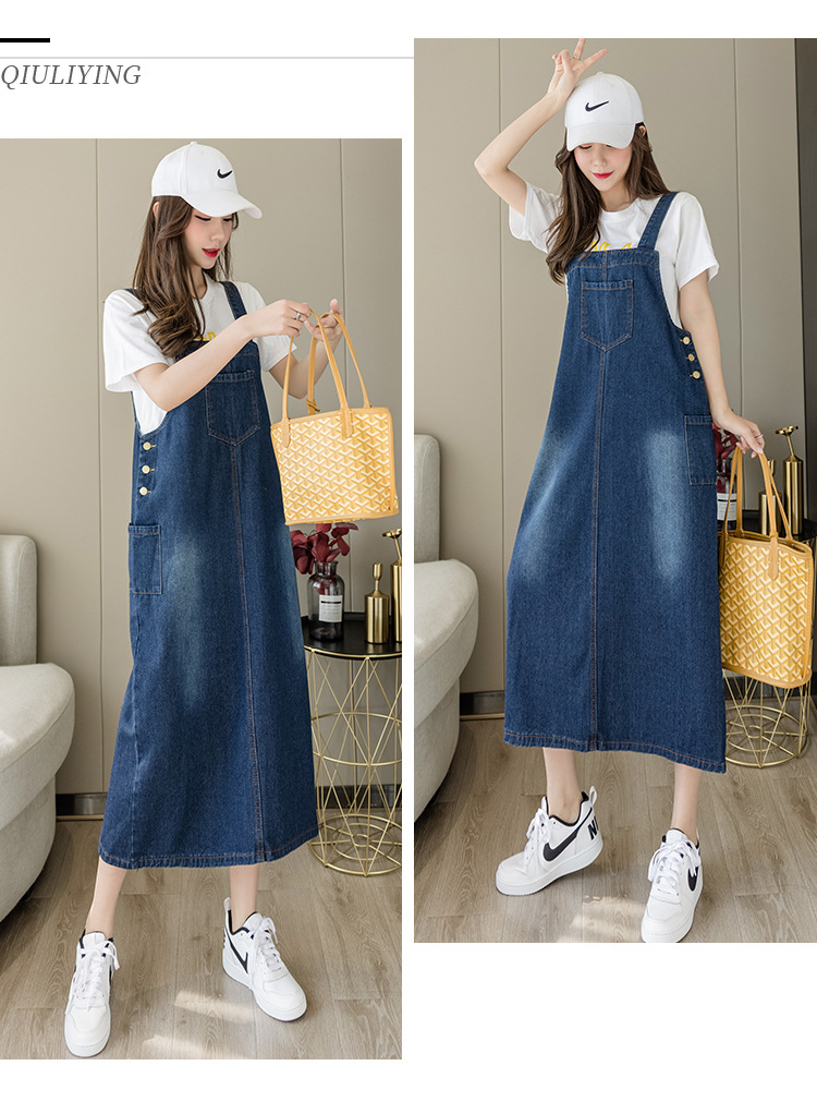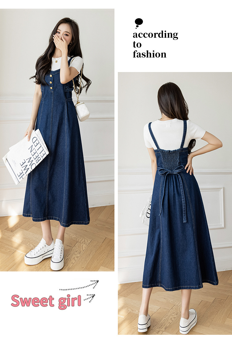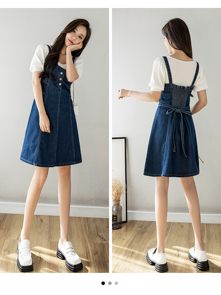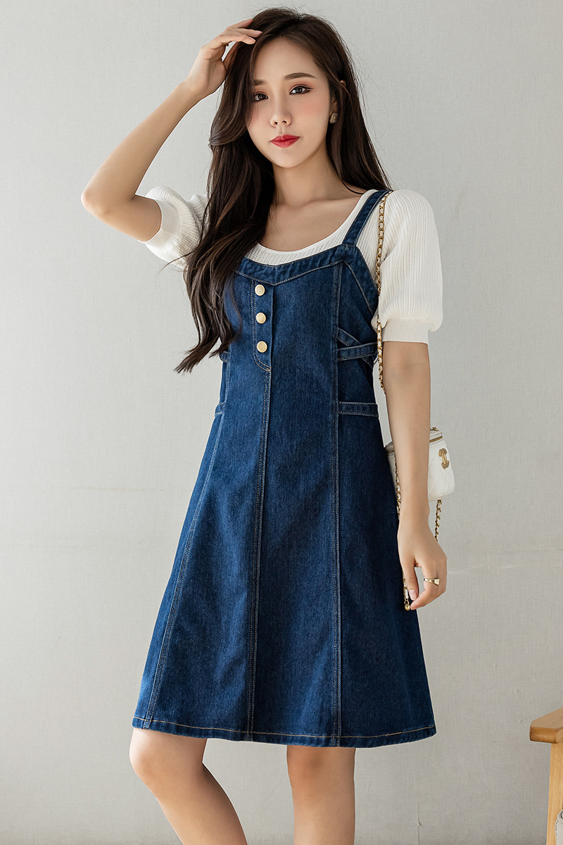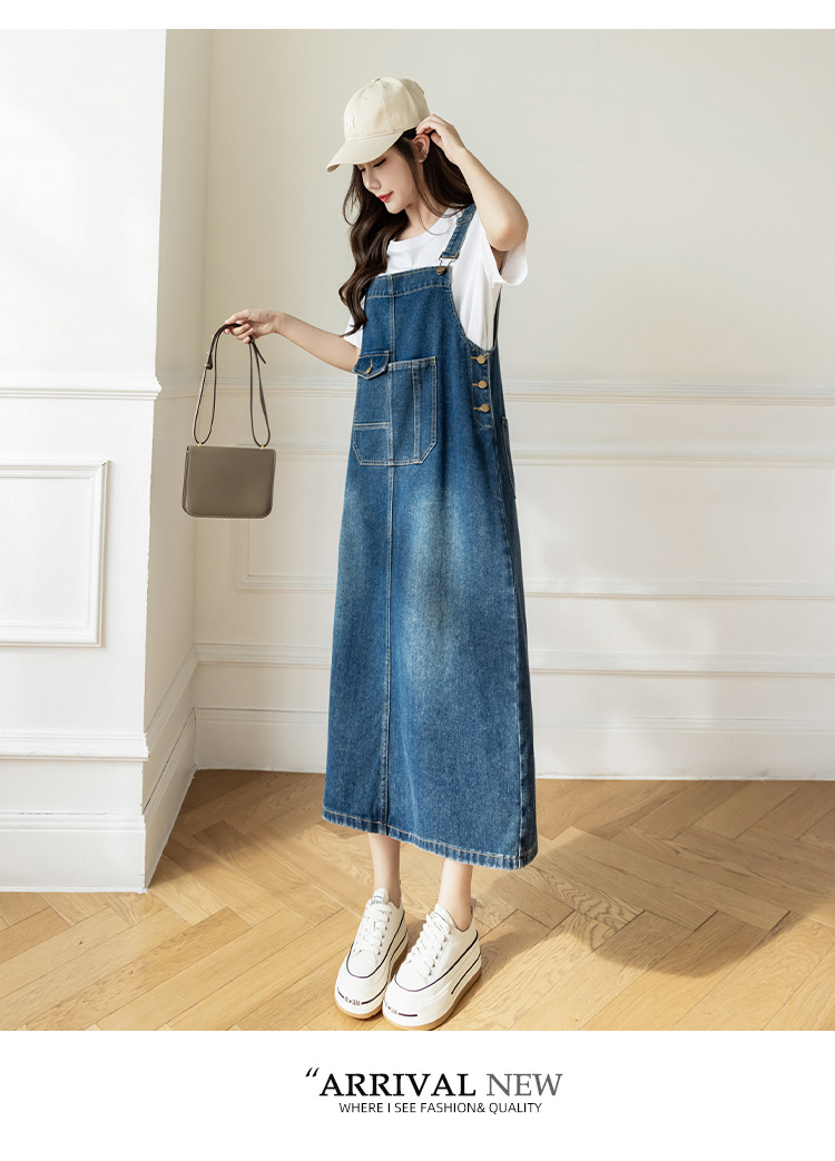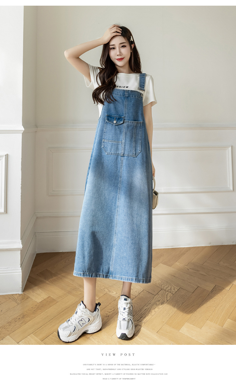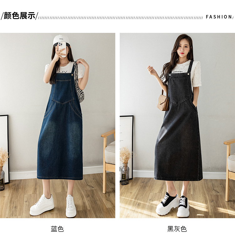 리얼 샷 느슨한 캐주얼 모든 경기 데님 스트랩 원피스 중간 길이 슬림 핏 원피스 여성스토어 가기