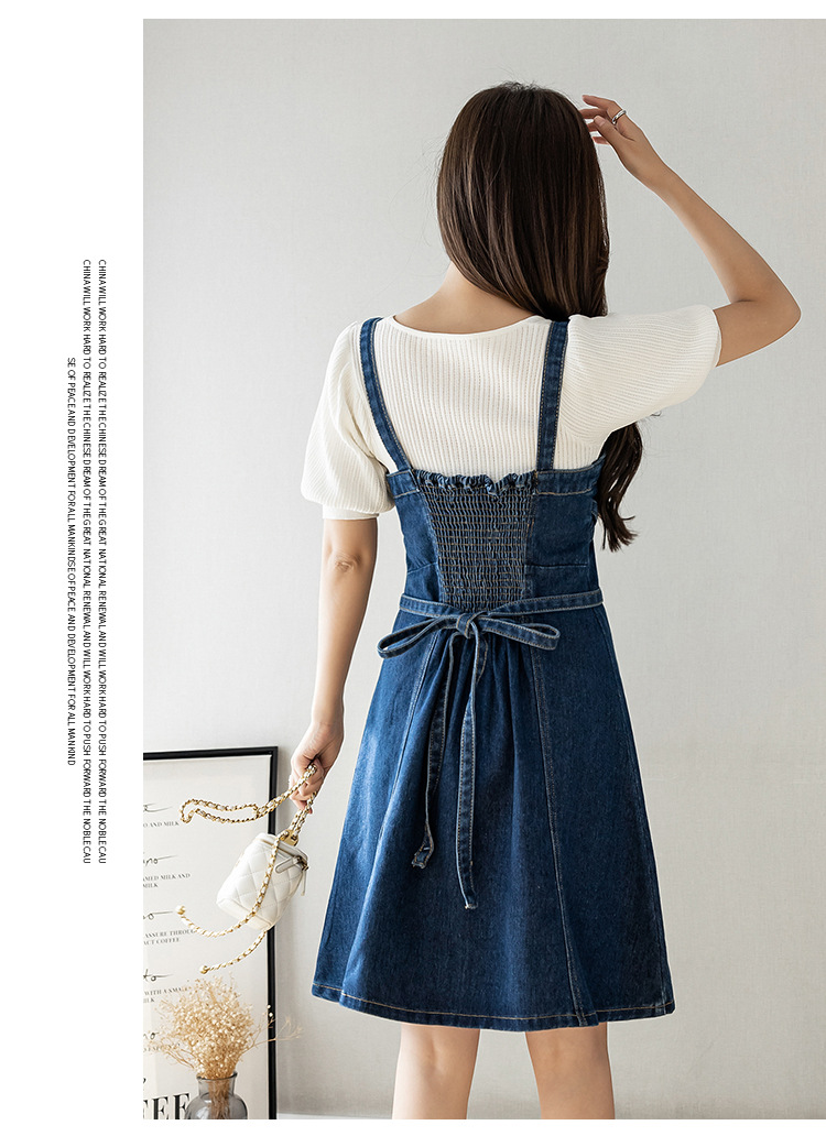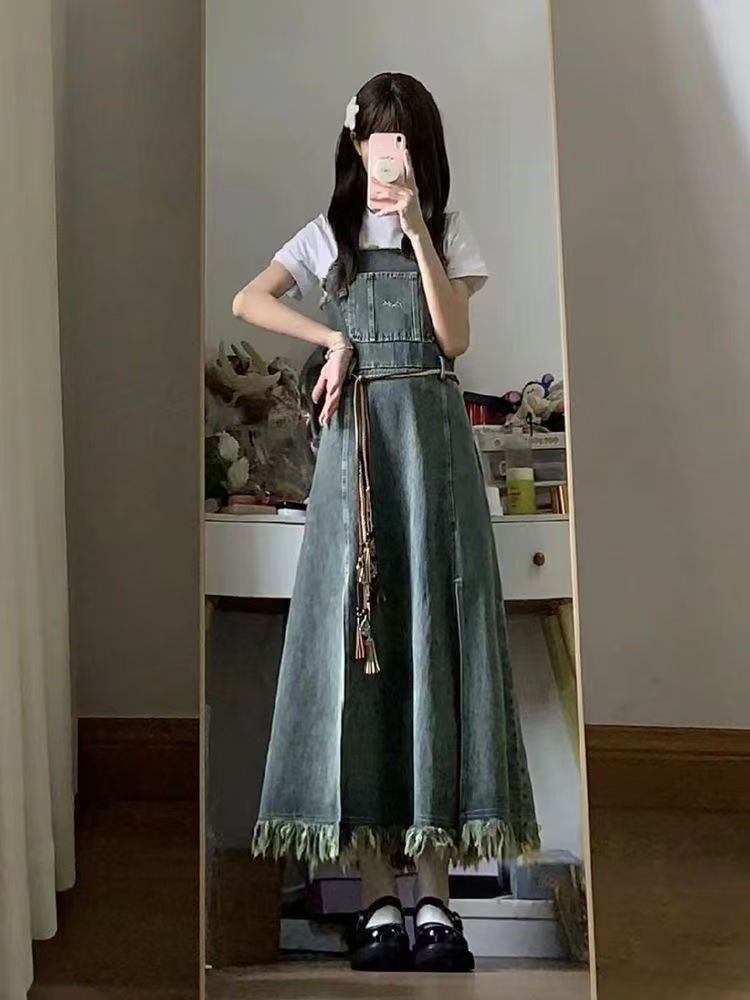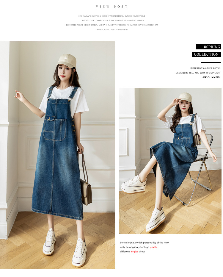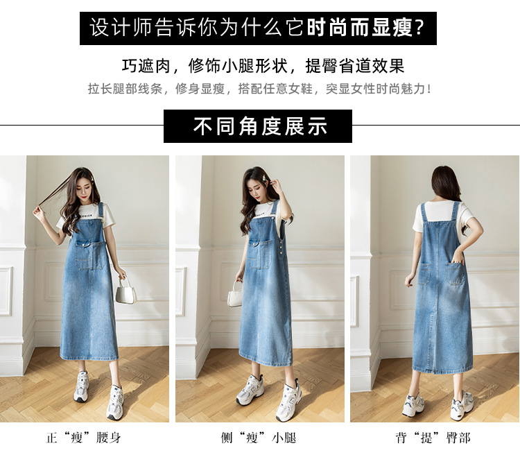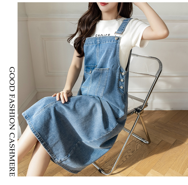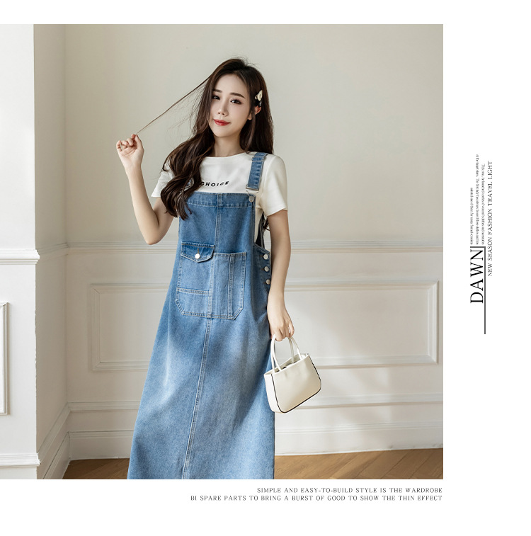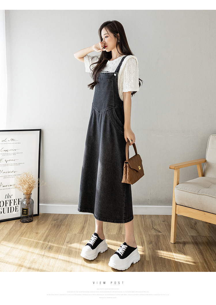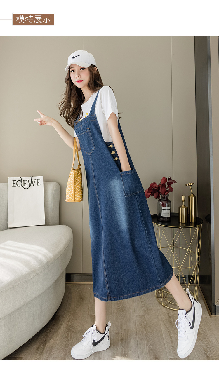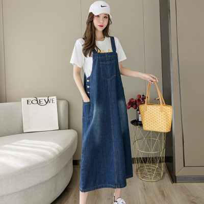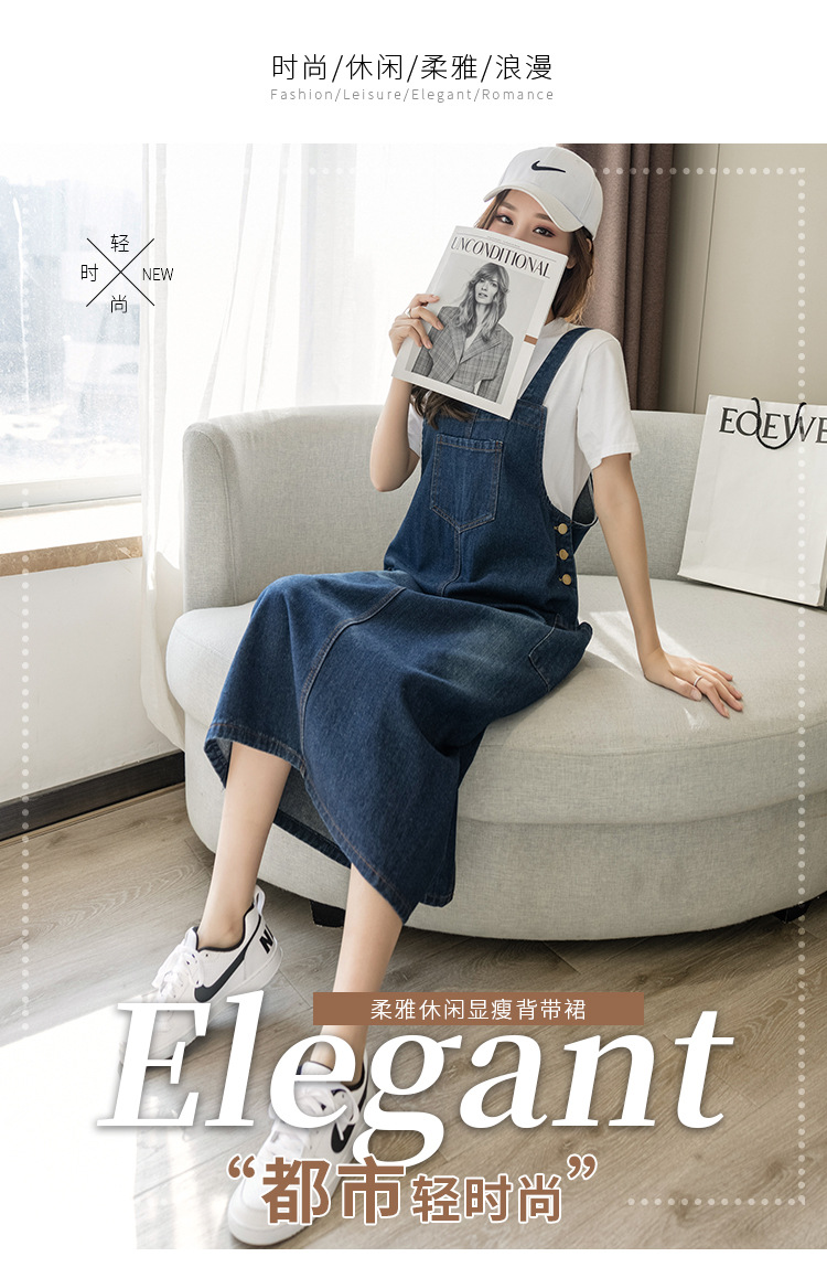 리얼 샷 느슨한 캐주얼 모든 경기 데님 스트랩 원피스 중간 길이 슬림 핏 원피스 여성스토어 가기