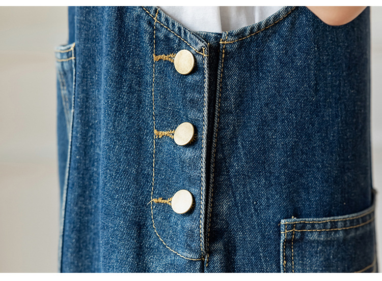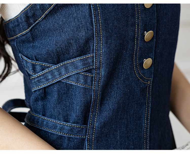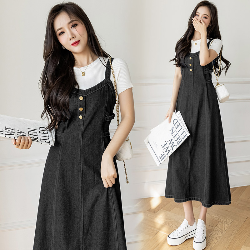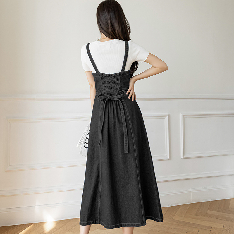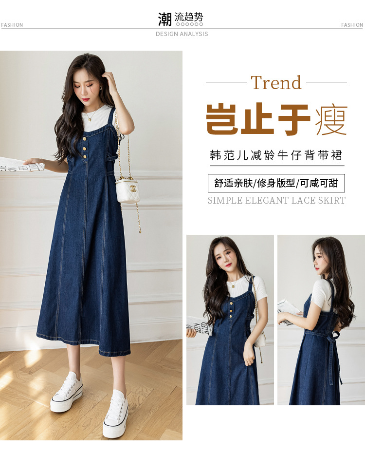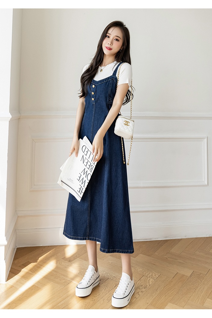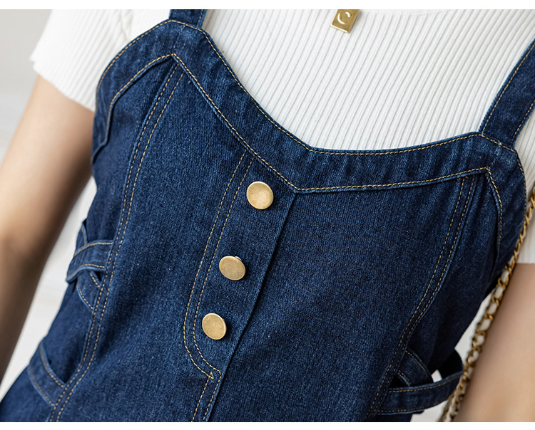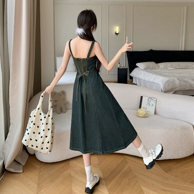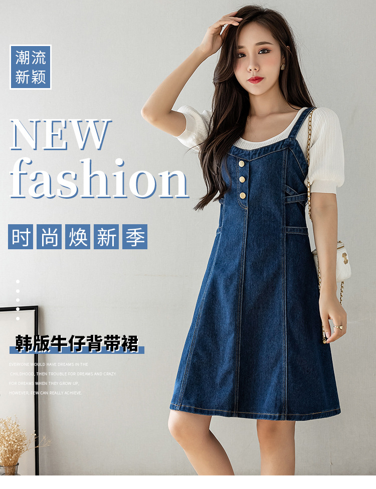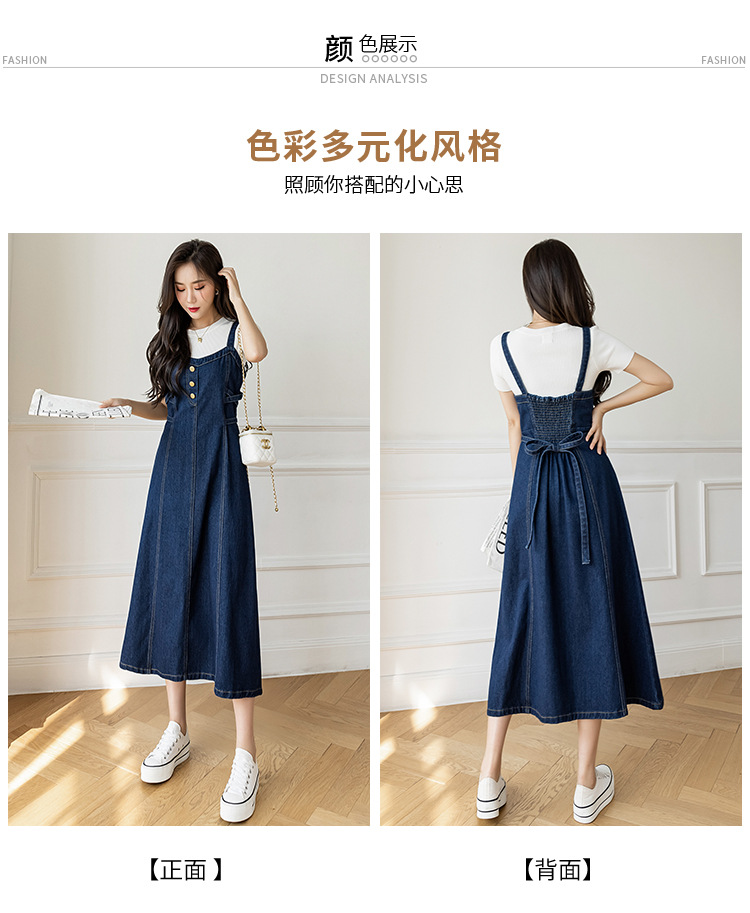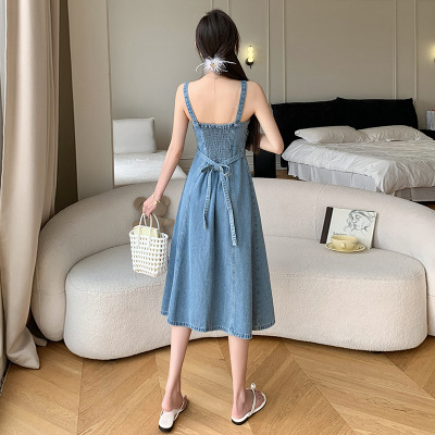 리얼 샷 느슨한 캐주얼 모든 경기 데님 스트랩 원피스 중간 길이 슬림 핏 원피스 여성