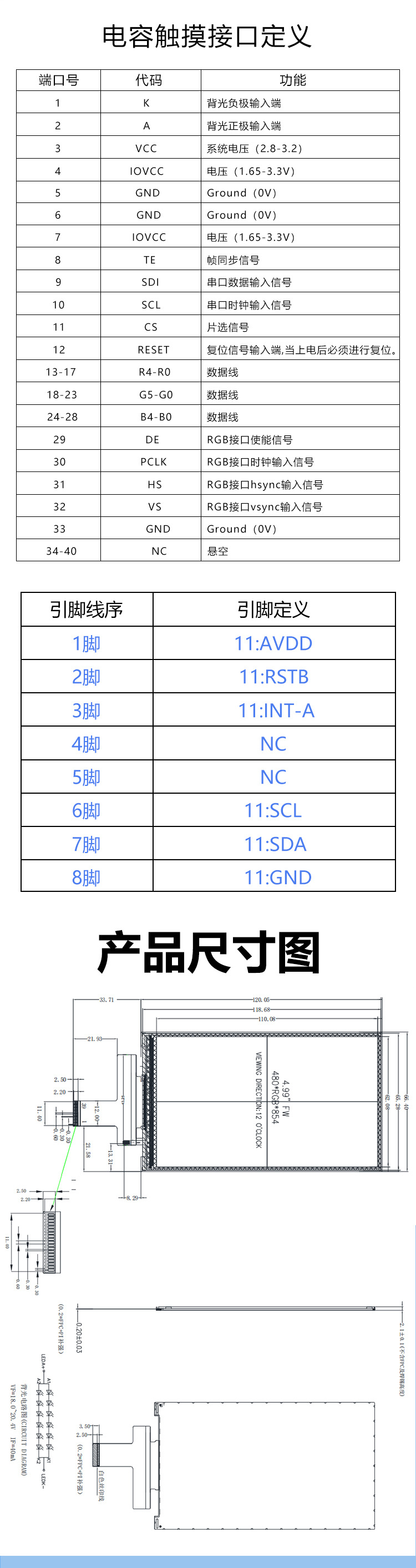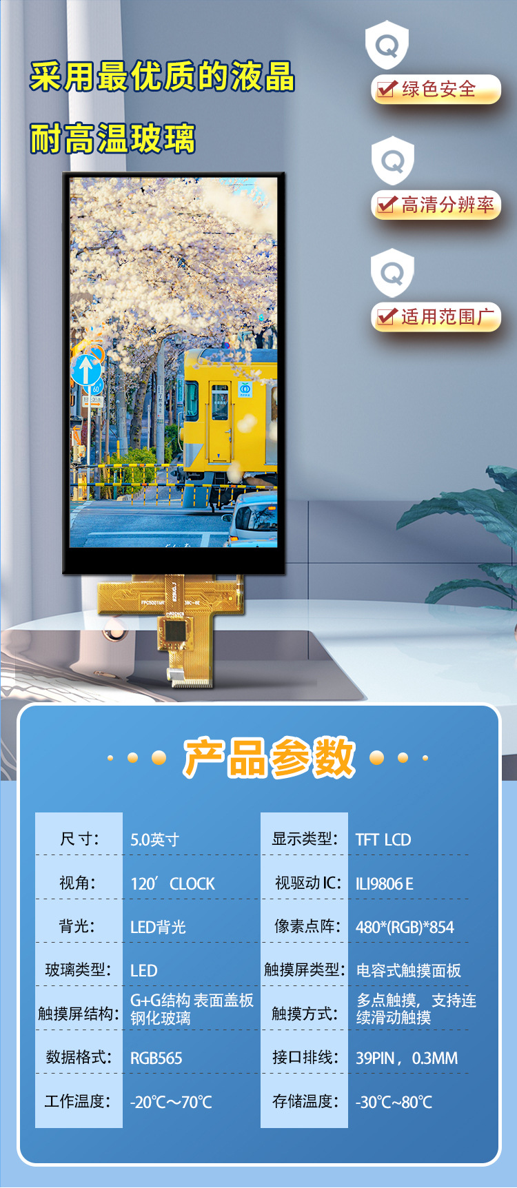 5.0 인치 TFTLCD 디스플레이 39p 용량 터치 RGB LCD 디스플레이