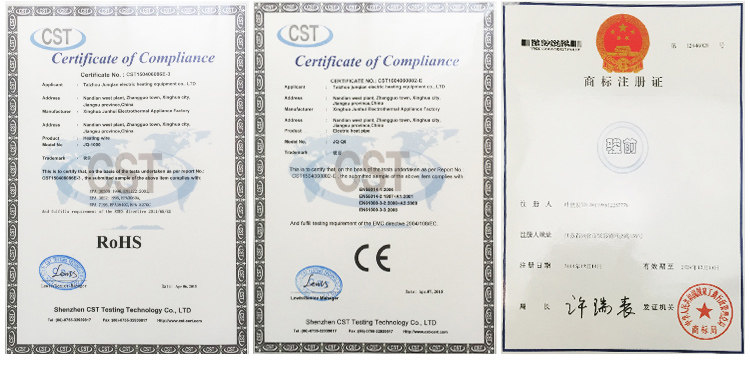 亲你好,热烈祝贺泰州市骏前电热器材有限公司荣获::中国AAA信用企业,AAA级质量服务诚信单位,AAA级重合同守信用企业,国际质量管理体系ISO9001认证!部分产品荣获:中国实用新型专利产品(ZL,2018,2 1452150.6),出口型产品通过出口欧盟产品CE认证!出口美国产品ROHS认证CQC认证,亲朋友们放心购买!全国免费咨询热线电话:400-030-4884!