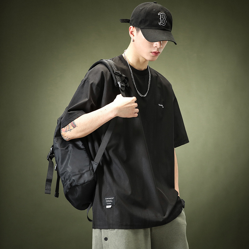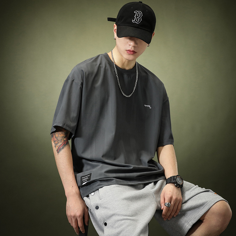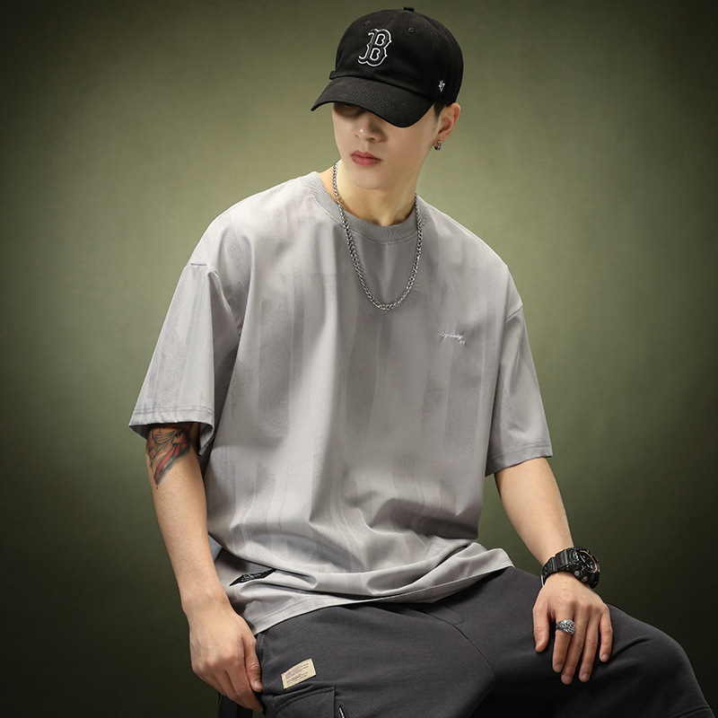 고급 아이스 실크 스트라이프 반팔 티셔츠 남성용 여름, 트렌디 한 느슨한 플러스 사이즈 빠른 건조 스포츠 반팔 티셔츠스토어 가기