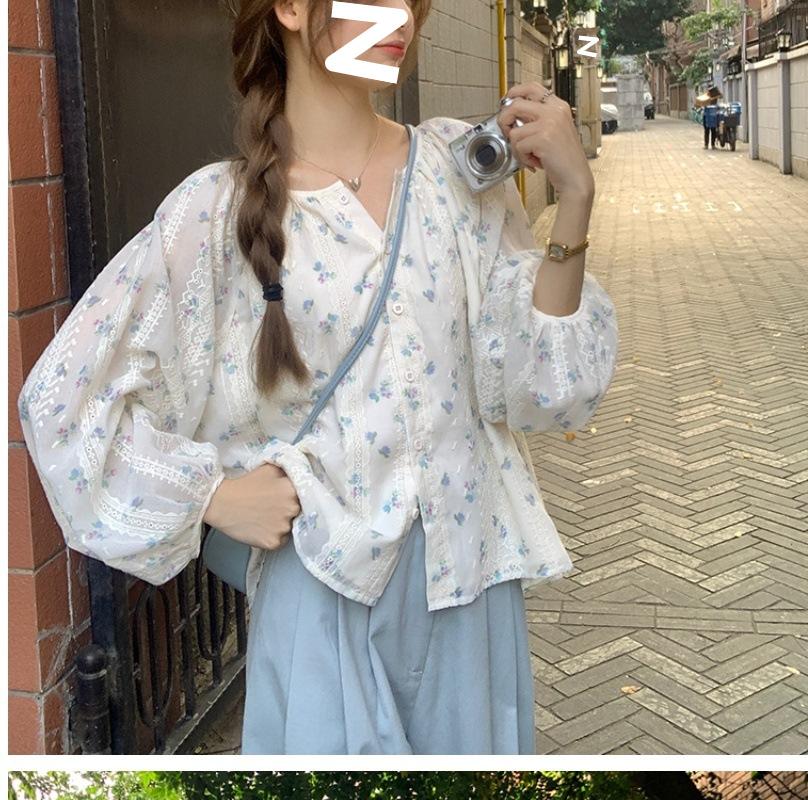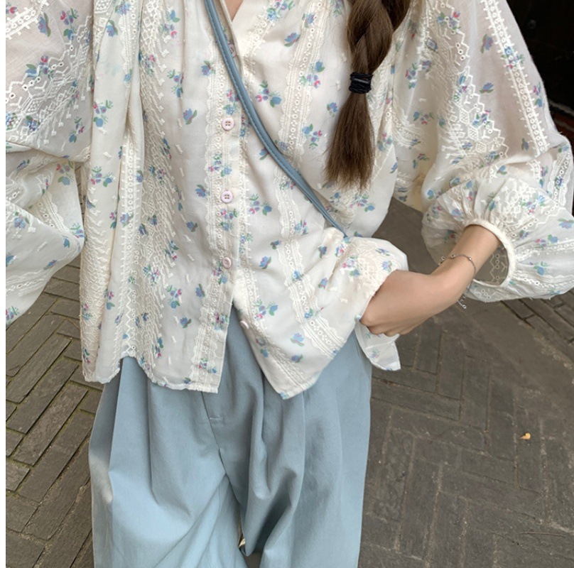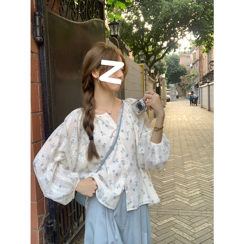 신선한 스타일 꽃무늬 긴팔 셔츠 스몰 사이즈 느슨한 슬리밍 라운드 넥 달콤한 걸리 스타일 모든 매치 쉬폰 셔츠스토어 가기