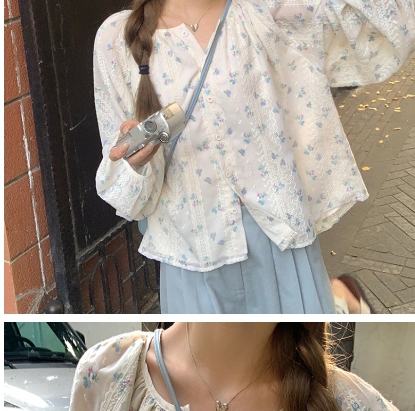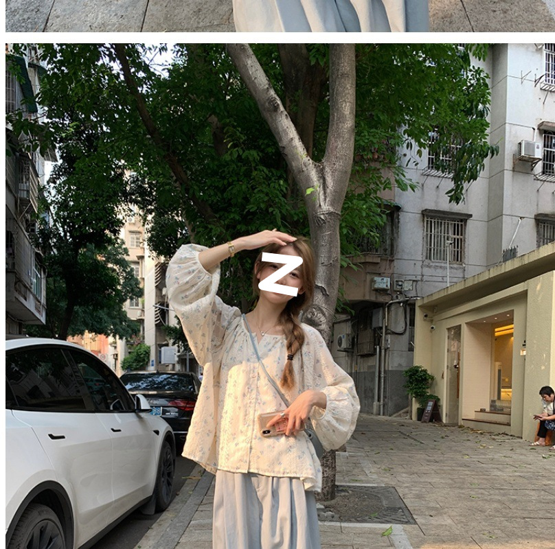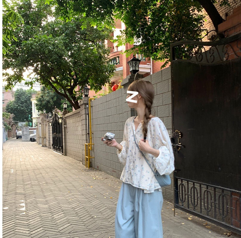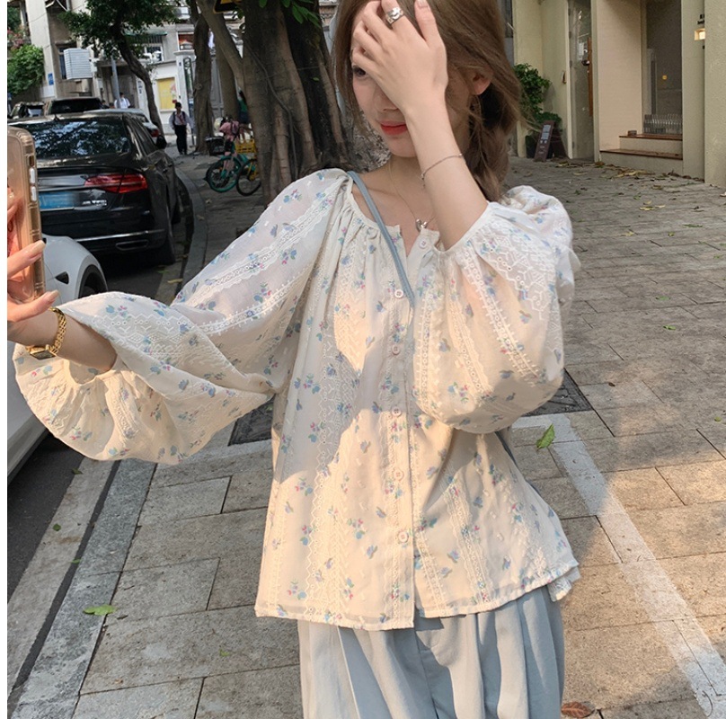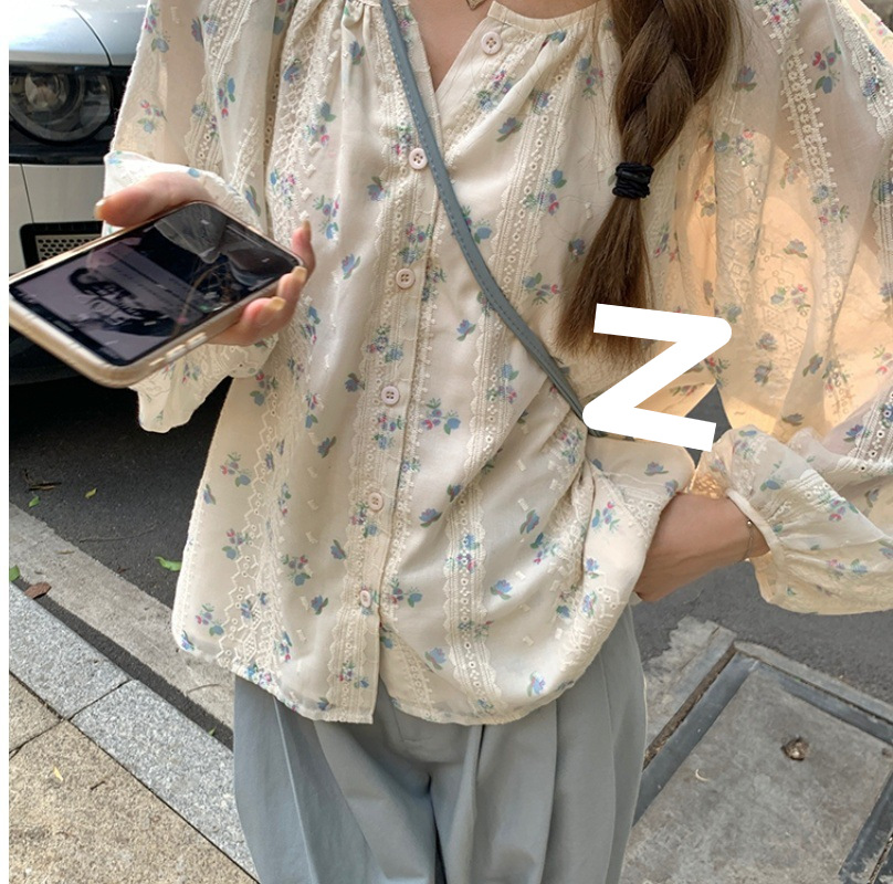 신선한 스타일 꽃무늬 긴팔 셔츠 스몰 사이즈 느슨한 슬리밍 라운드 넥 달콤한 걸리 스타일 모든 매치 쉬폰 셔츠