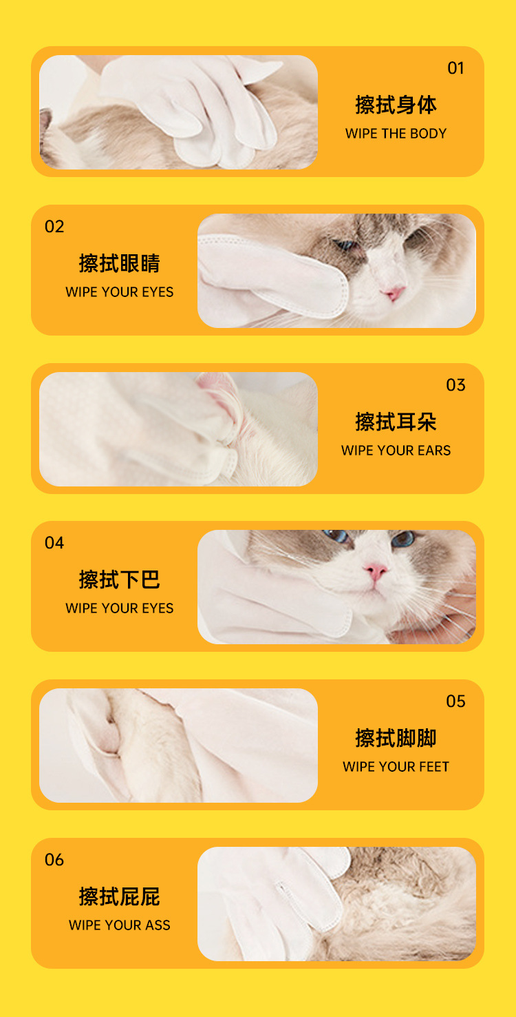 고양이와 개를위한 애완 동물 청소 및 소독 물티슈 일회용 장갑 인공물 고양이 개 목욕 용품 도매스토어 가기