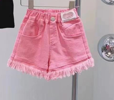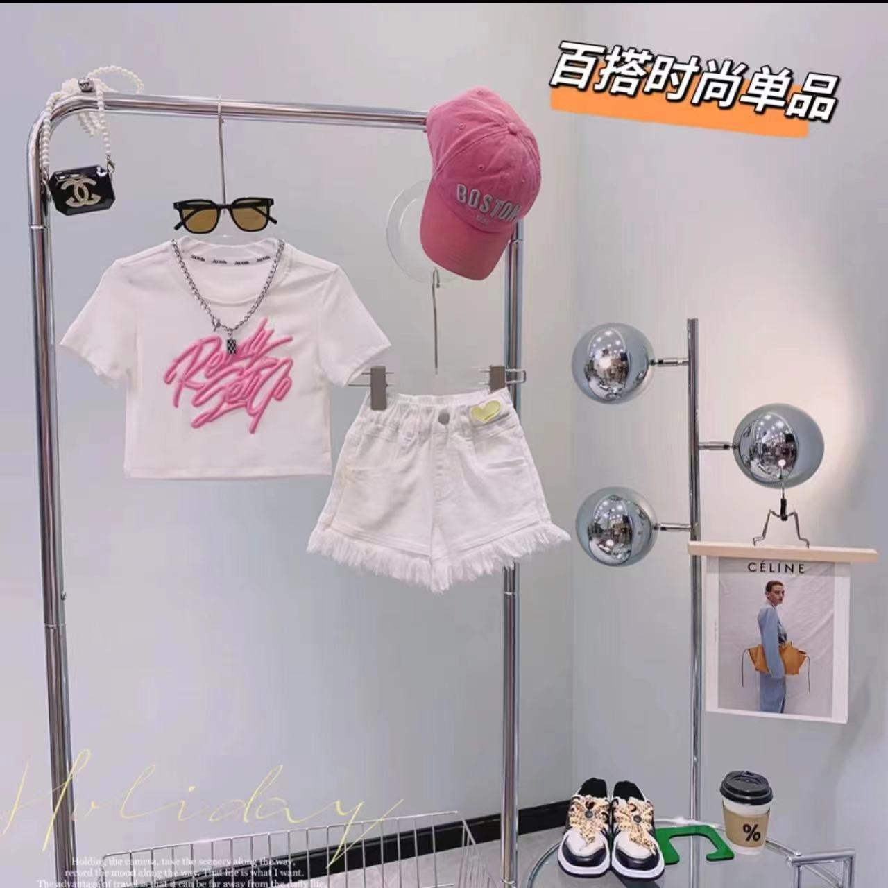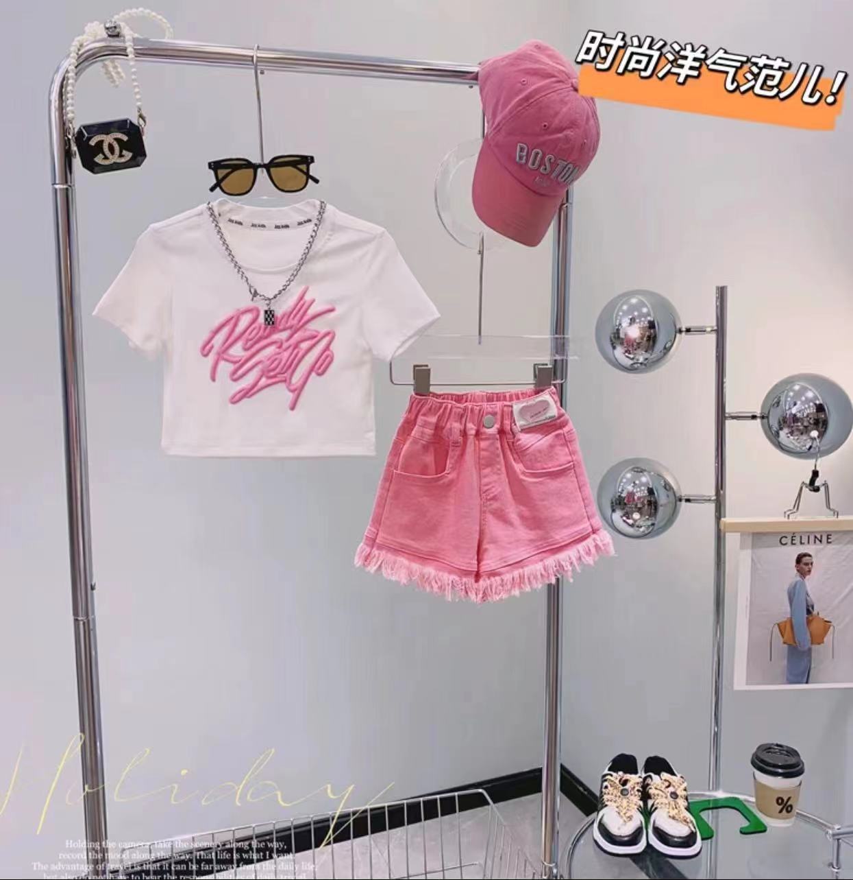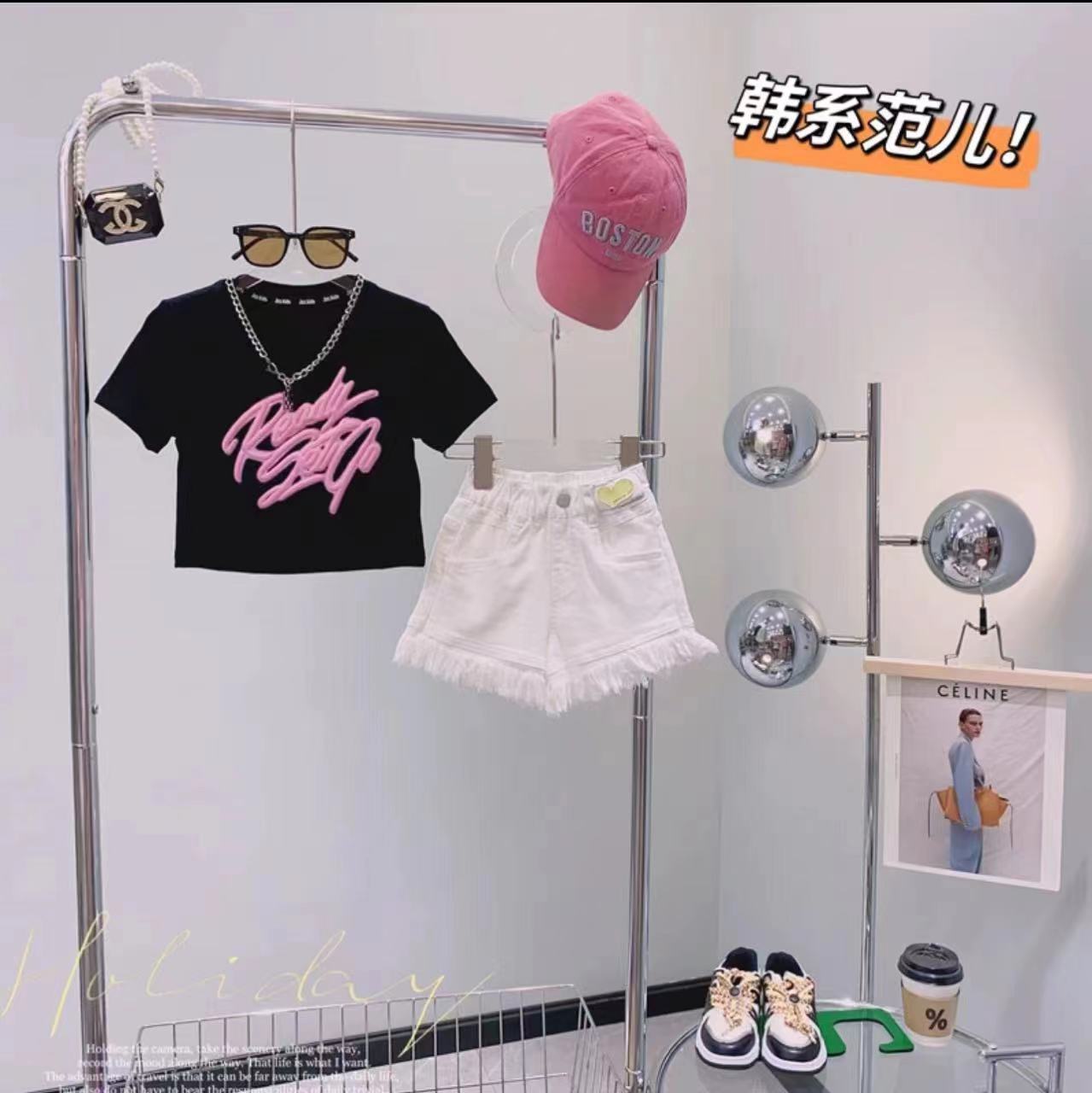 여자 여름 세트 2024 여름 원피스 큰 키즈 반팔 니트 스웨터 모피 엣지 반바지 유행 투피스 세트스토어 가기