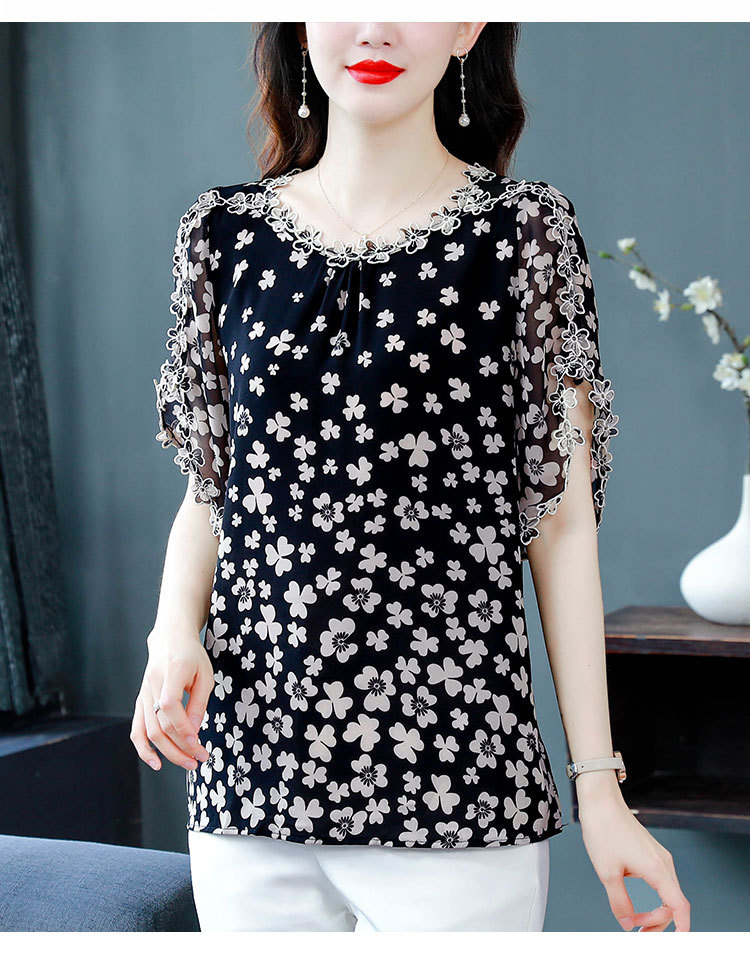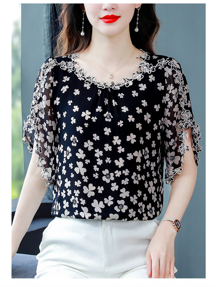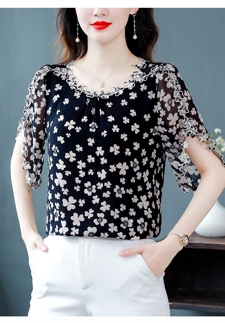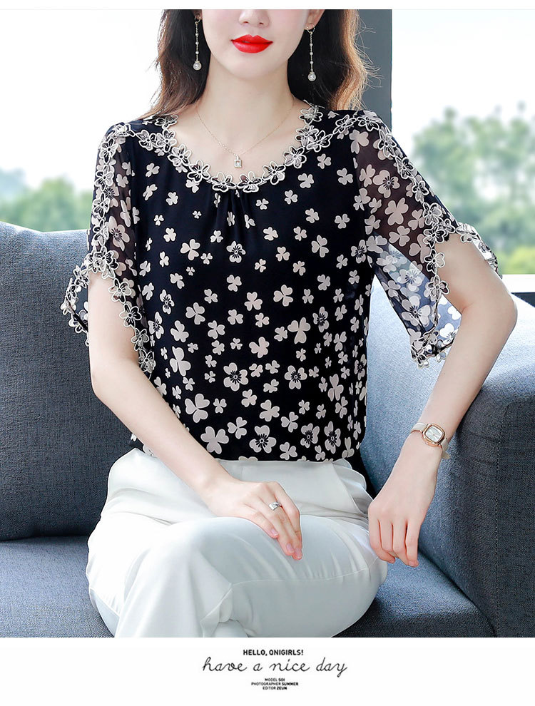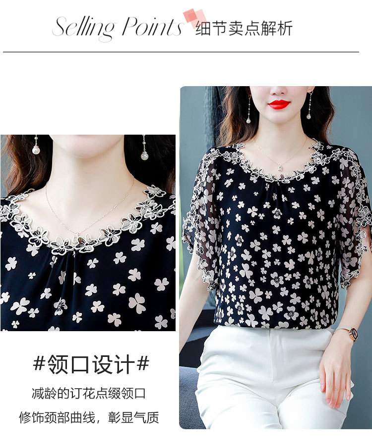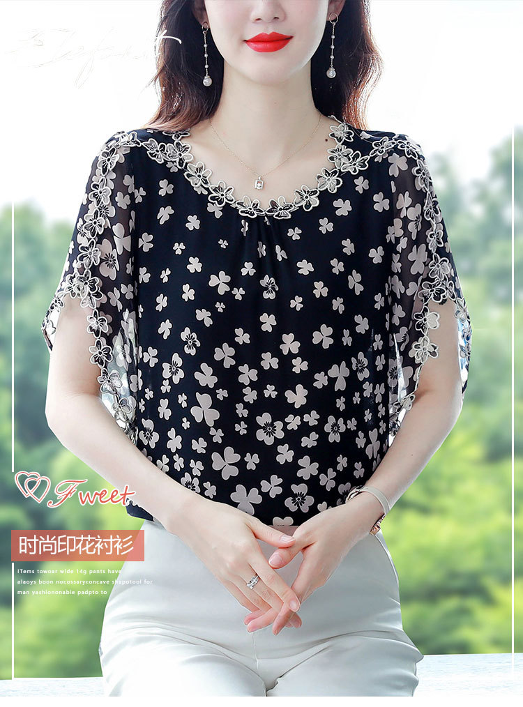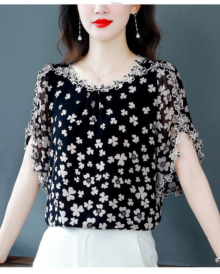 유럽 중공업 플라잉 슬리브 여성용 꽃 무늬 셔츠 2023 여름 새로운 유행 유행 쉬폰 짧은 소매 탑