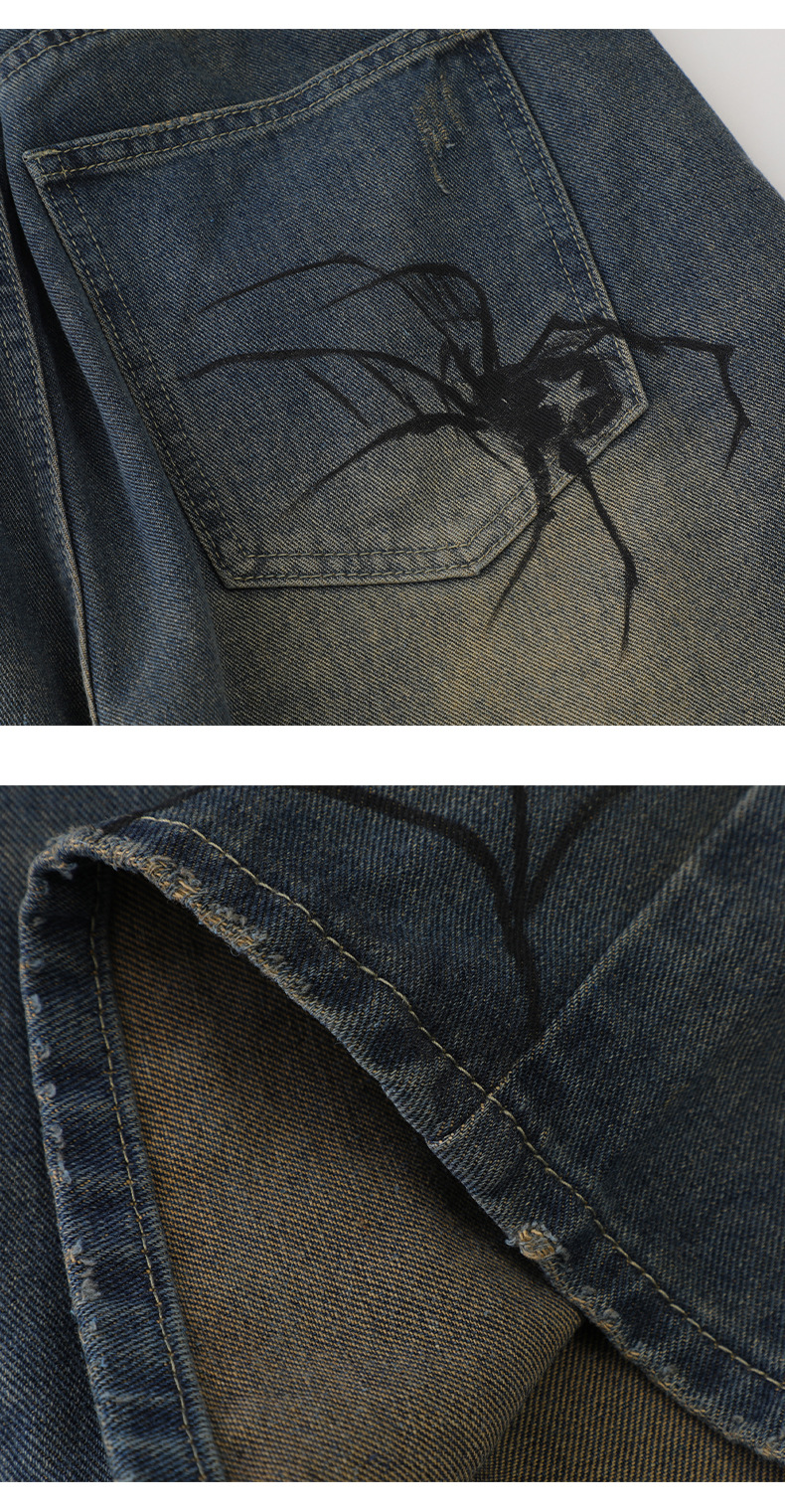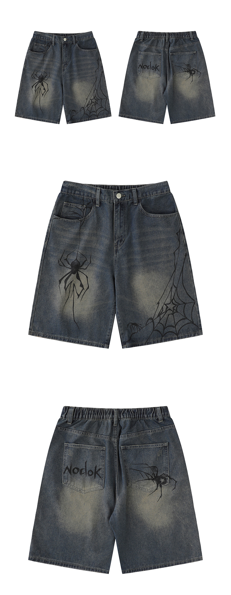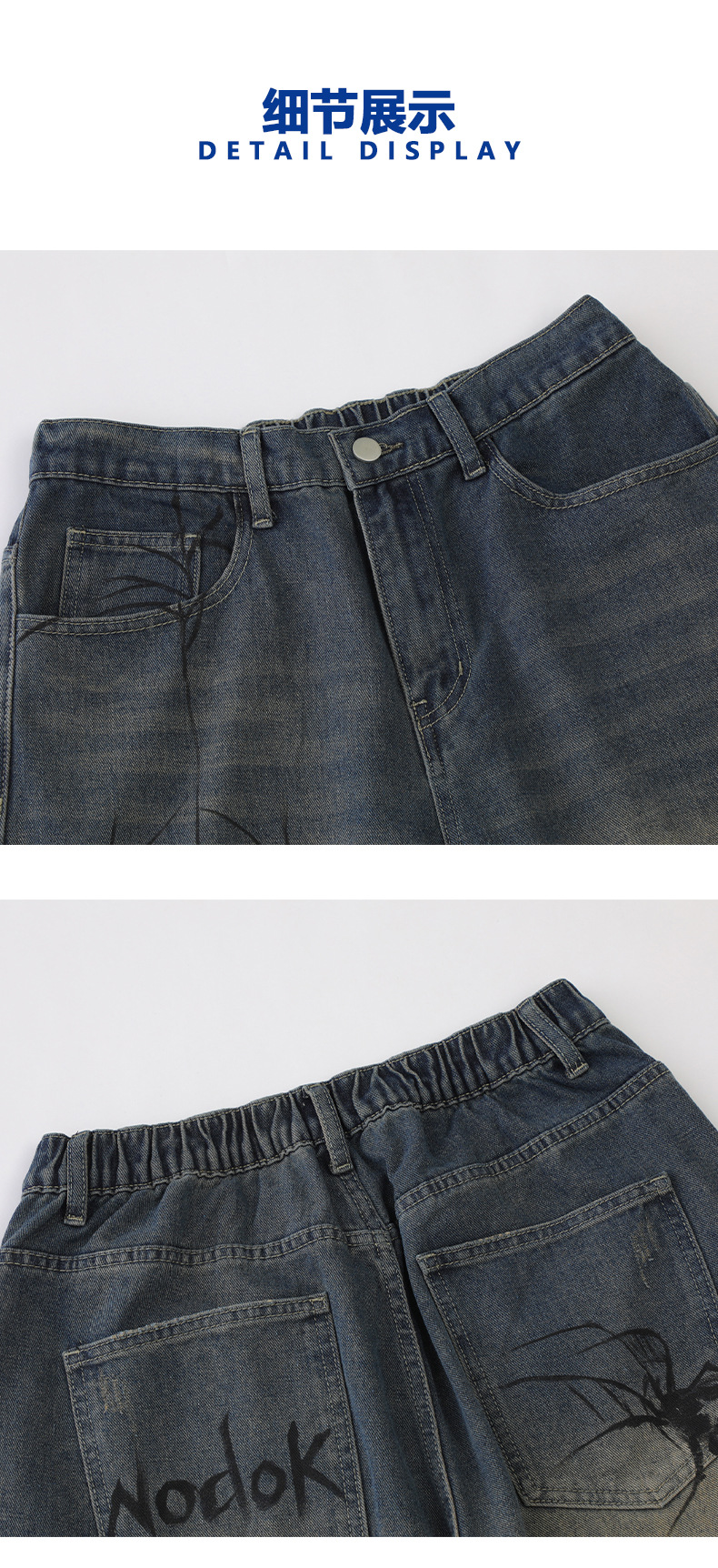TIDEEKU 트렌디 남성 라이트 블루 레트로 워싱 디스트레스드 스파이더 프린트 데님 스트레이트 루즈 반바지