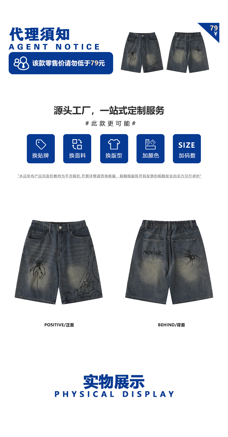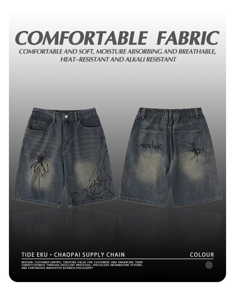TIDEEKU 트렌디 남성 라이트 블루 레트로 워싱 디스트레스드 스파이더 프린트 데님 스트레이트 루즈 반바지스토어 가기