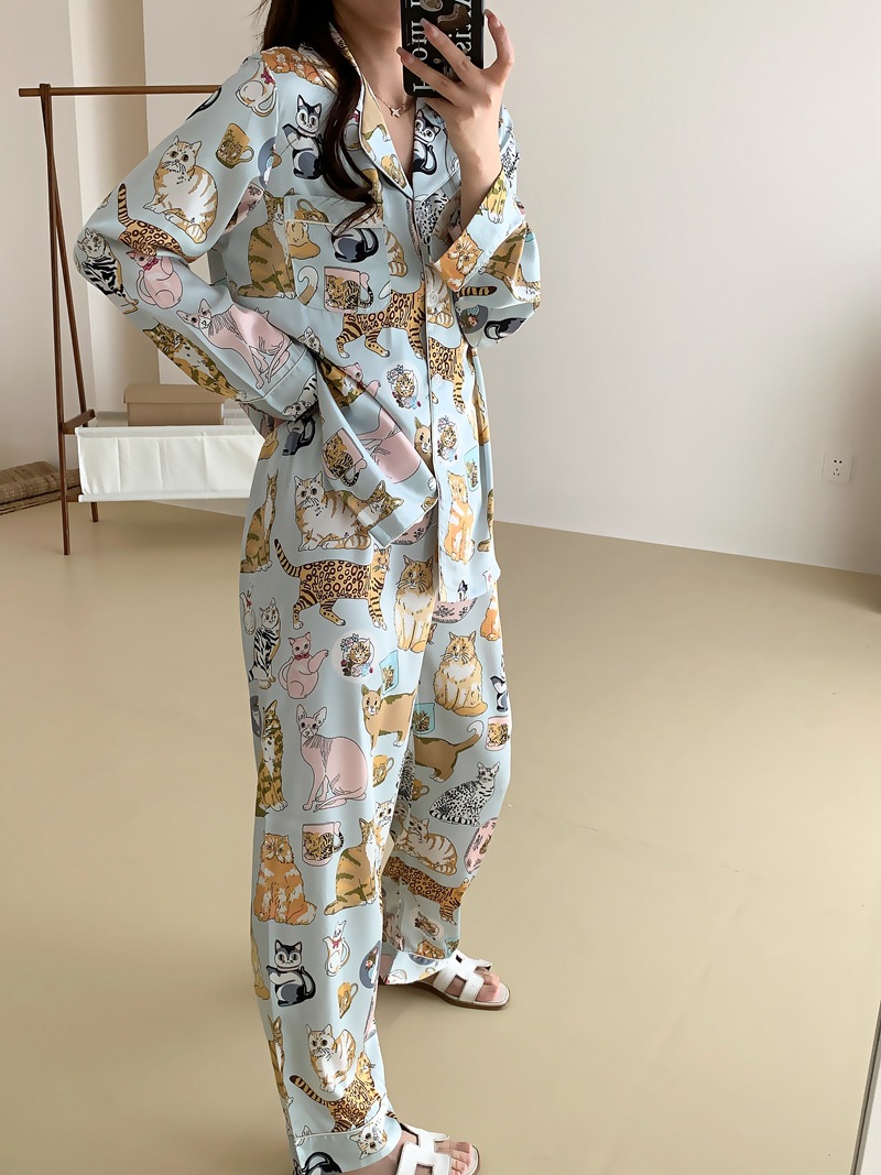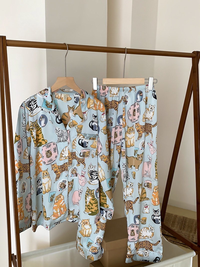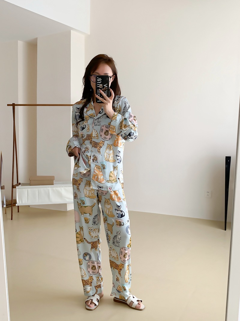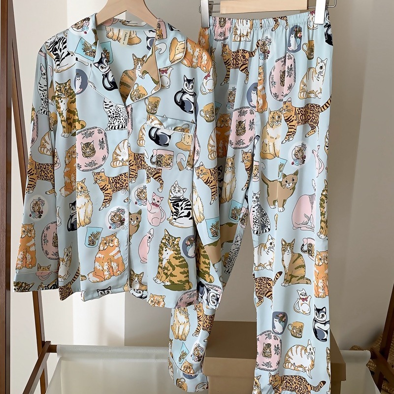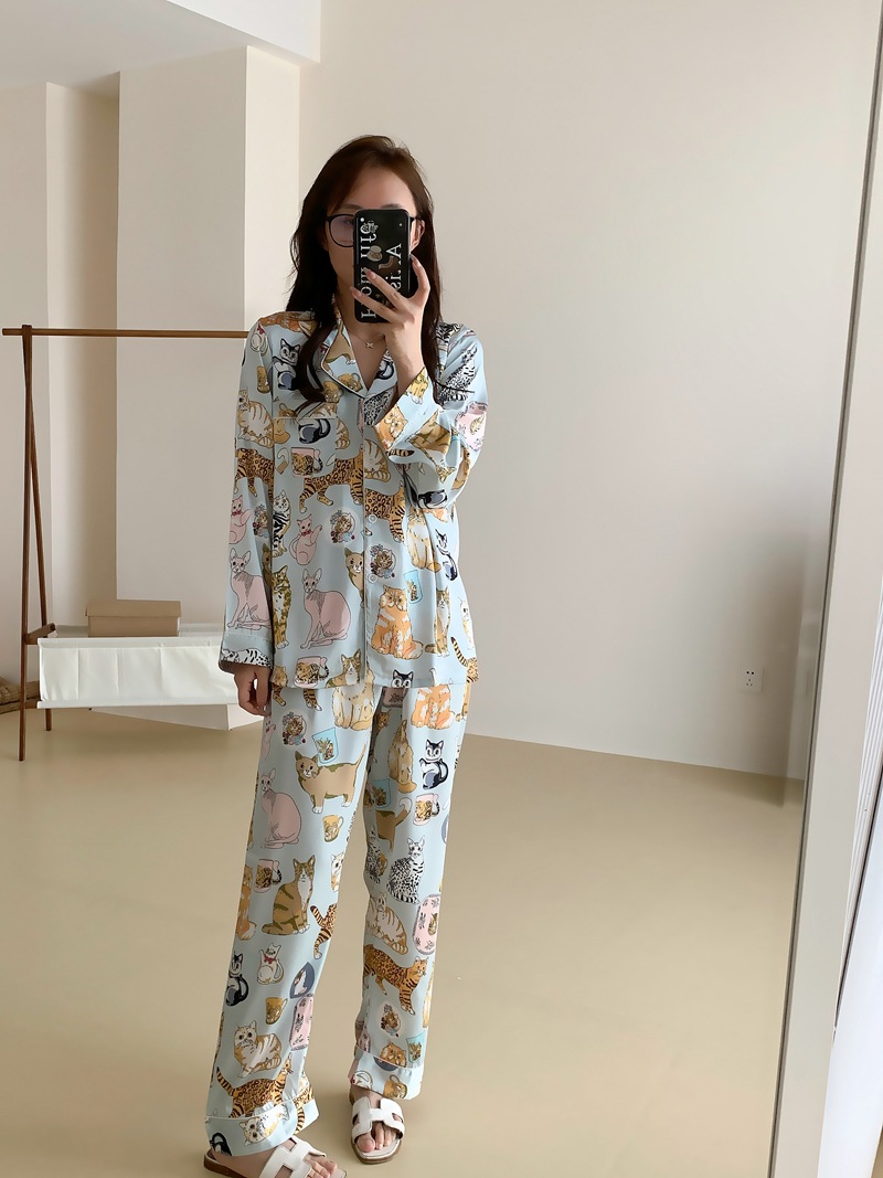 LS와 같은 스타일의 여성용 잠옷, 봄, 가을용 아이스 실크 긴팔, 여름 인터넷 연예인 스타일, 모조 실크 고양이 모양 스타 홈웨어스토어 가기