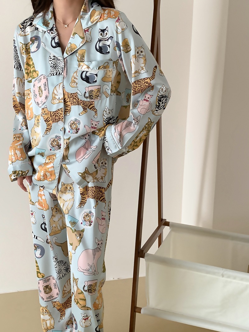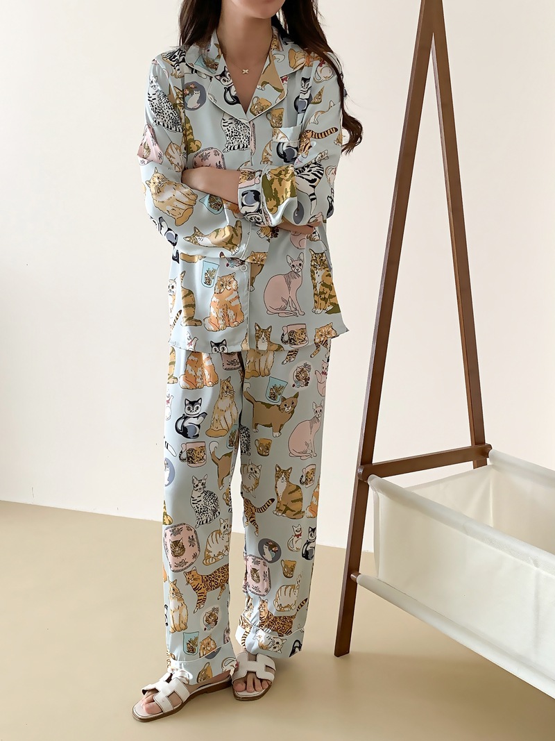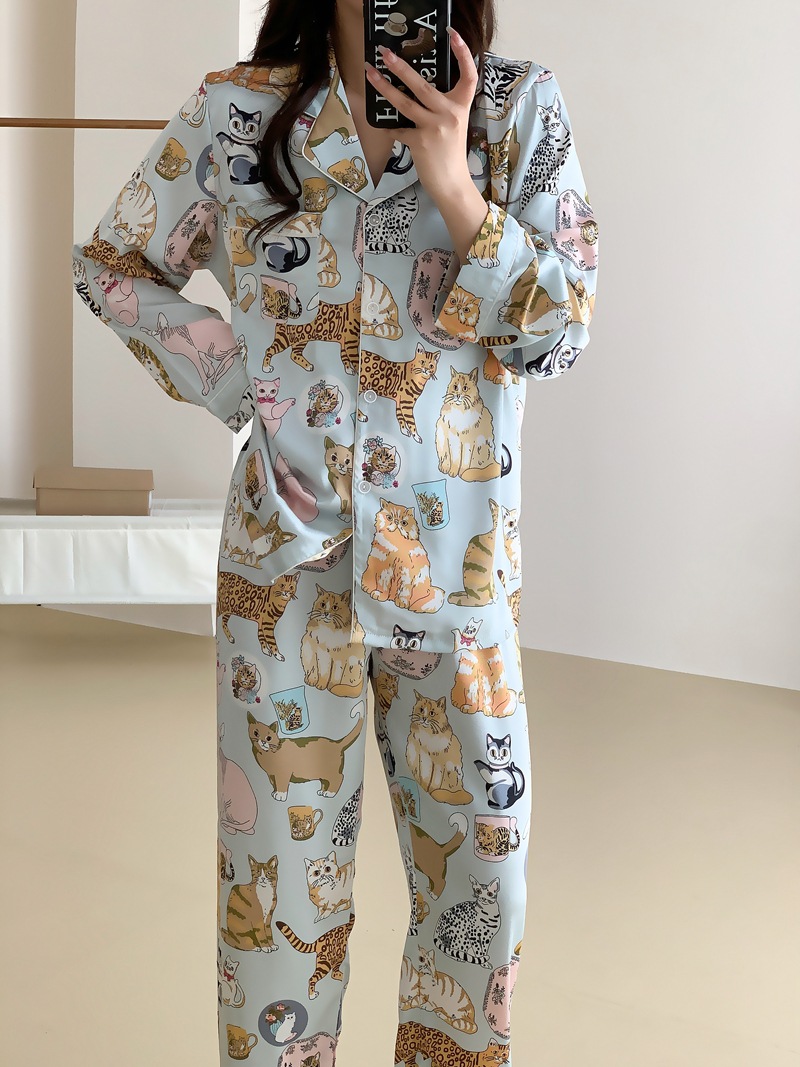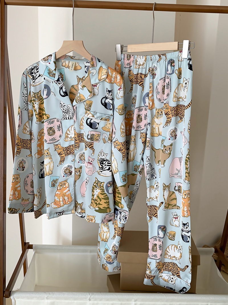LS와 같은 스타일의 여성용 잠옷, 봄, 가을용 아이스 실크 긴팔, 여름 인터넷 연예인 스타일, 모조 실크 고양이 모양 스타 홈웨어스토어 가기