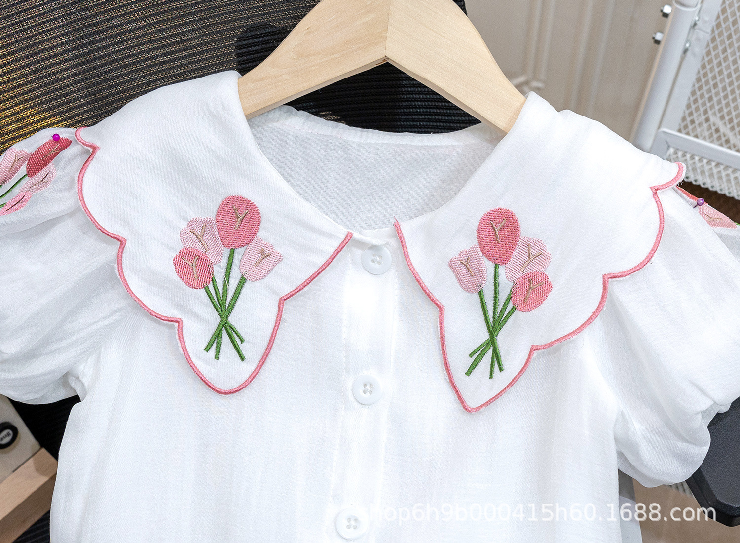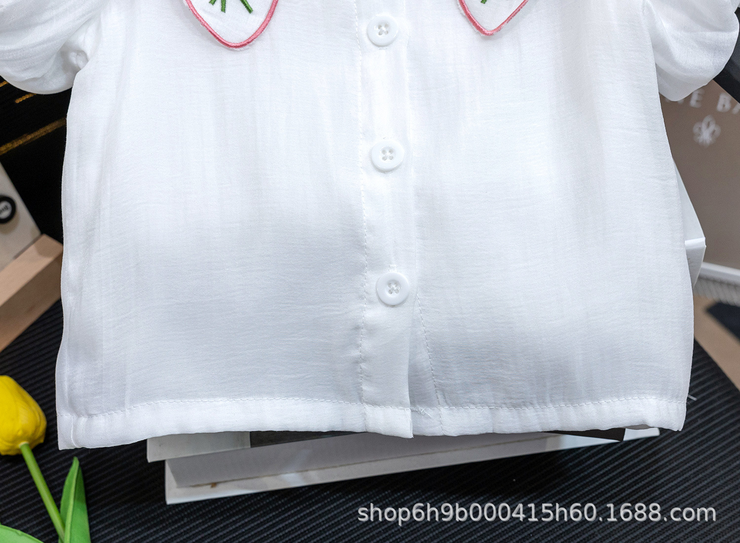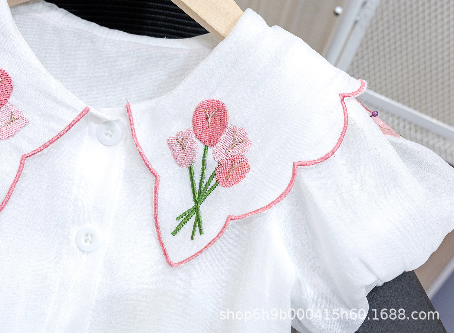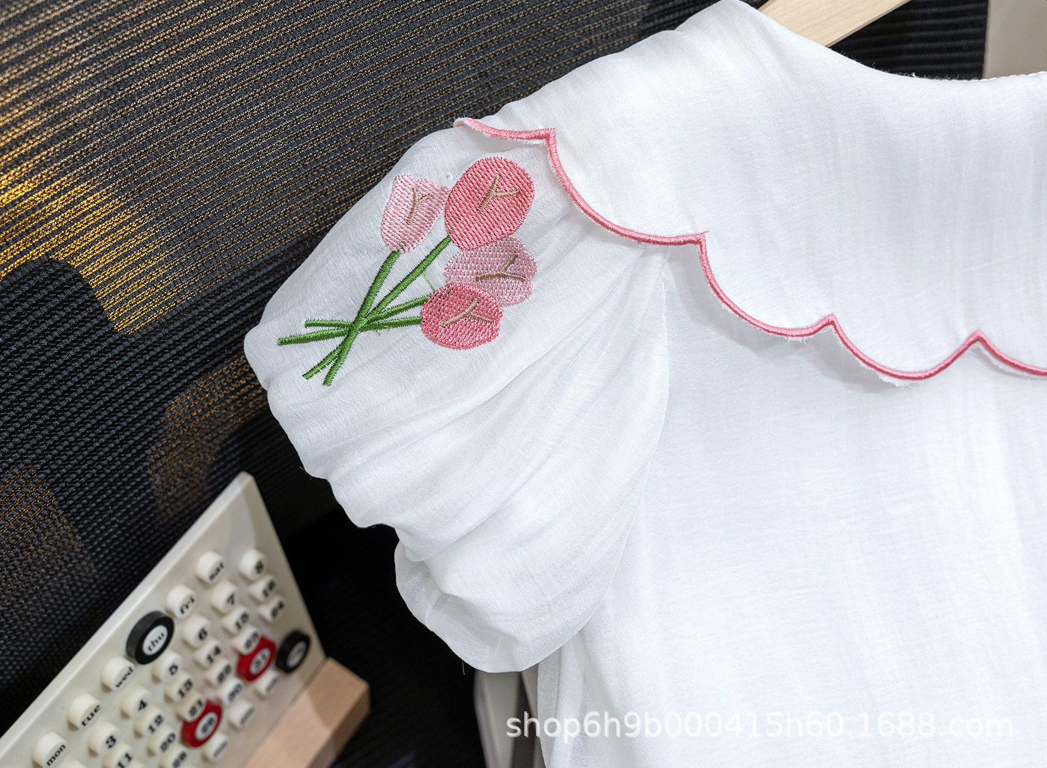 여아 여름 반팔 셔츠 2025 신상 중소형 아동용 세련된 시폰 자수 연잎 칼라 다용도 상의스토어 가기