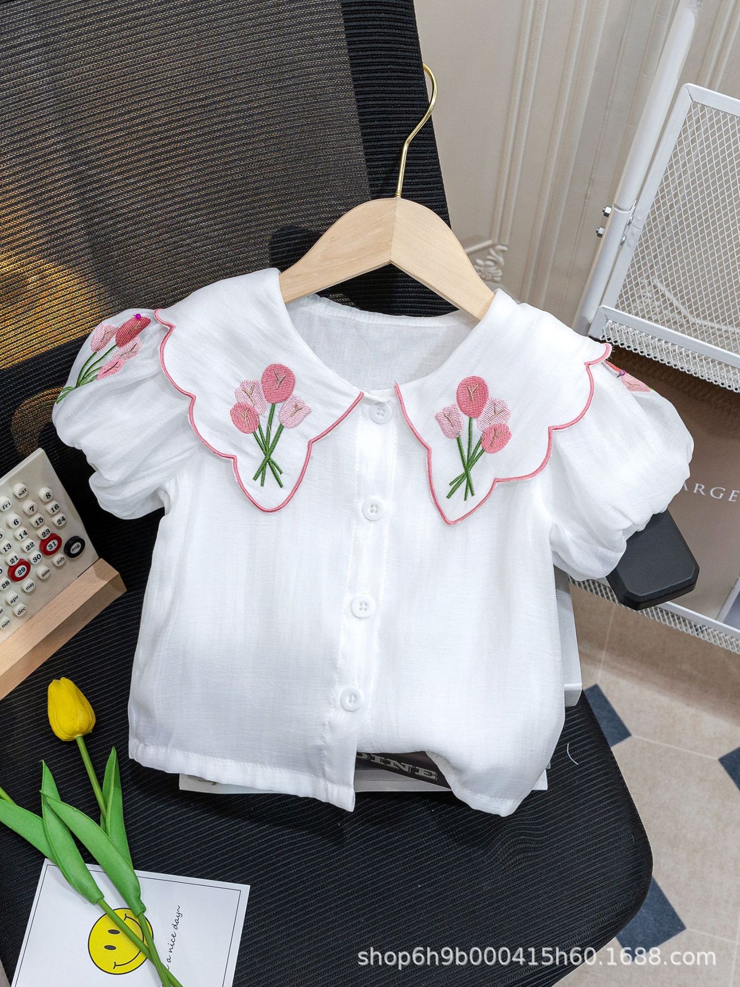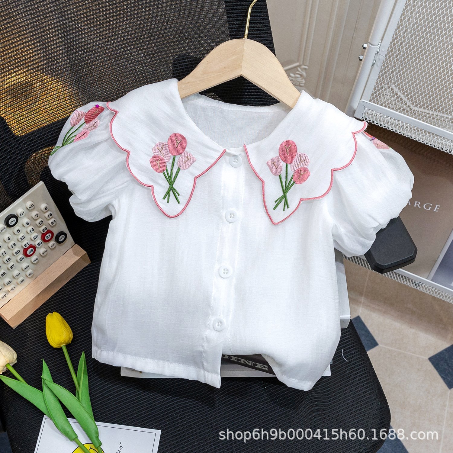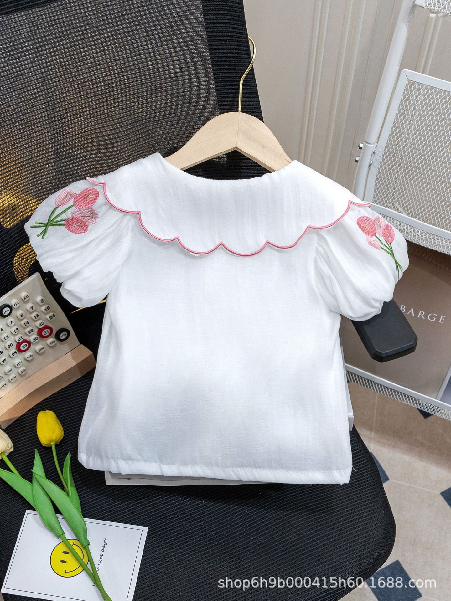 여아 여름 반팔 셔츠 2025 신상 중소형 아동용 세련된 시폰 자수 연잎 칼라 다용도 상의