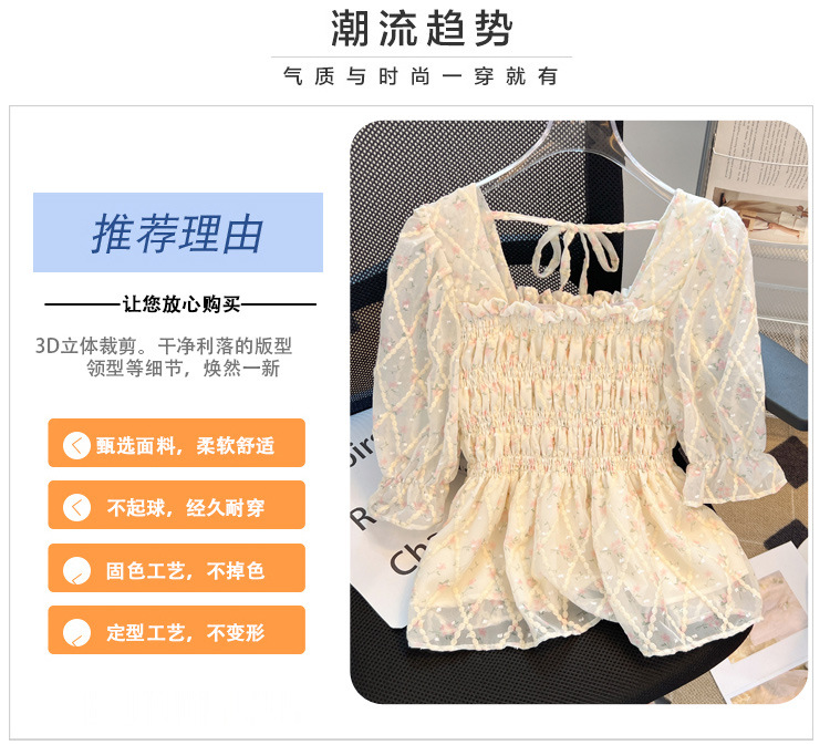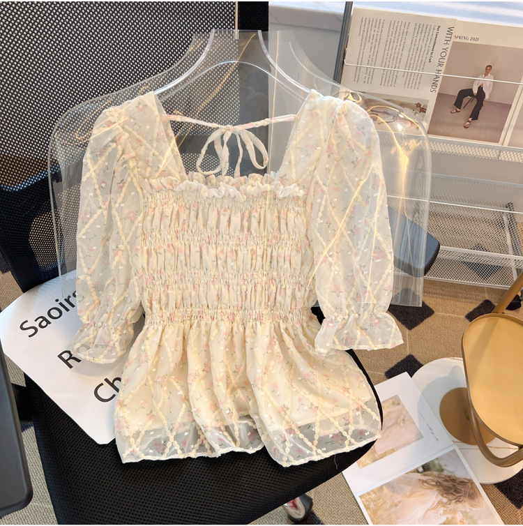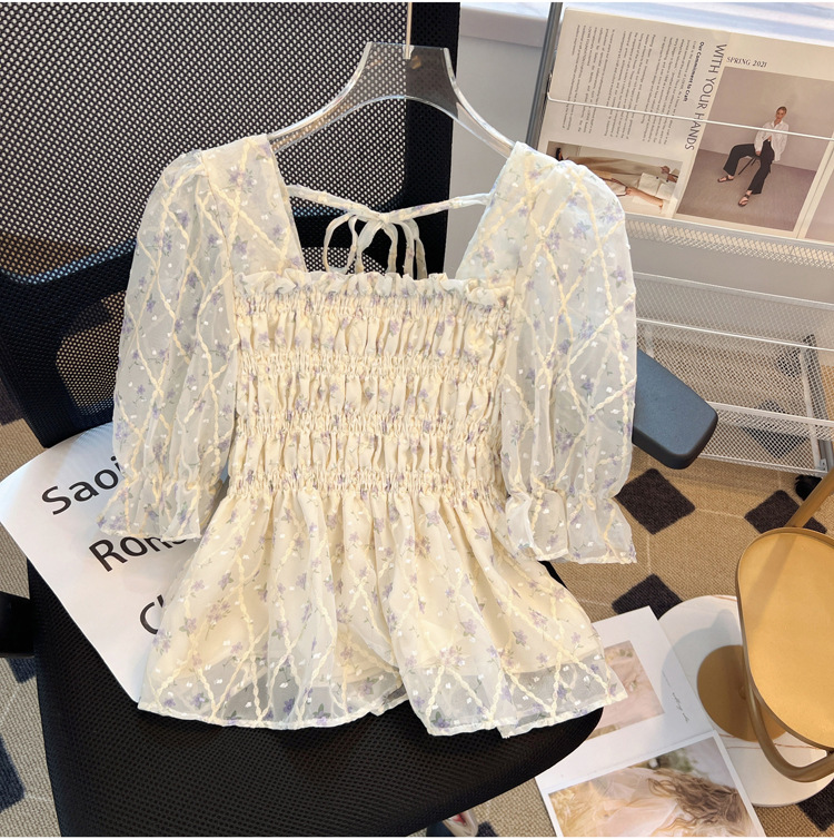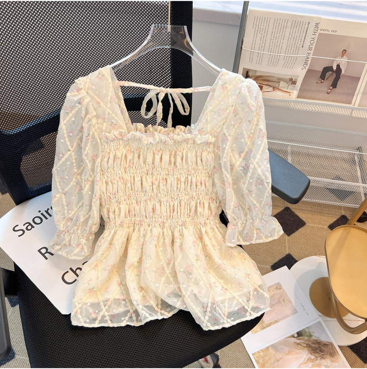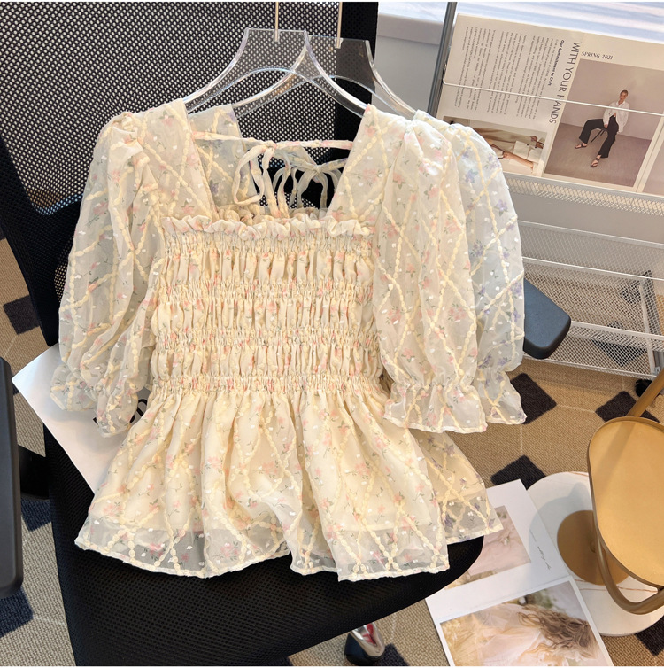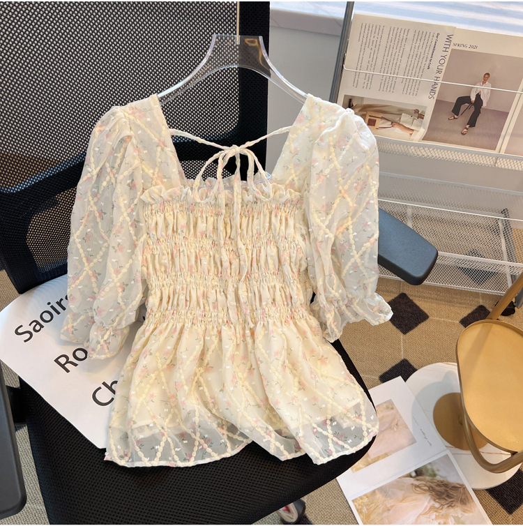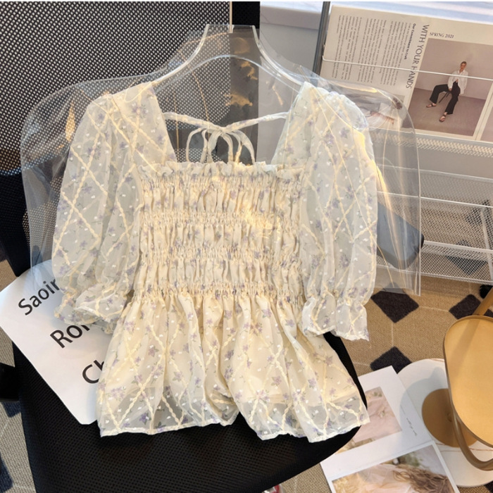 2023 여름 새로운 프랑스 스타일 달콤한 복고풍 꽉 허리 꽃 쉬폰 셔츠 여성의 디자인 감각 짧은 소매 레이스 탑스토어 가기
