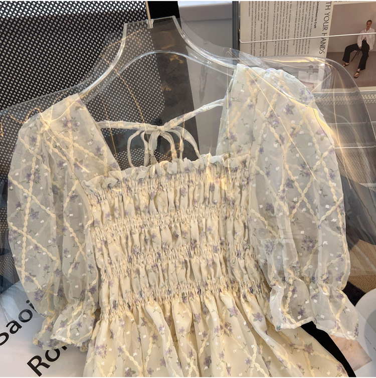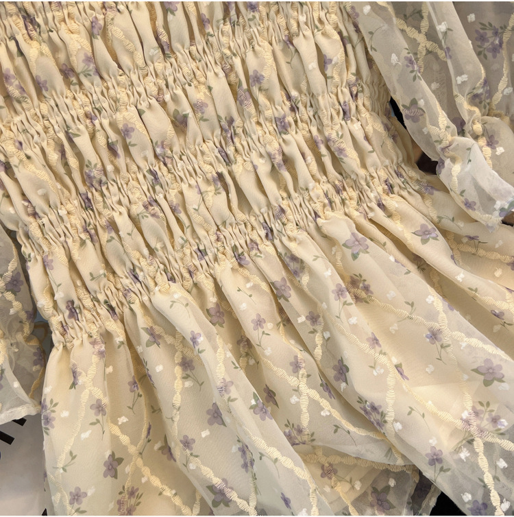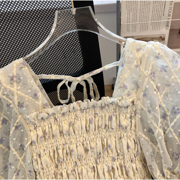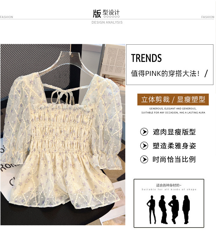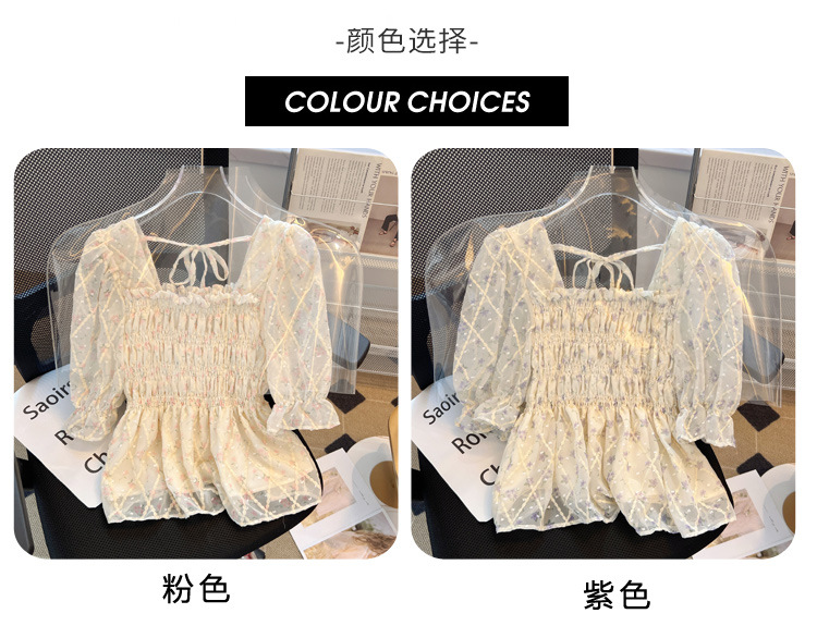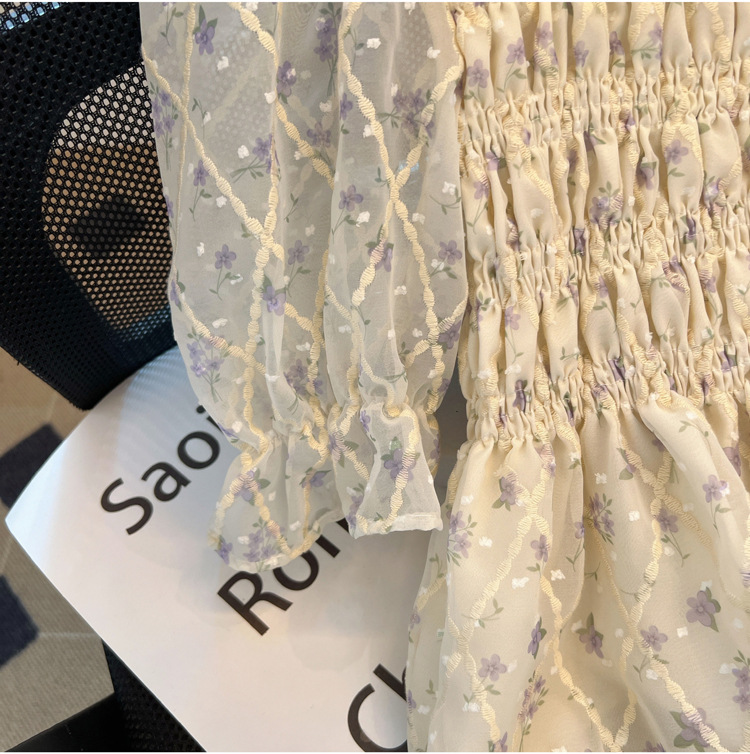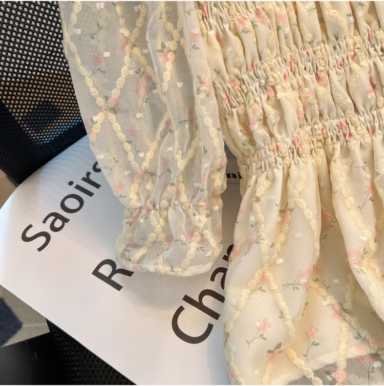 2023 여름 새로운 프랑스 스타일 달콤한 복고풍 꽉 허리 꽃 쉬폰 셔츠 여성의 디자인 감각 짧은 소매 레이스 탑스토어 가기