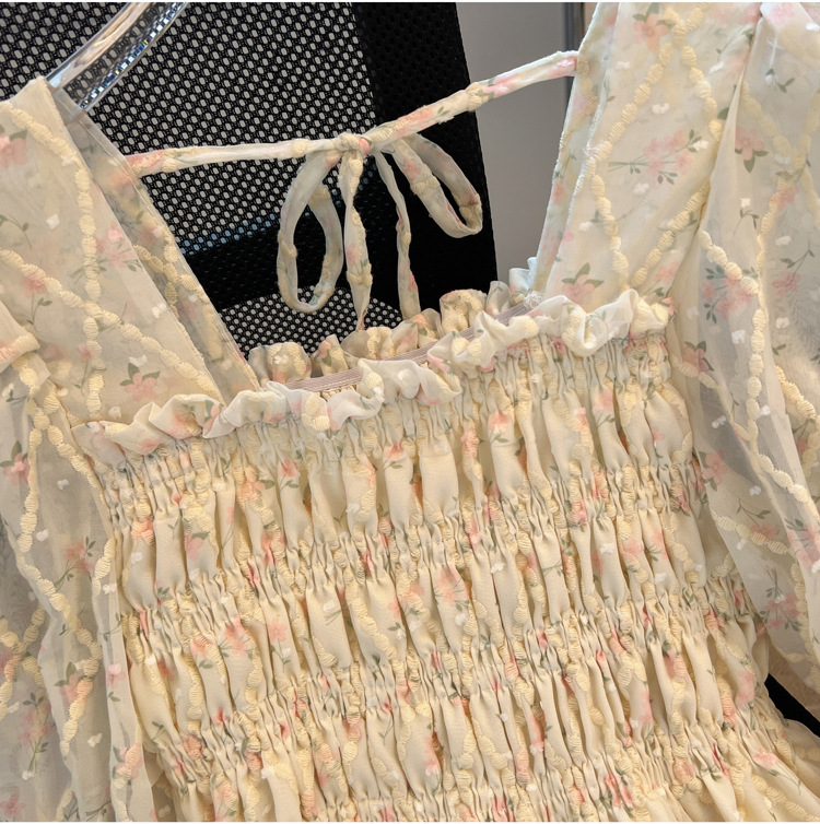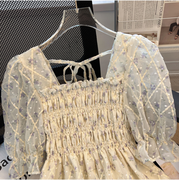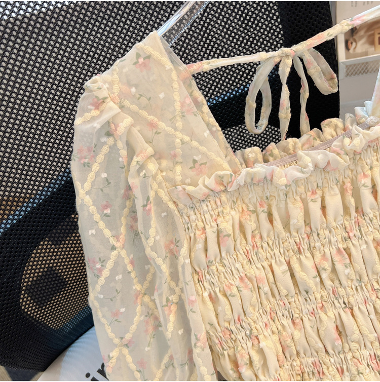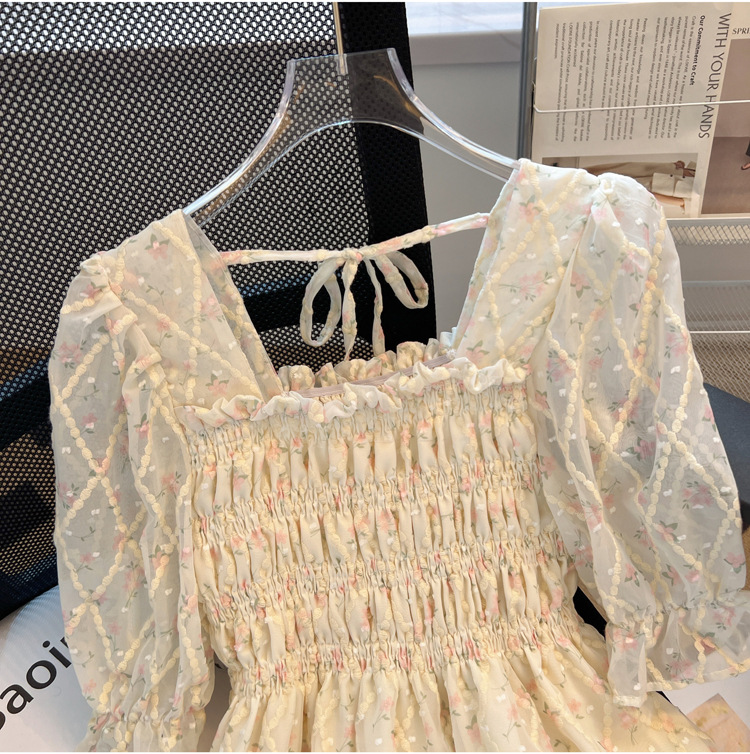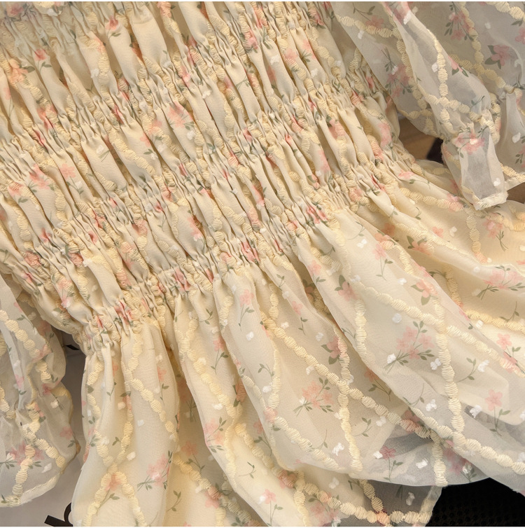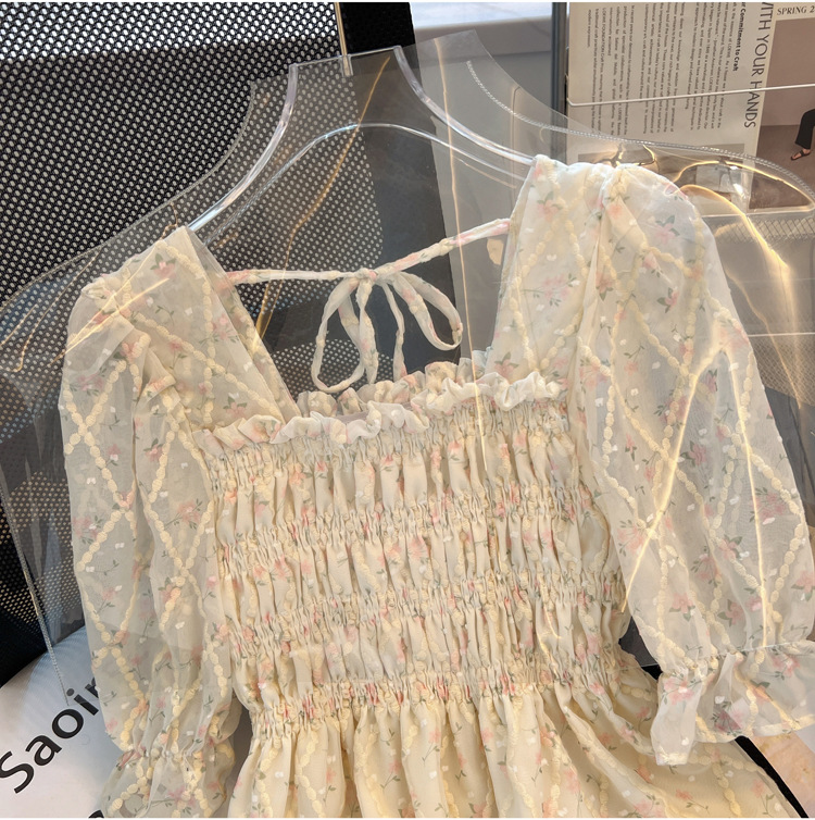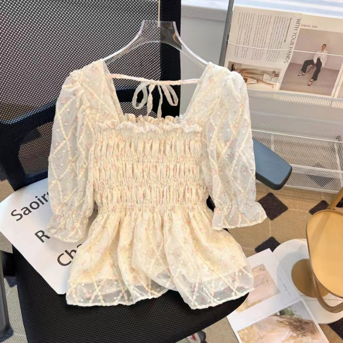 2023 여름 새로운 프랑스 스타일 달콤한 복고풍 꽉 허리 꽃 쉬폰 셔츠 여성의 디자인 감각 짧은 소매 레이스 탑