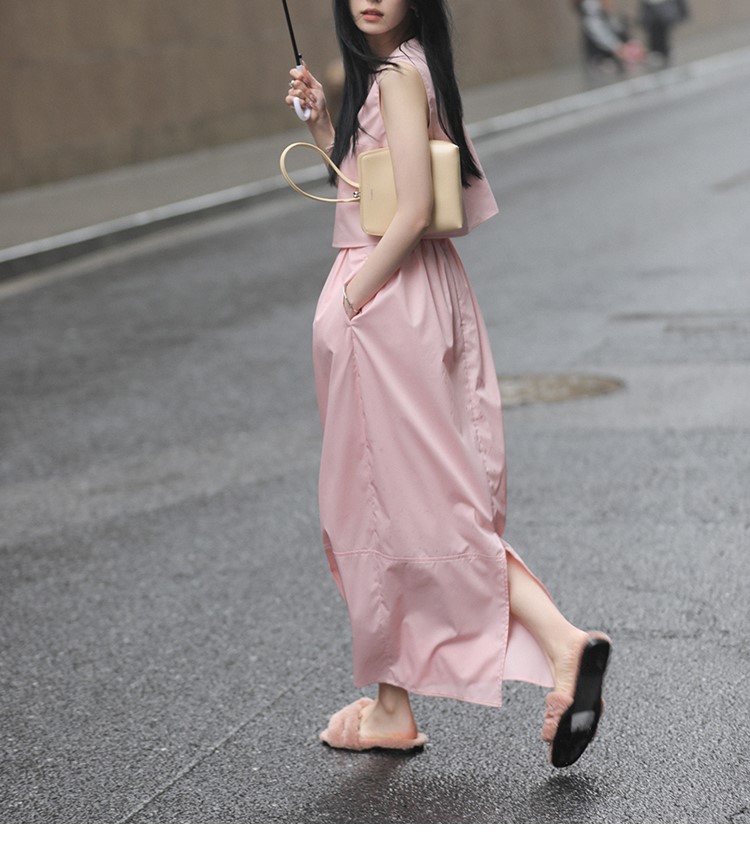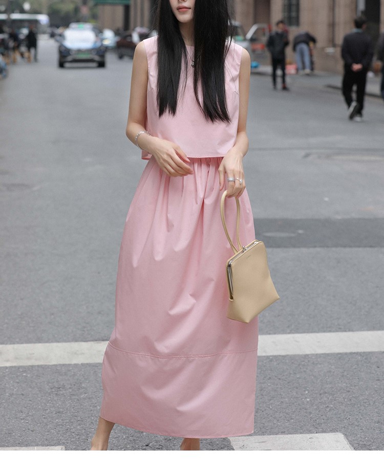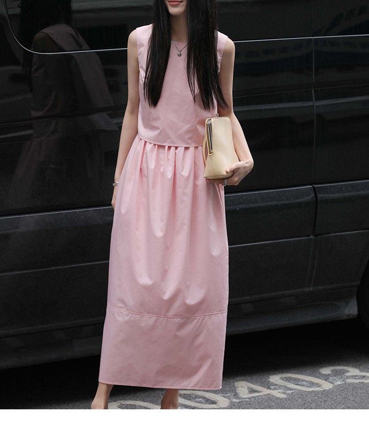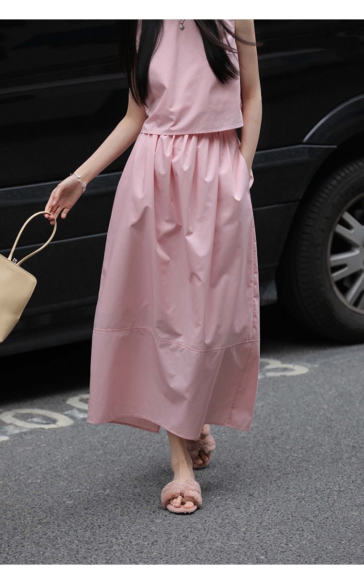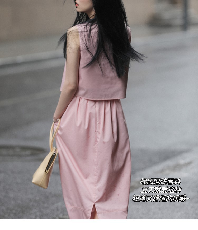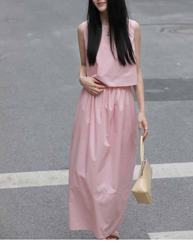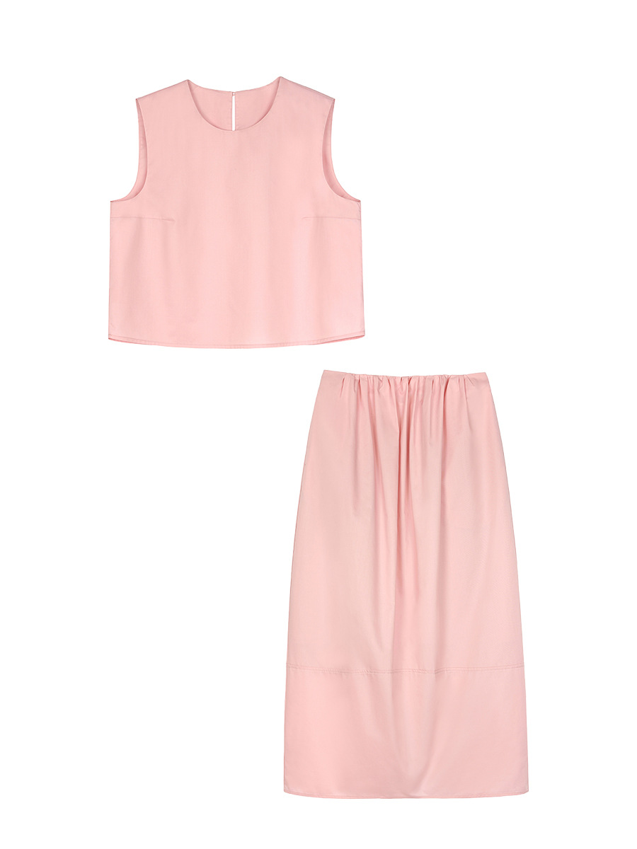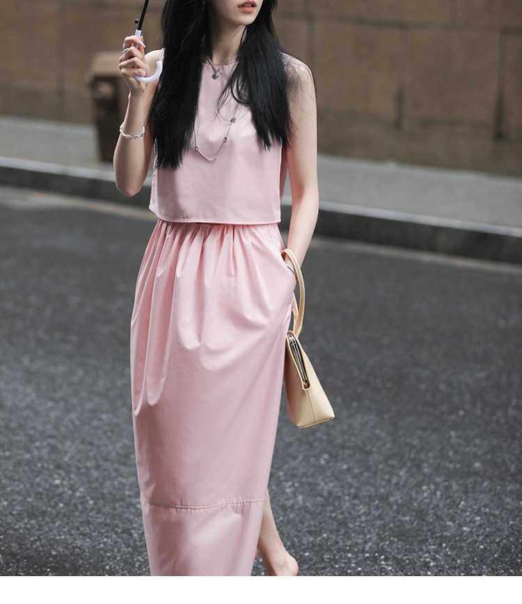 봄 여름 신상 스커트 패션 세트, 스트레이트 스커트, 한국 스타일 민소매 셔츠, 라운드넥 코튼 느낌의 구김 방지 탑 여성용스토어 가기