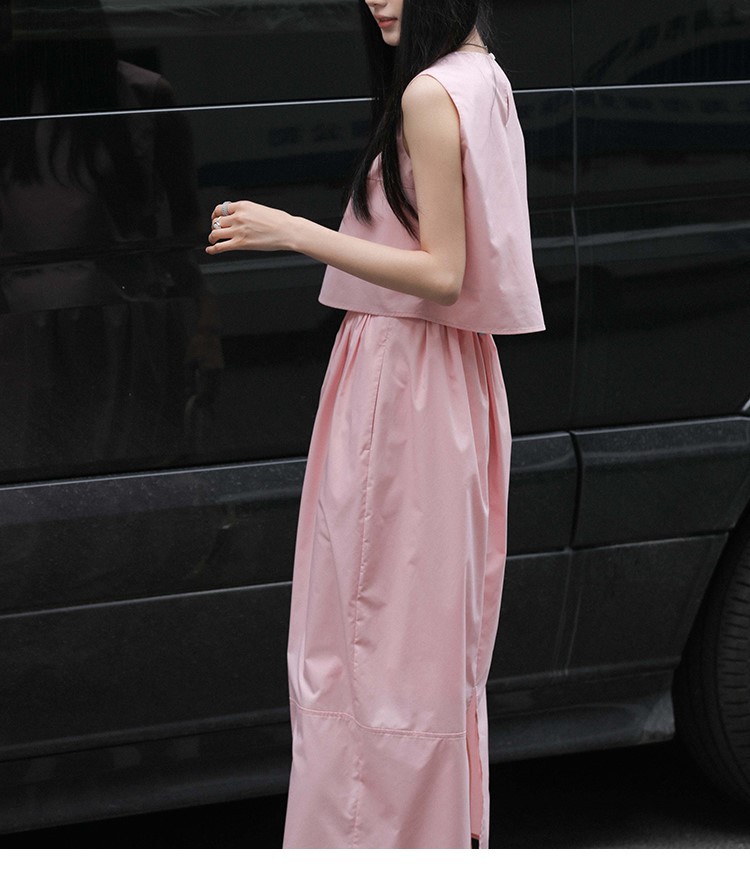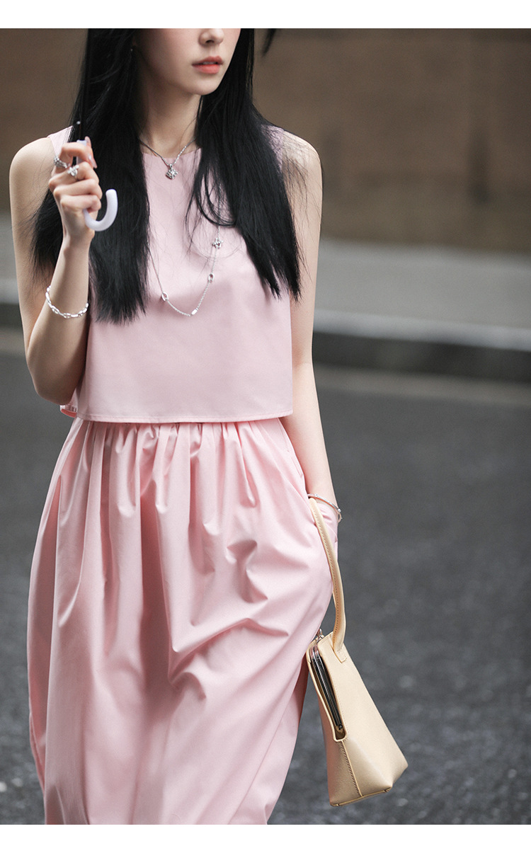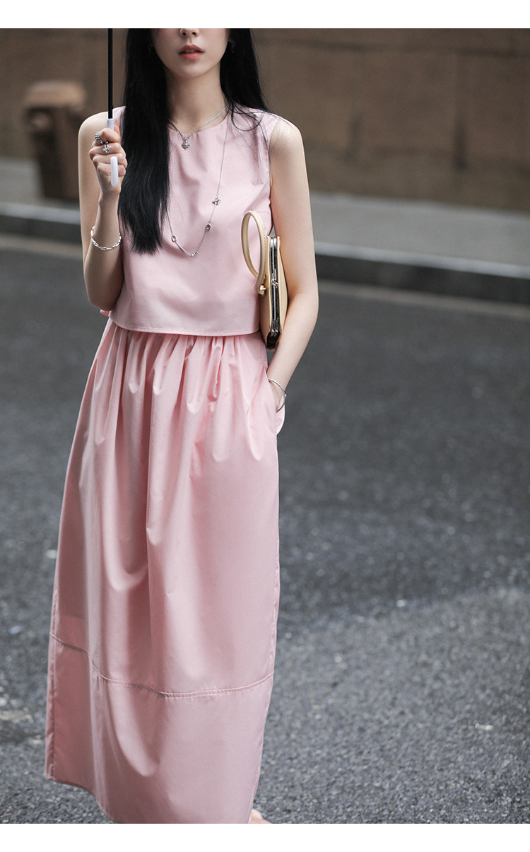 봄 여름 신상 스커트 패션 세트, 스트레이트 스커트, 한국 스타일 민소매 셔츠, 라운드넥 코튼 느낌의 구김 방지 탑 여성용