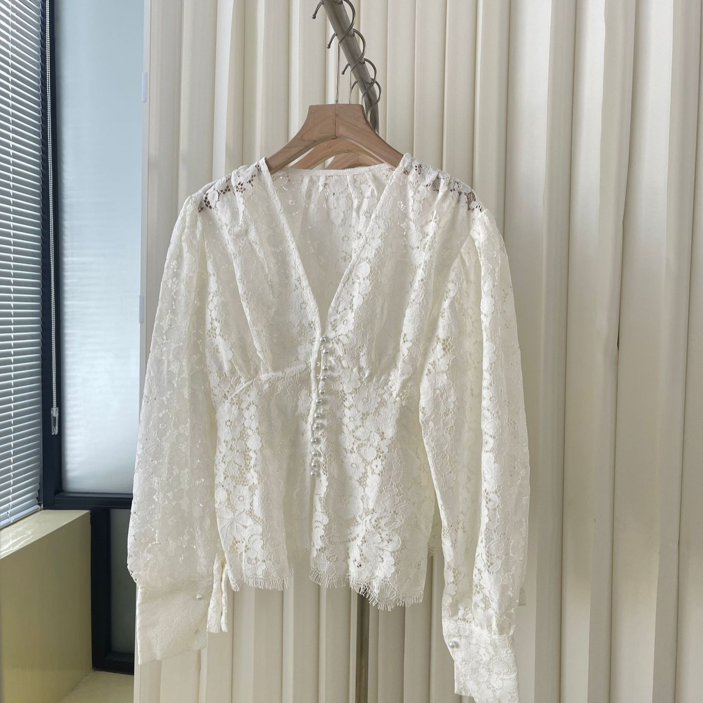 여름 여성 2023 새로운 달콤한 프랑스 로맨틱 얇은 V 칼라 레이스 스웨터/쉬폰스토어 가기