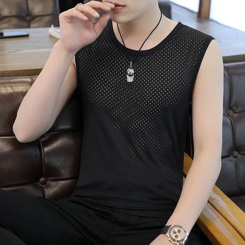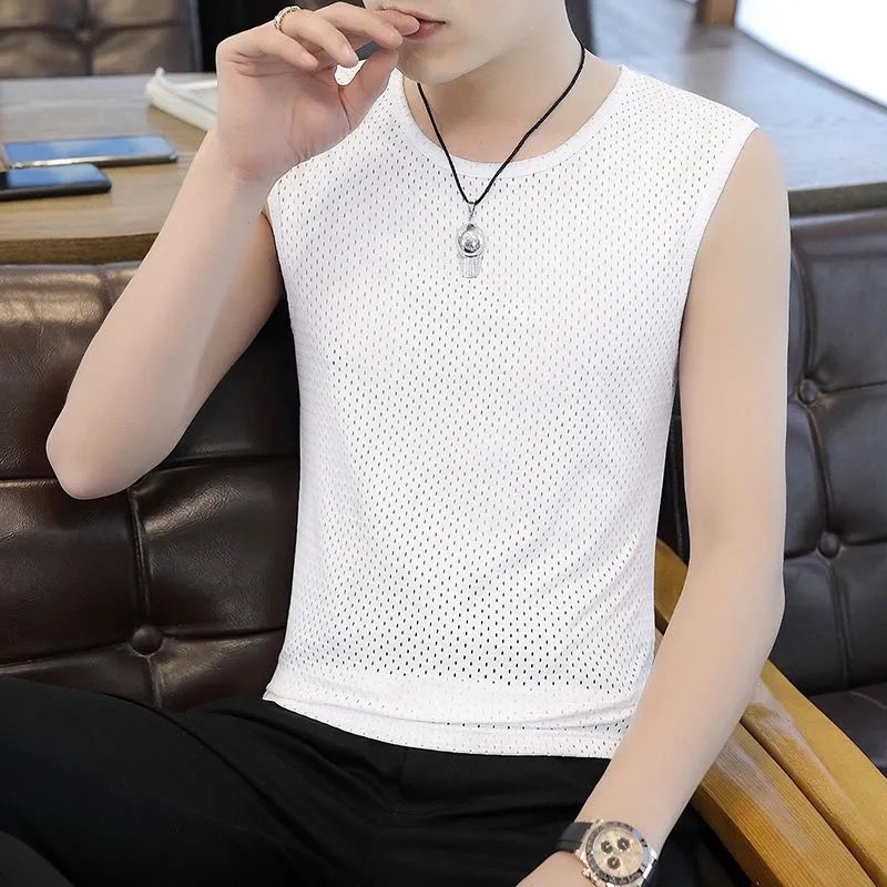여름 새로운 플러스 사이즈 메쉬 통기성 아이스 실크 조끼 남자의 라운드 넥 타이트 스포츠 민소매 티셔츠 조끼 유행 6스토어 가기