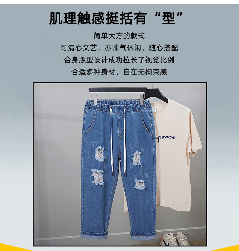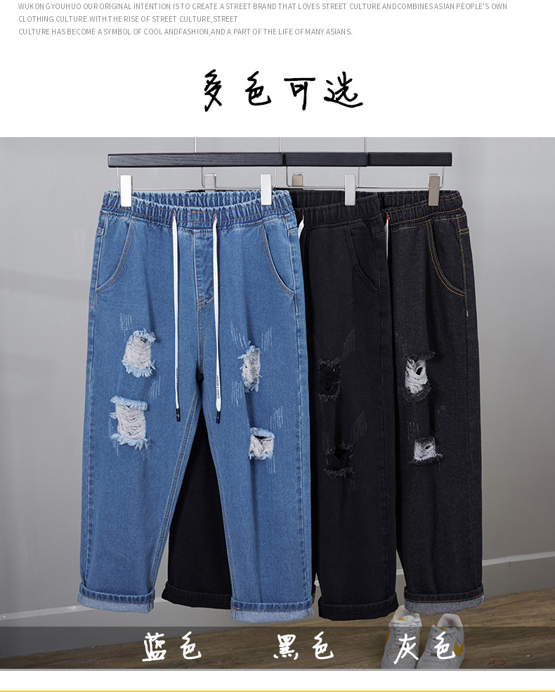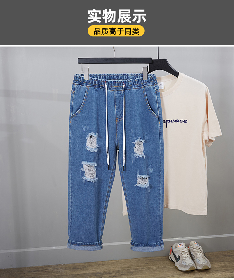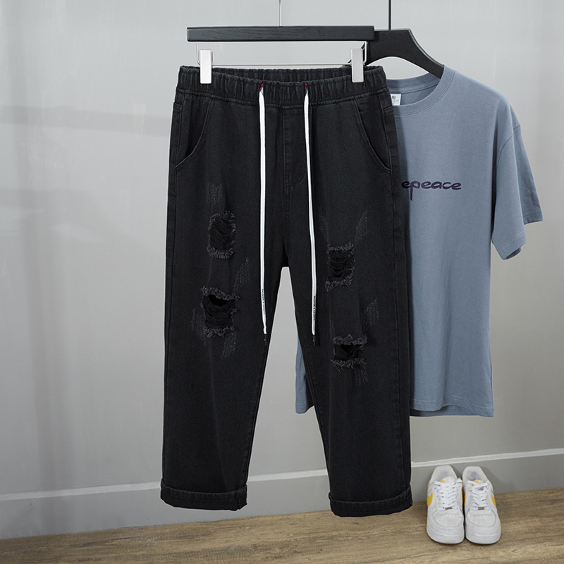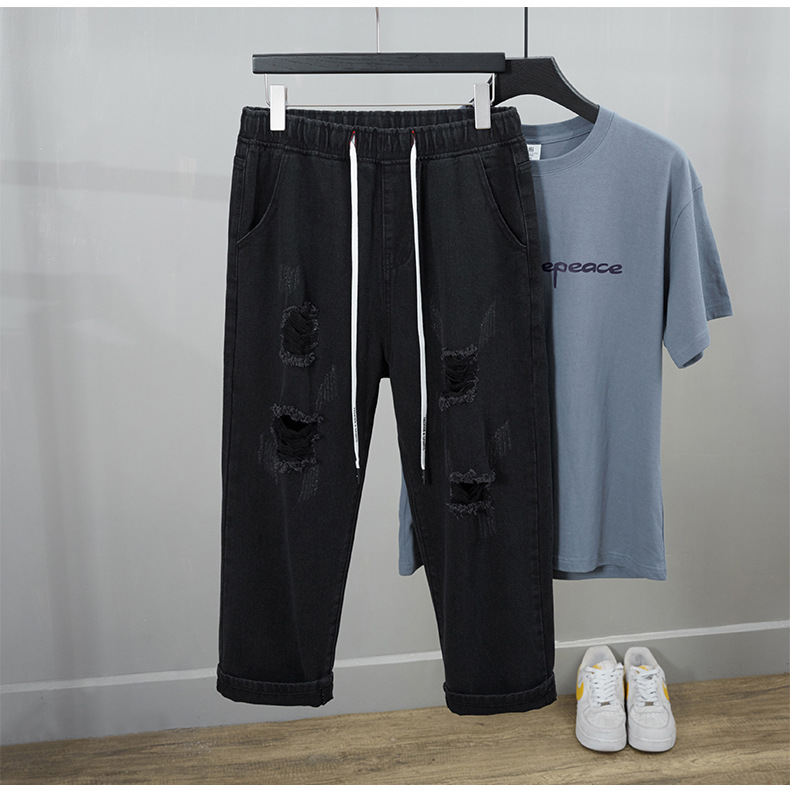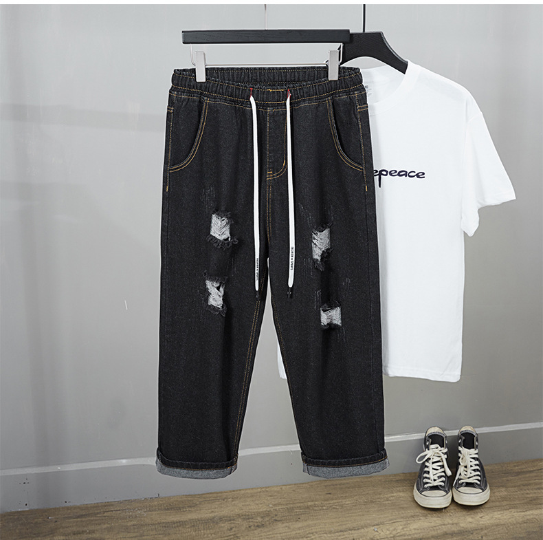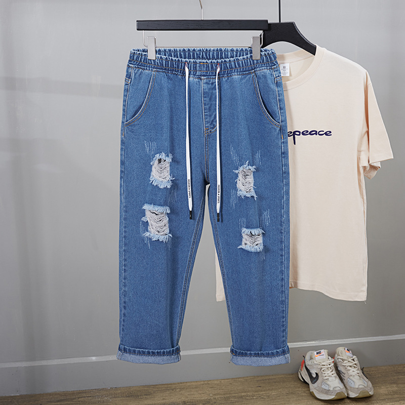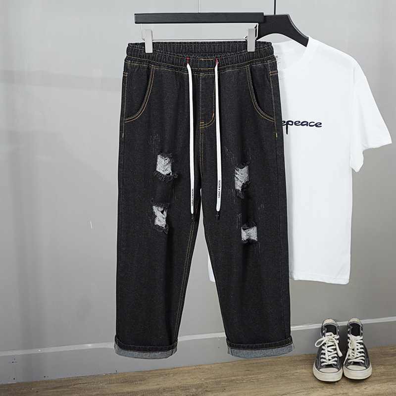 빅사이즈 남성용 레이스업 9부 데미지 진, 신축성 허리밴드, 플러스 사이즈, 루즈핏, 와이드 레그, 통통한 남성용 한국 스타일 바지스토어 가기
