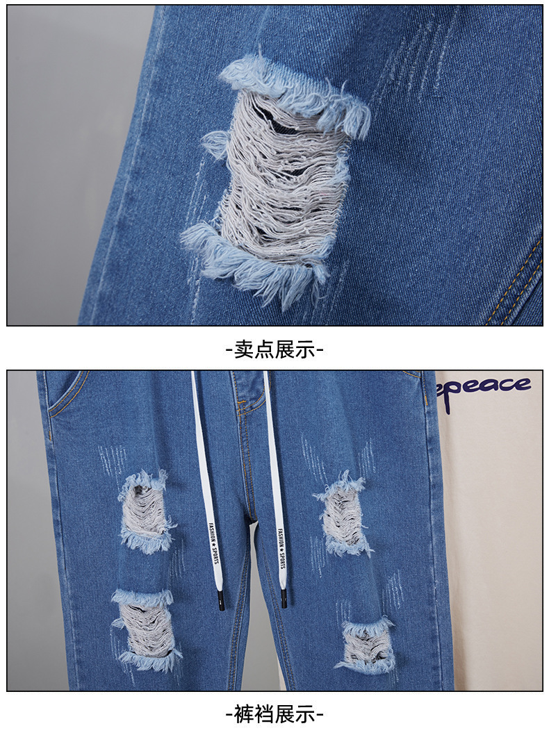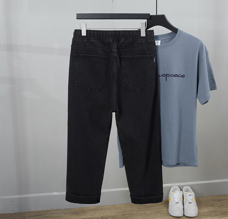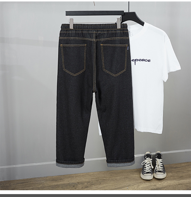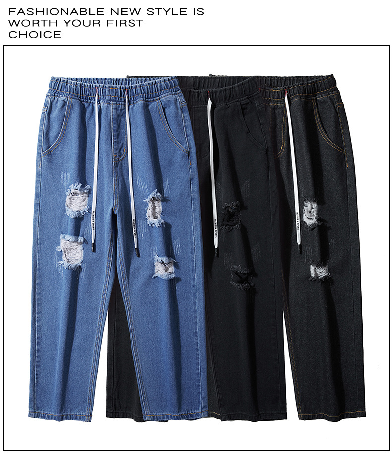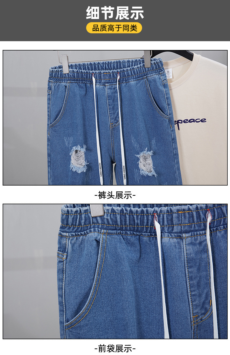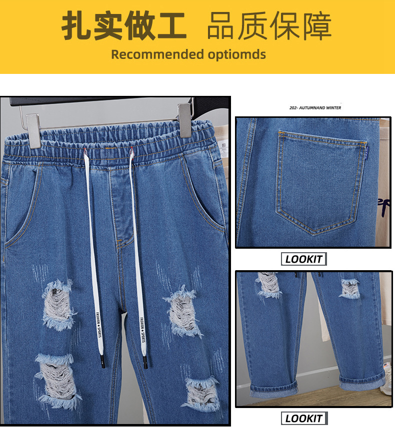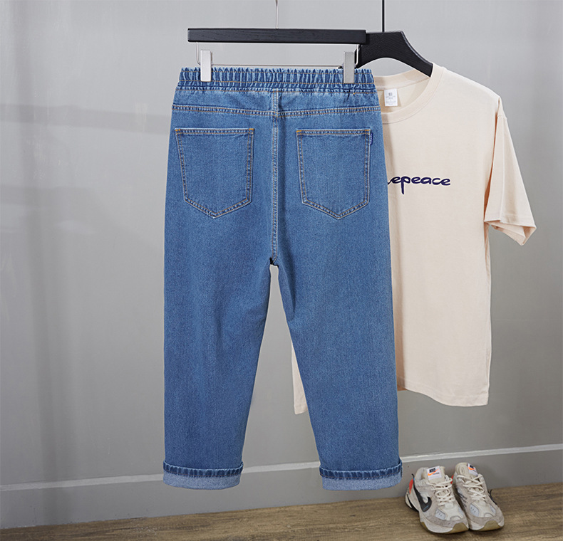 빅사이즈 남성용 레이스업 9부 데미지 진, 신축성 허리밴드, 플러스 사이즈, 루즈핏, 와이드 레그, 통통한 남성용 한국 스타일 바지스토어 가기