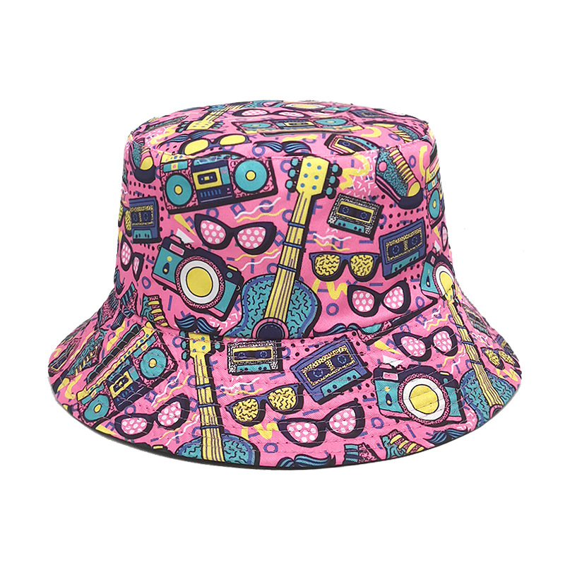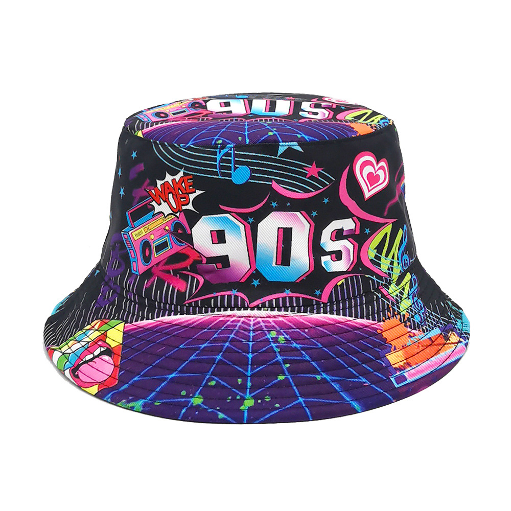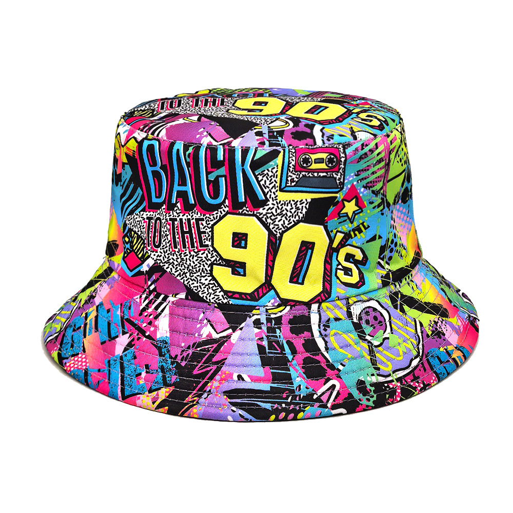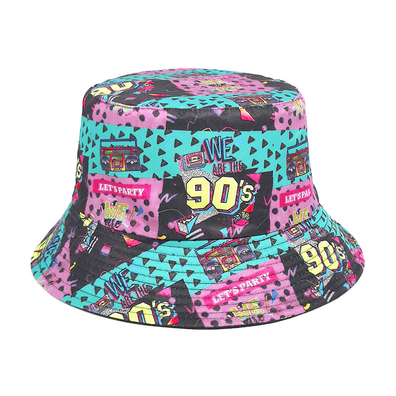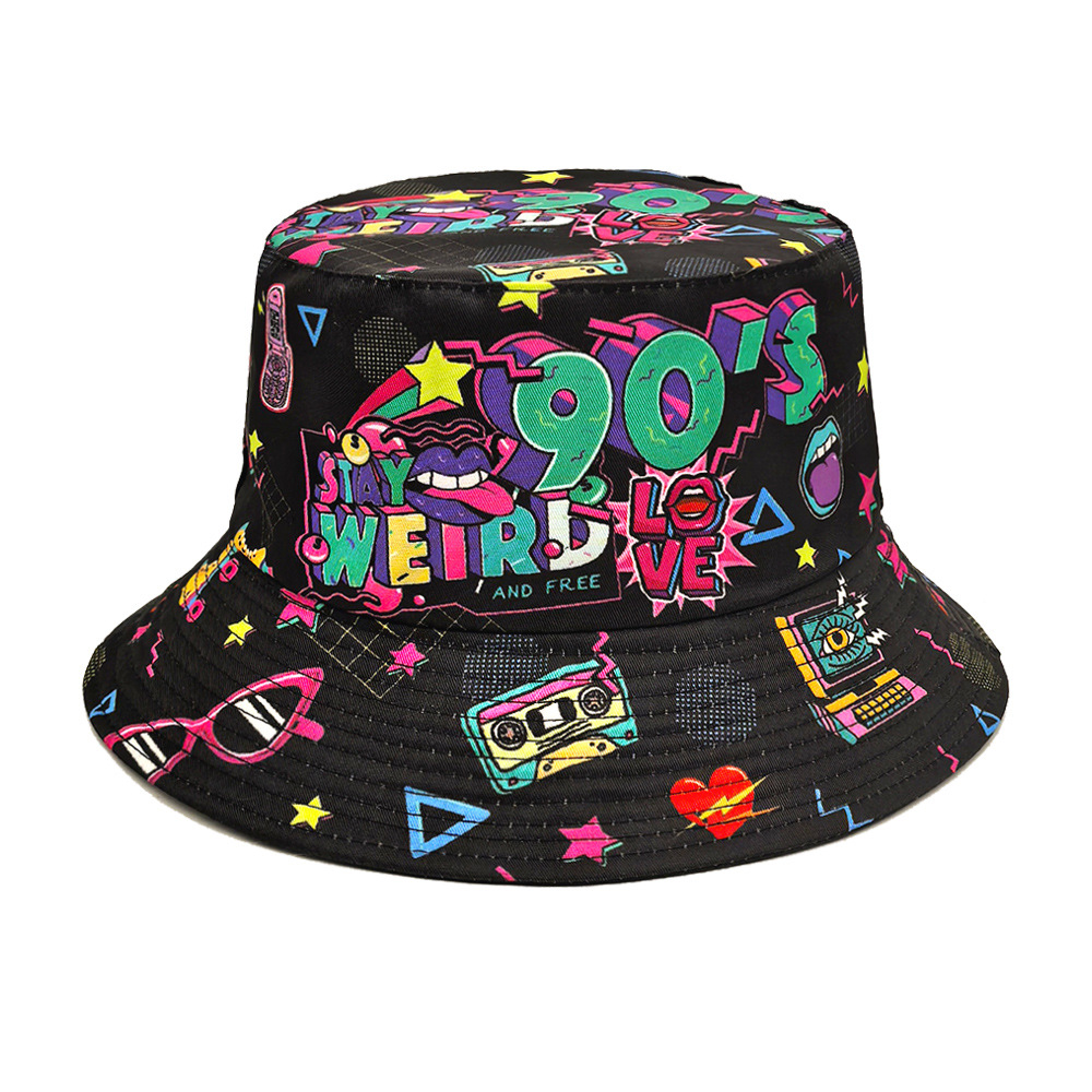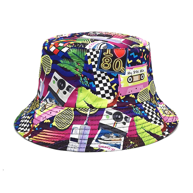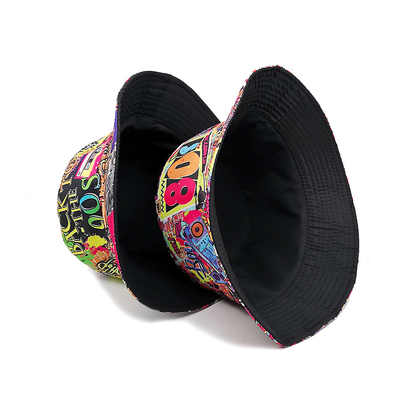 유럽과 미국 레트로 향수 80 년대 90 년대 테이프 패턴 어부 모자 여성용 양면 봄과 여름 남성용 야외 자외선 차단제 모자