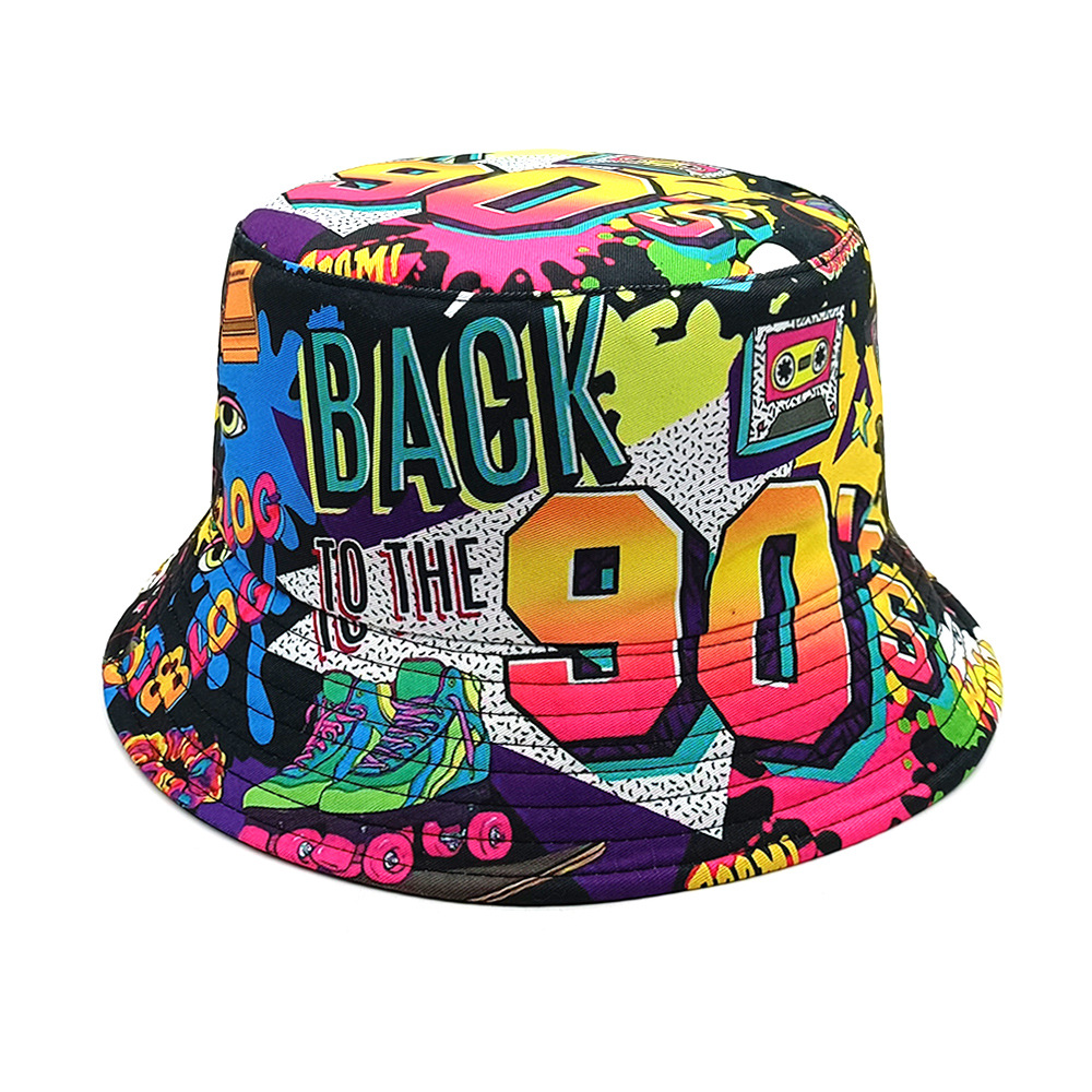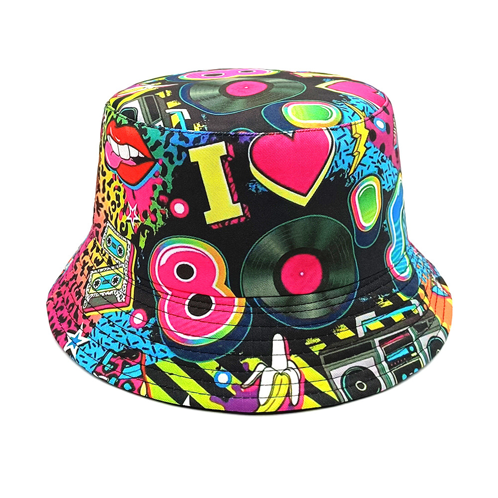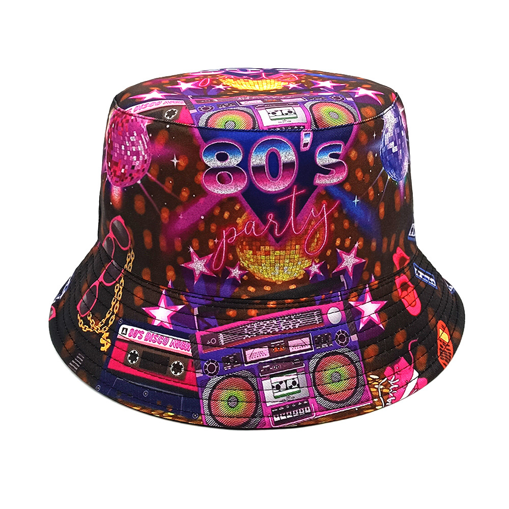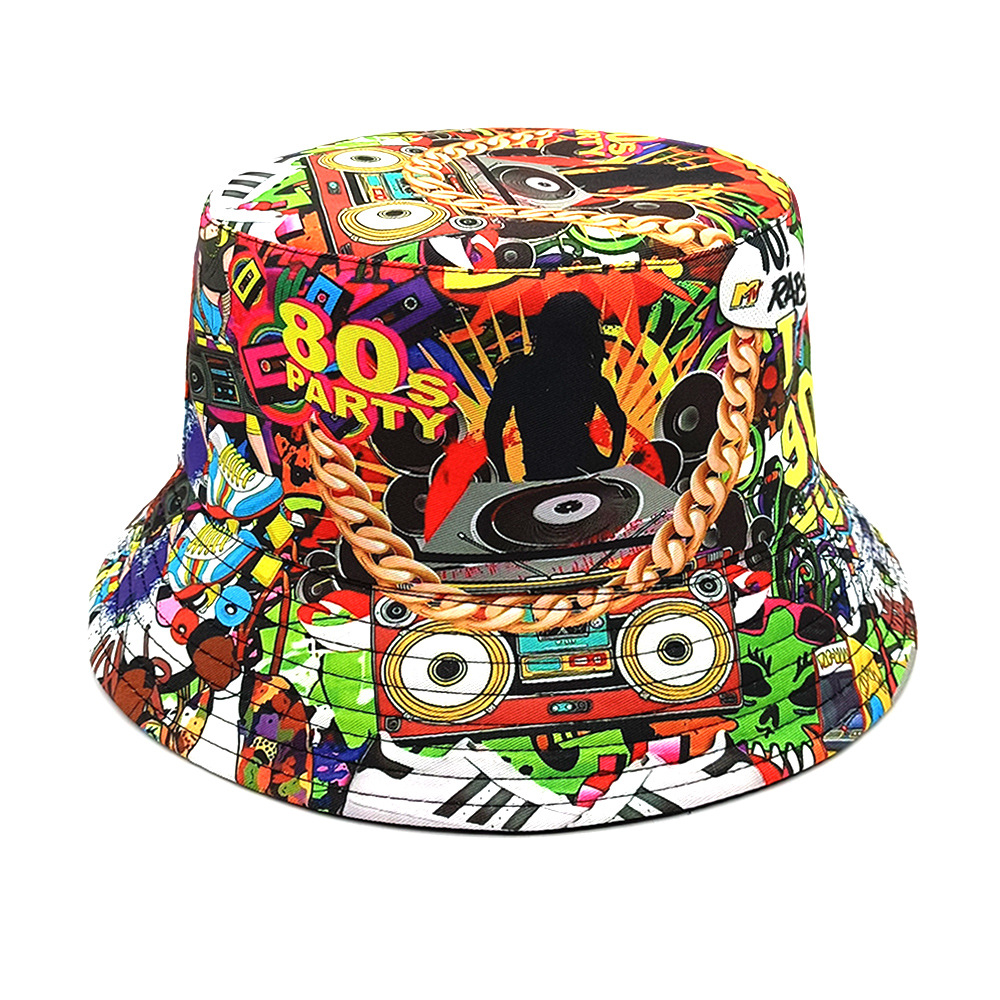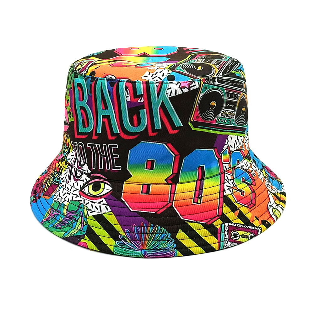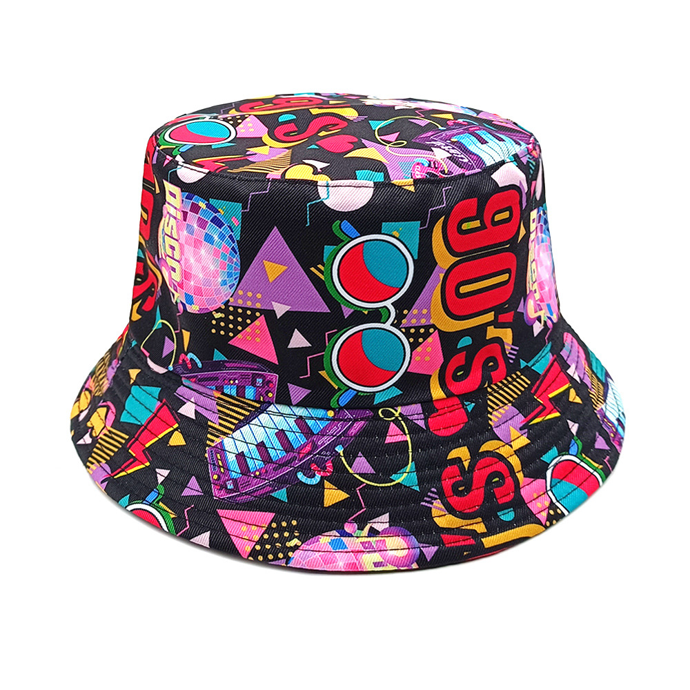 유럽과 미국 레트로 향수 80 년대 90 년대 테이프 패턴 어부 모자 여성용 양면 봄과 여름 남성용 야외 자외선 차단제 모자