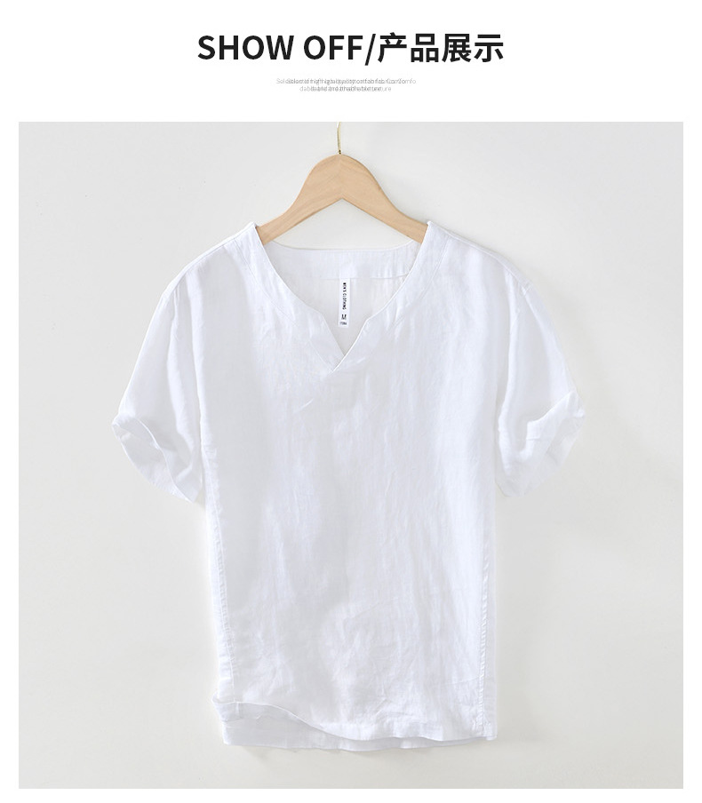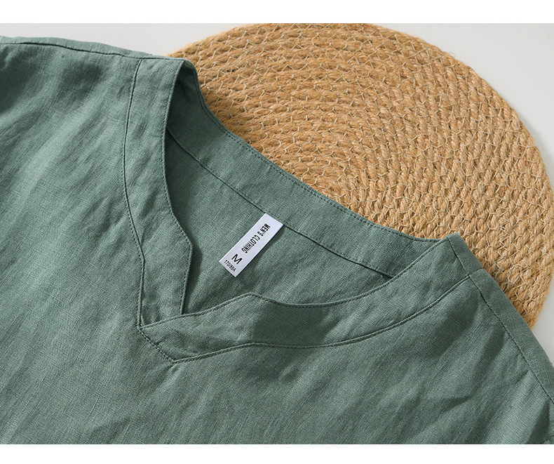 L998 중국 스타일 복고풍 우아한 린넨 단색 V-넥 반팔 티셔츠 남성용 독특한 심플 캐주얼 티셔츠 탑스토어 가기