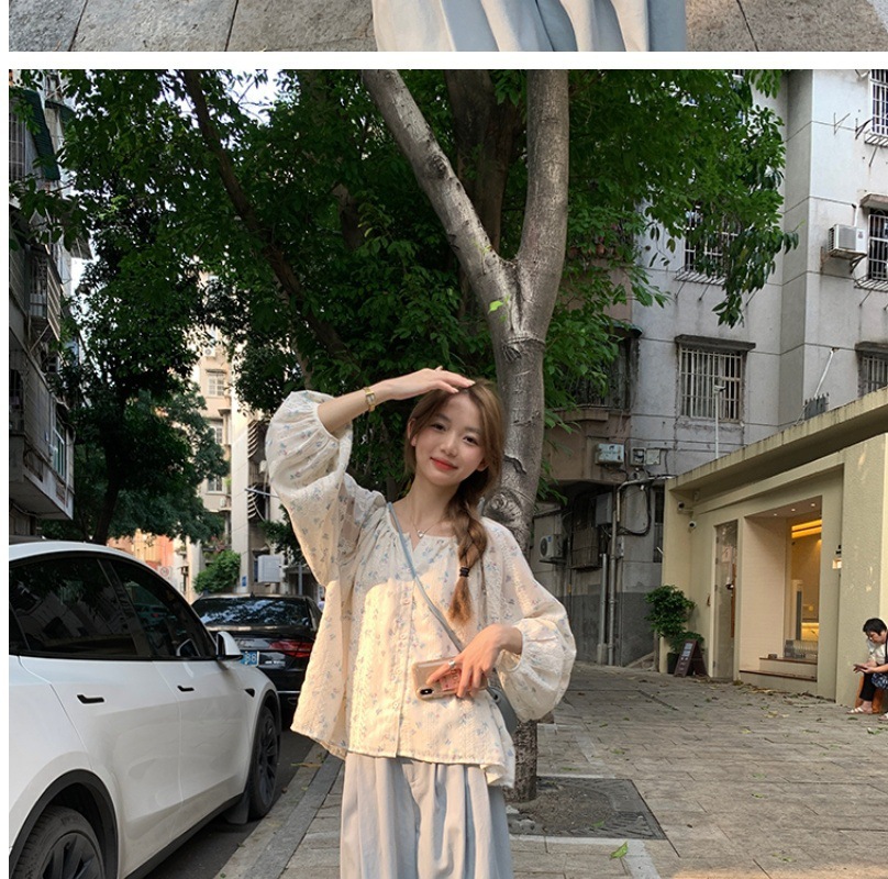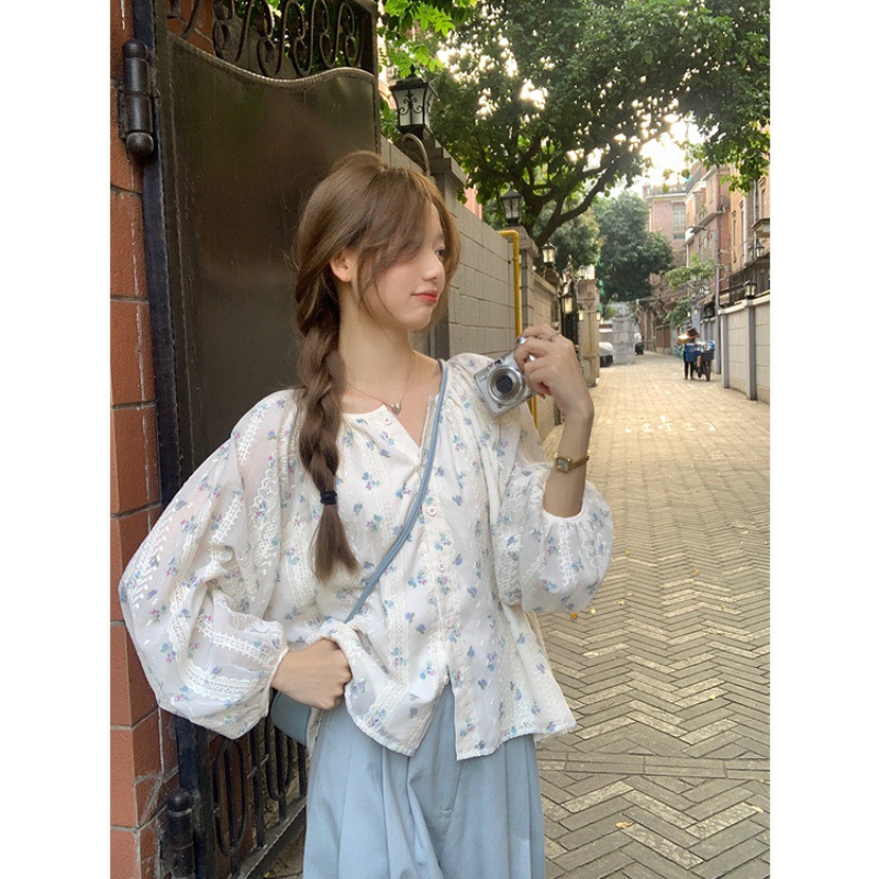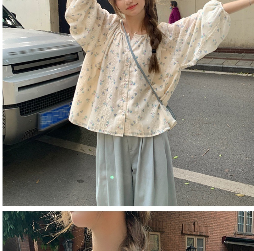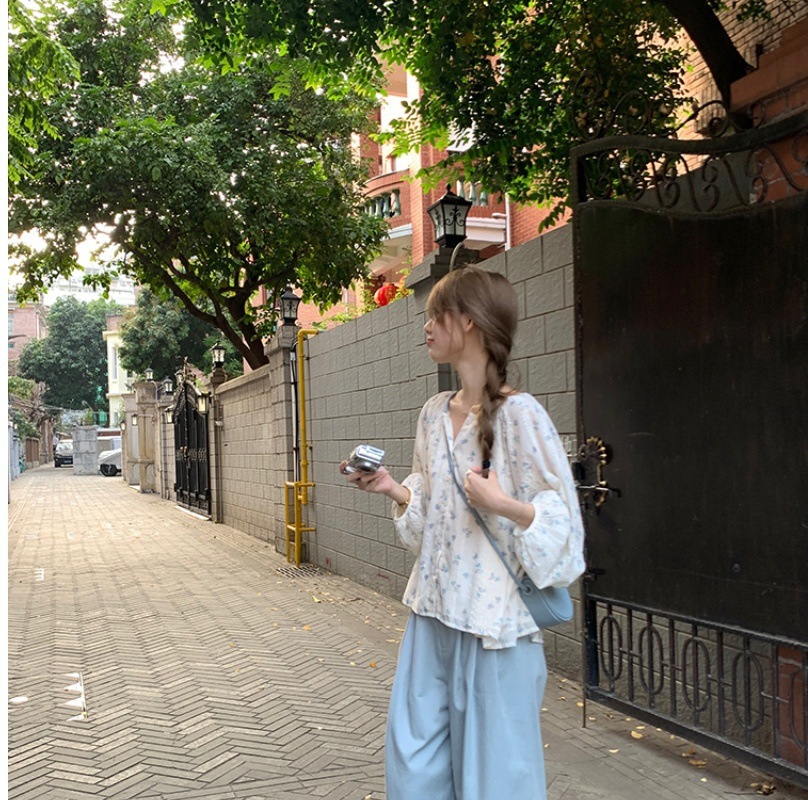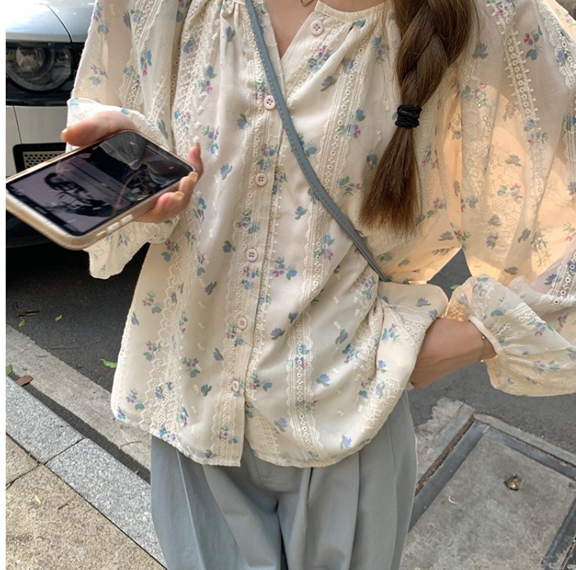 신선한 스타일 꽃 긴팔 셔츠 스몰 사이즈 느슨한 슬리밍 라운드 넥 달콤한 가리 스타일 올 매치 쉬폰 셔츠스토어 가기