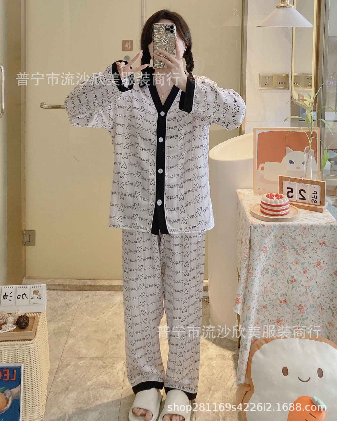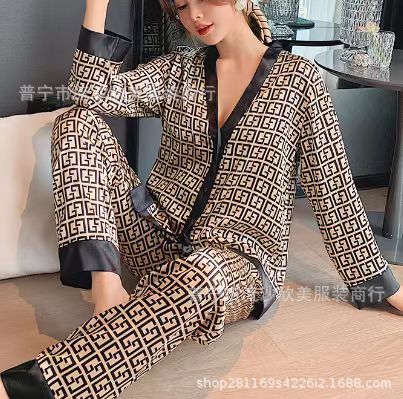 디자이너 잠옷 아이스 실크 잠옷 여자의 긴 소매 V-넥 카디건 모조 실크 옷깃 가정 옷 세트스토어 가기