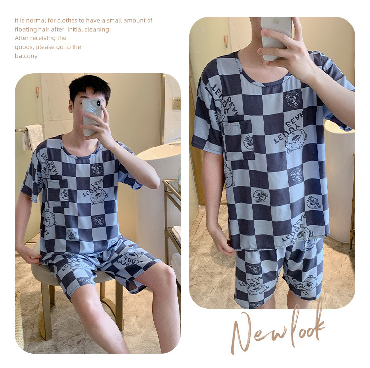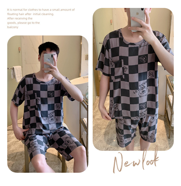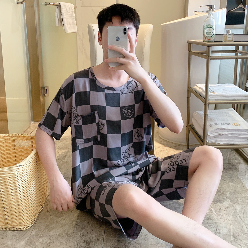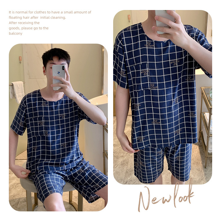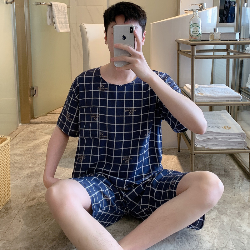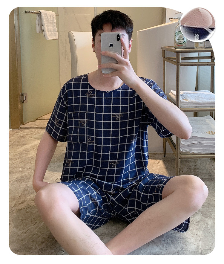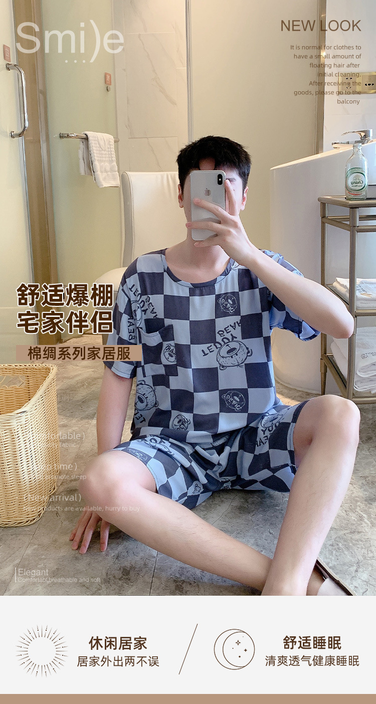 남성용 면 실크 잠옷 2025 새로운 면 실크 정장 반팔 여름 얇은 대형 격자 무늬 가정 의류 남성 스타일스토어 가기