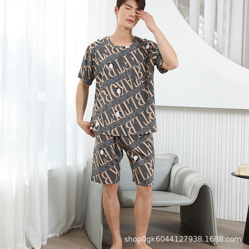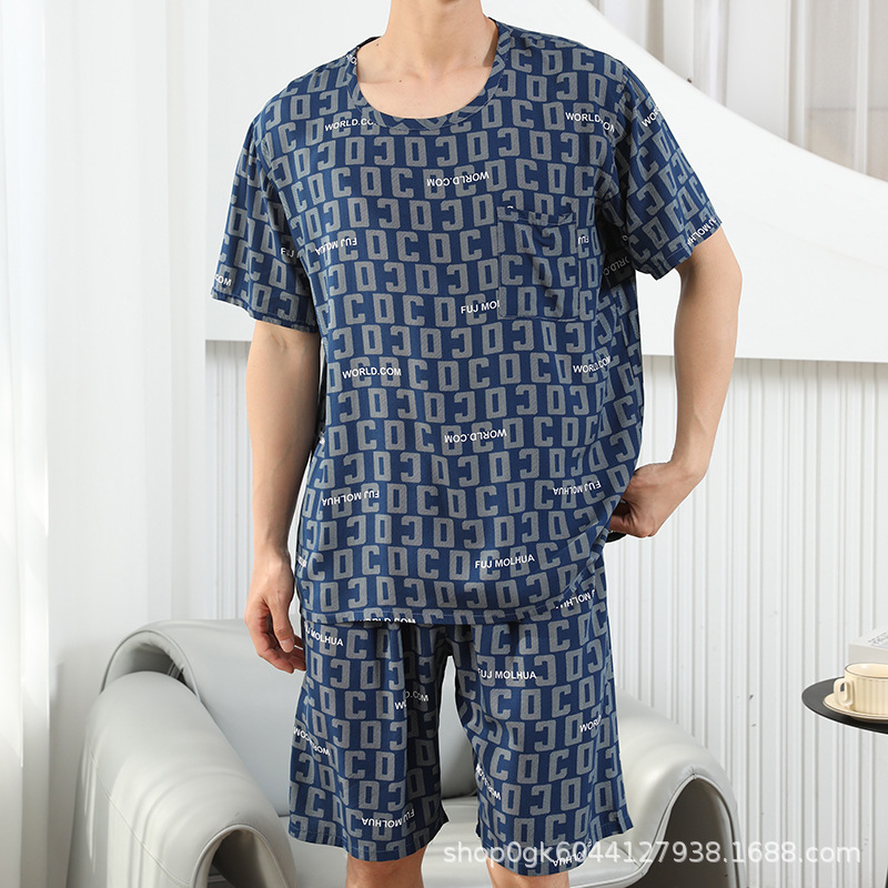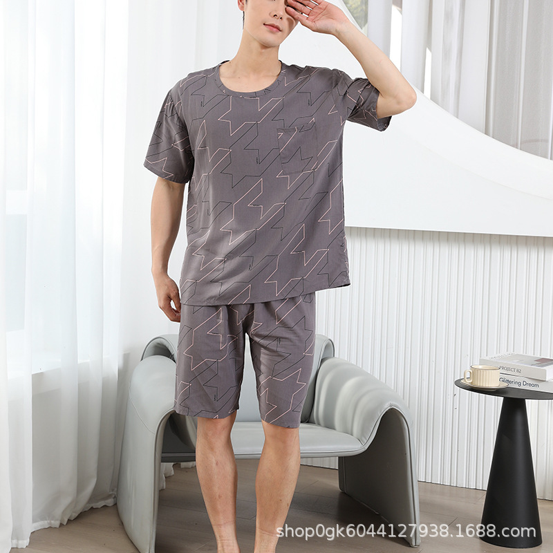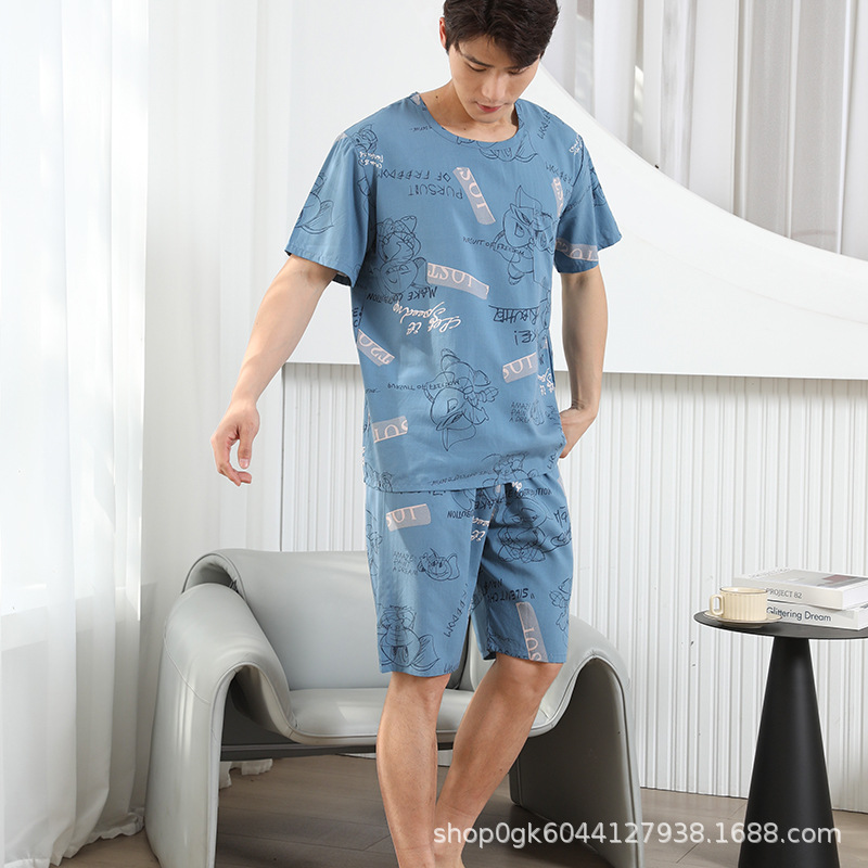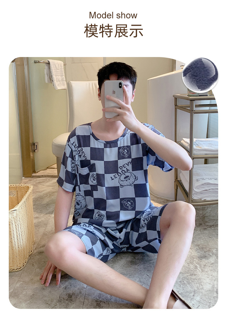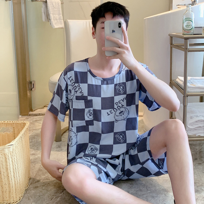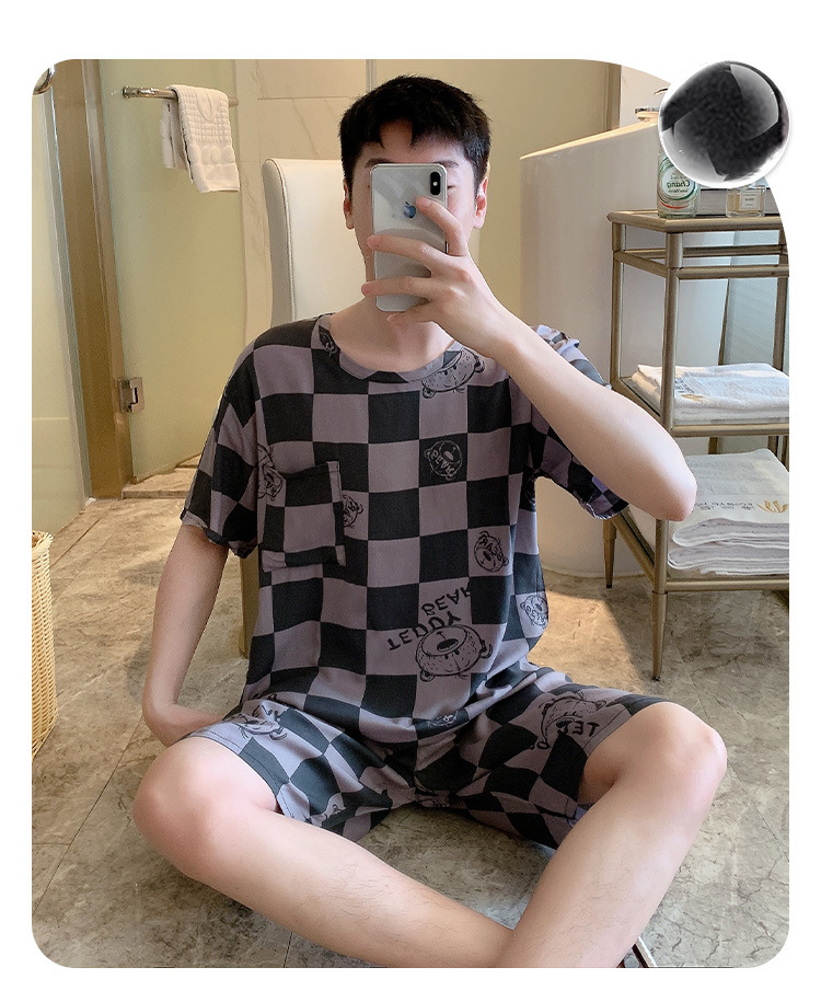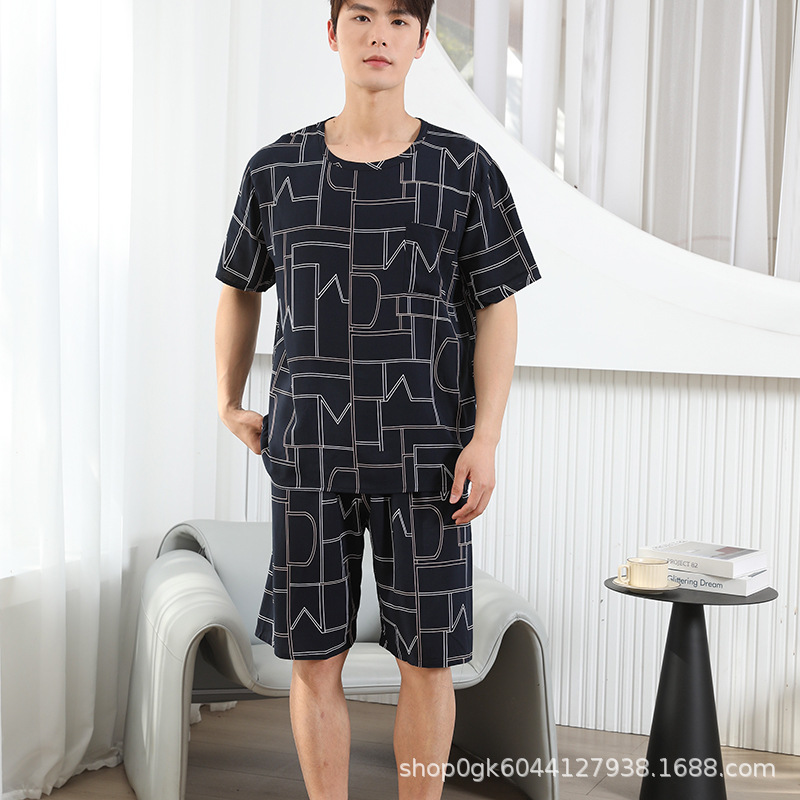 남성용 면 실크 잠옷 2025 새로운 면 실크 정장 반팔 여름 얇은 대형 격자 무늬 가정 의류 남성 스타일스토어 가기