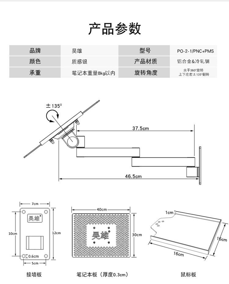 컴퓨터 랙을 지원하는 텔레스코픽 회전 산업용 장비 마우스 홀더가 있는 다기능 벽걸이 노트북 브래킷 암