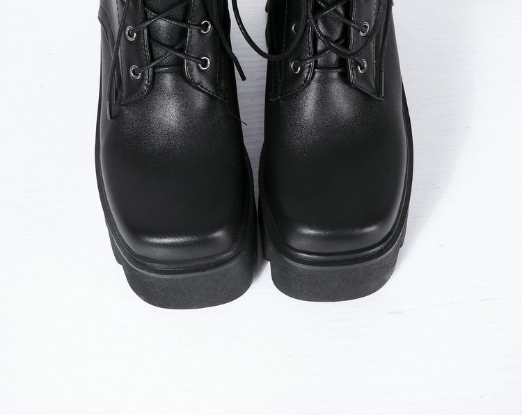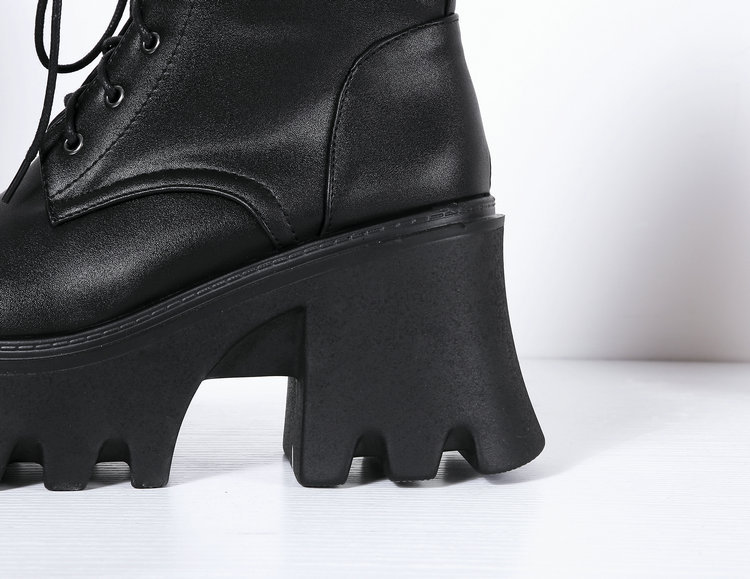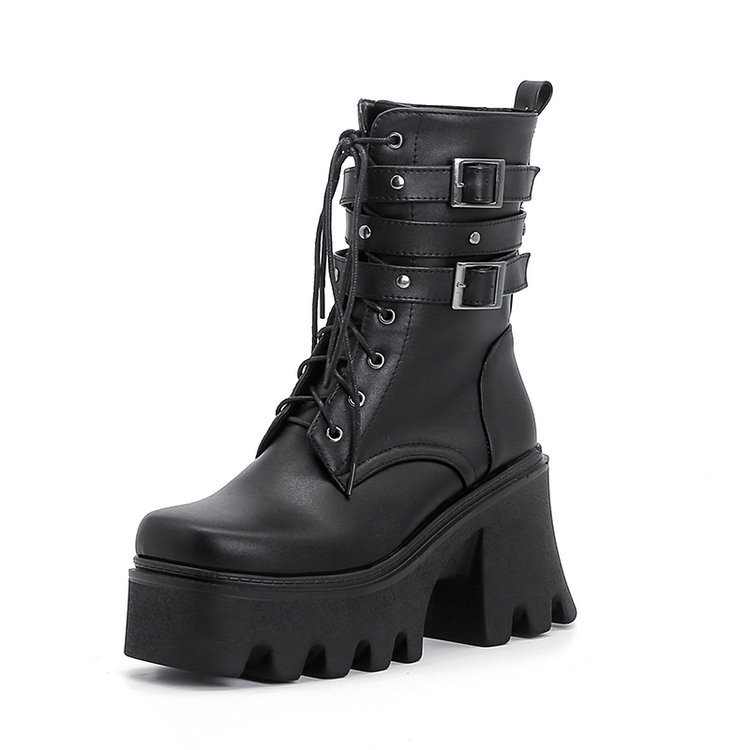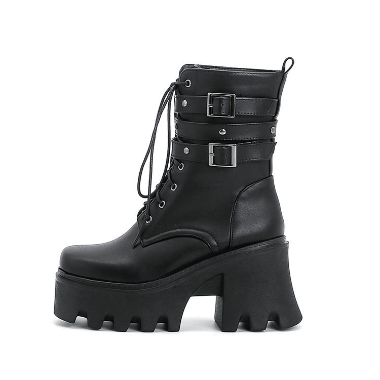 두꺼운 밑창 마틴 부츠 여성용 하이힐 앵클 부츠 두꺼운 굽 가을과 겨울 전면 레이스 업 앵클 부츠 벨트 버클 패션 여성 신발