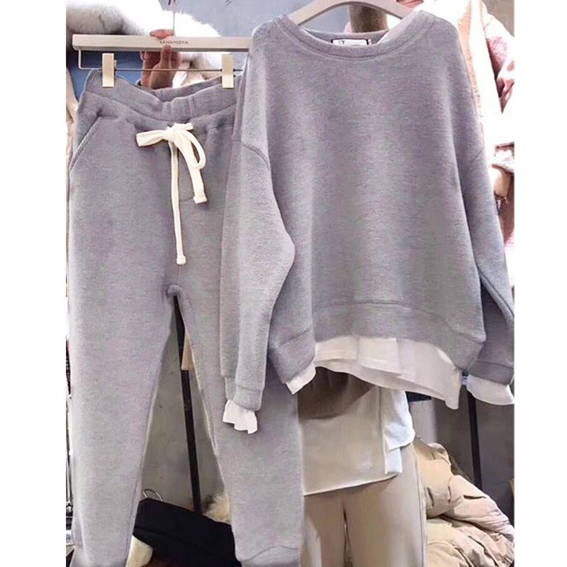 853#韩国东大门春秋薄款假两件拼接宽松卫衣女港味两件套装