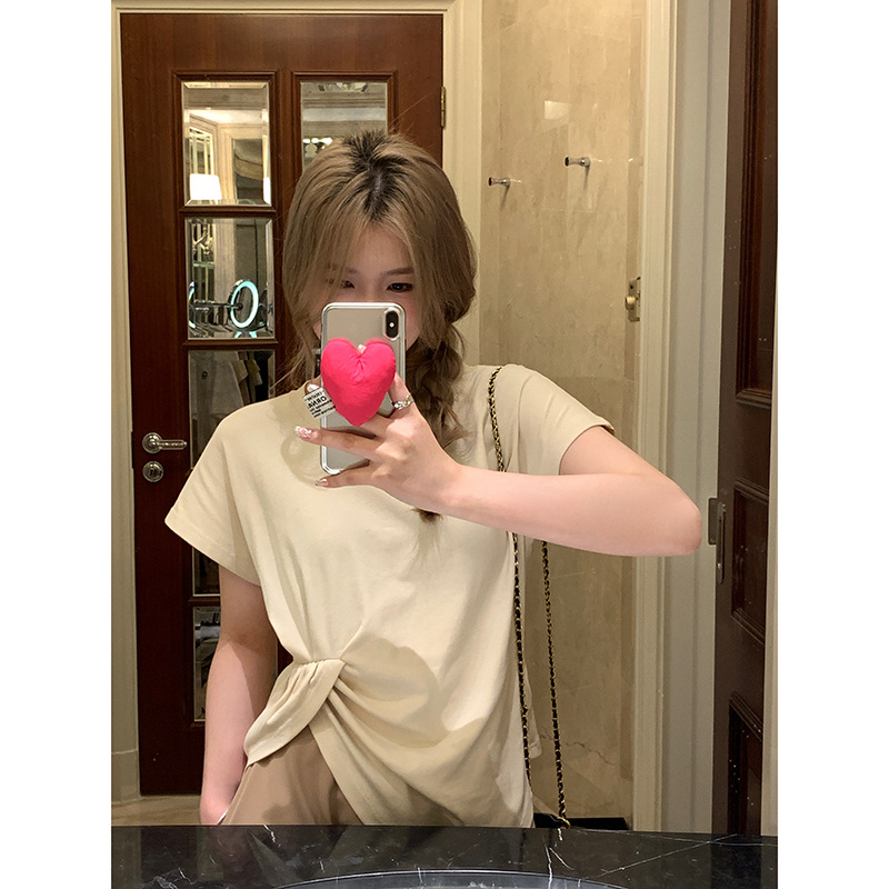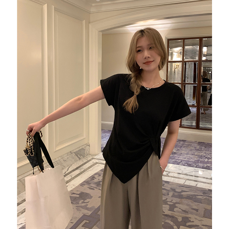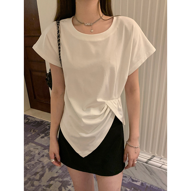 [디자이너 티셔츠] 불규칙한 주름 라운드 넥 반팔 티셔츠 여성 여름 새로운 느슨한 탑 X2722