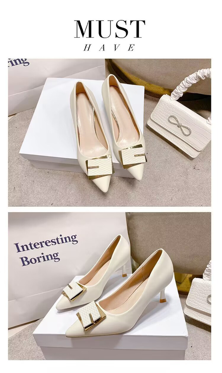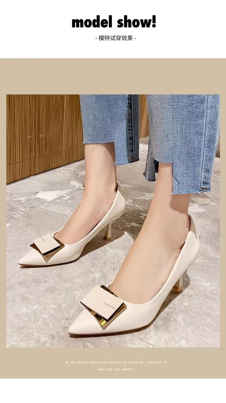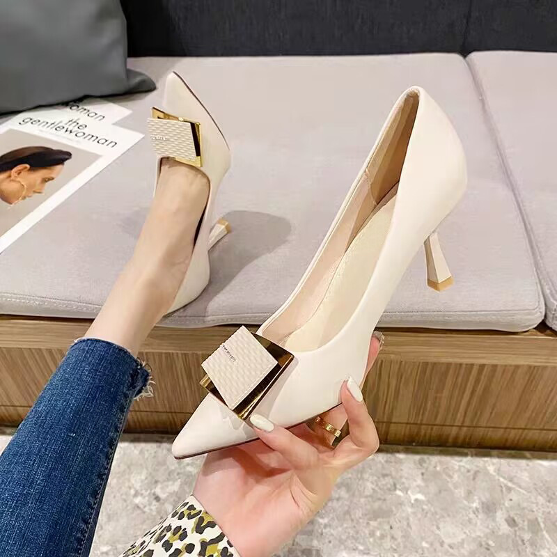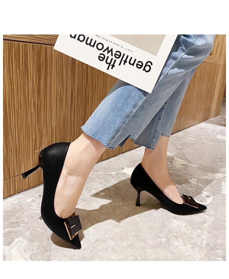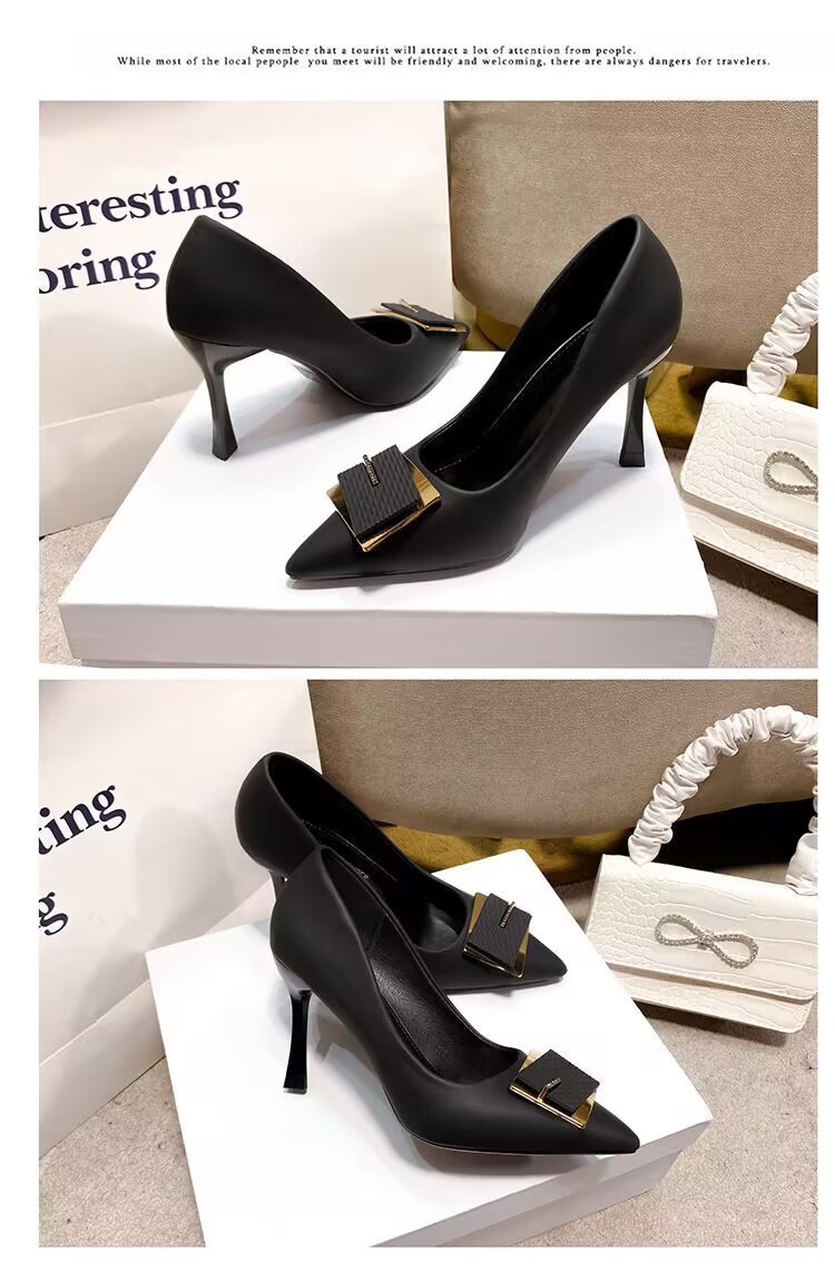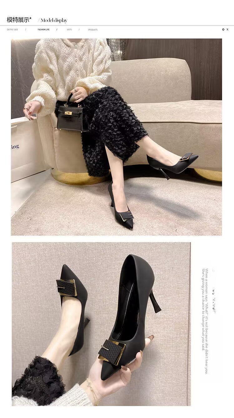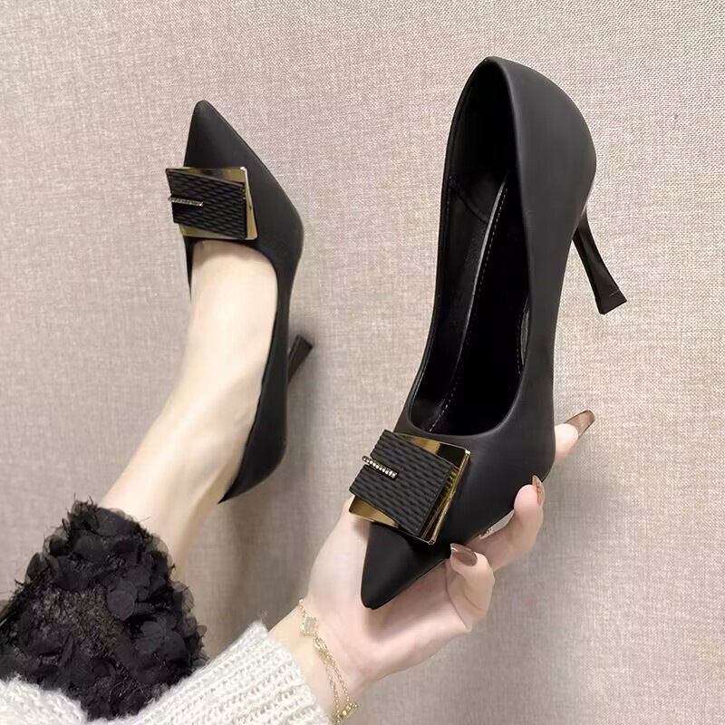 블랙 하이힐 여성용 봄/여름 2023 새로운 스퀘어 버클 디자인 틈새 우아한 뾰족한 스틸레토 힐 얕은 입 싱글 슈즈스토어 가기